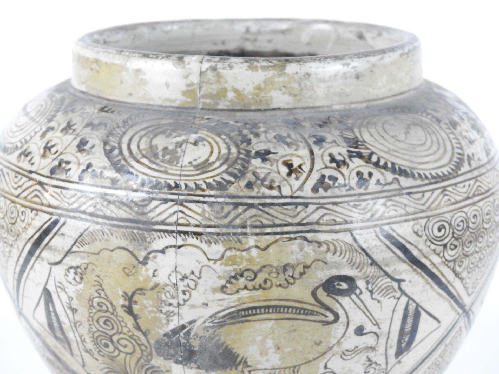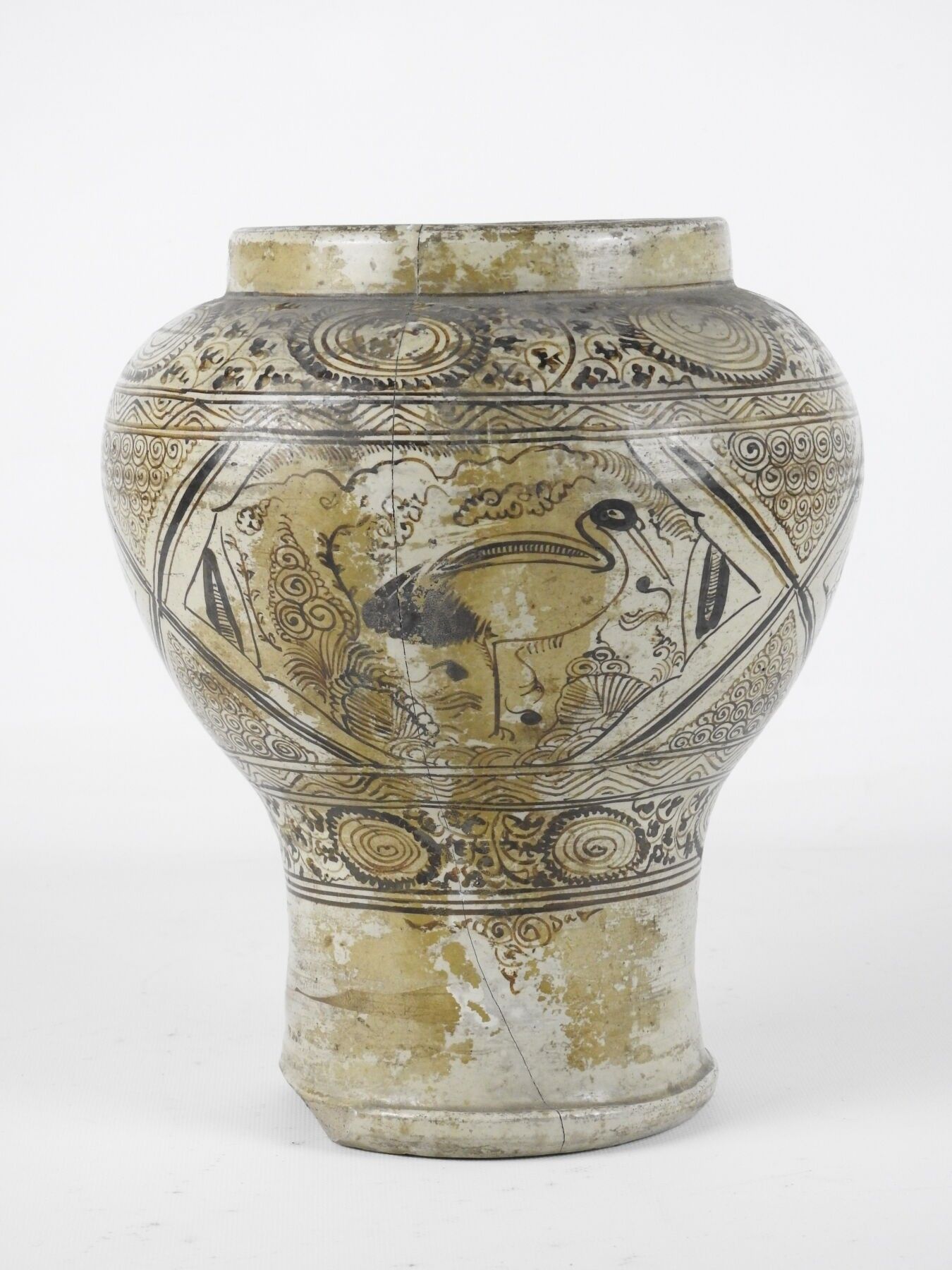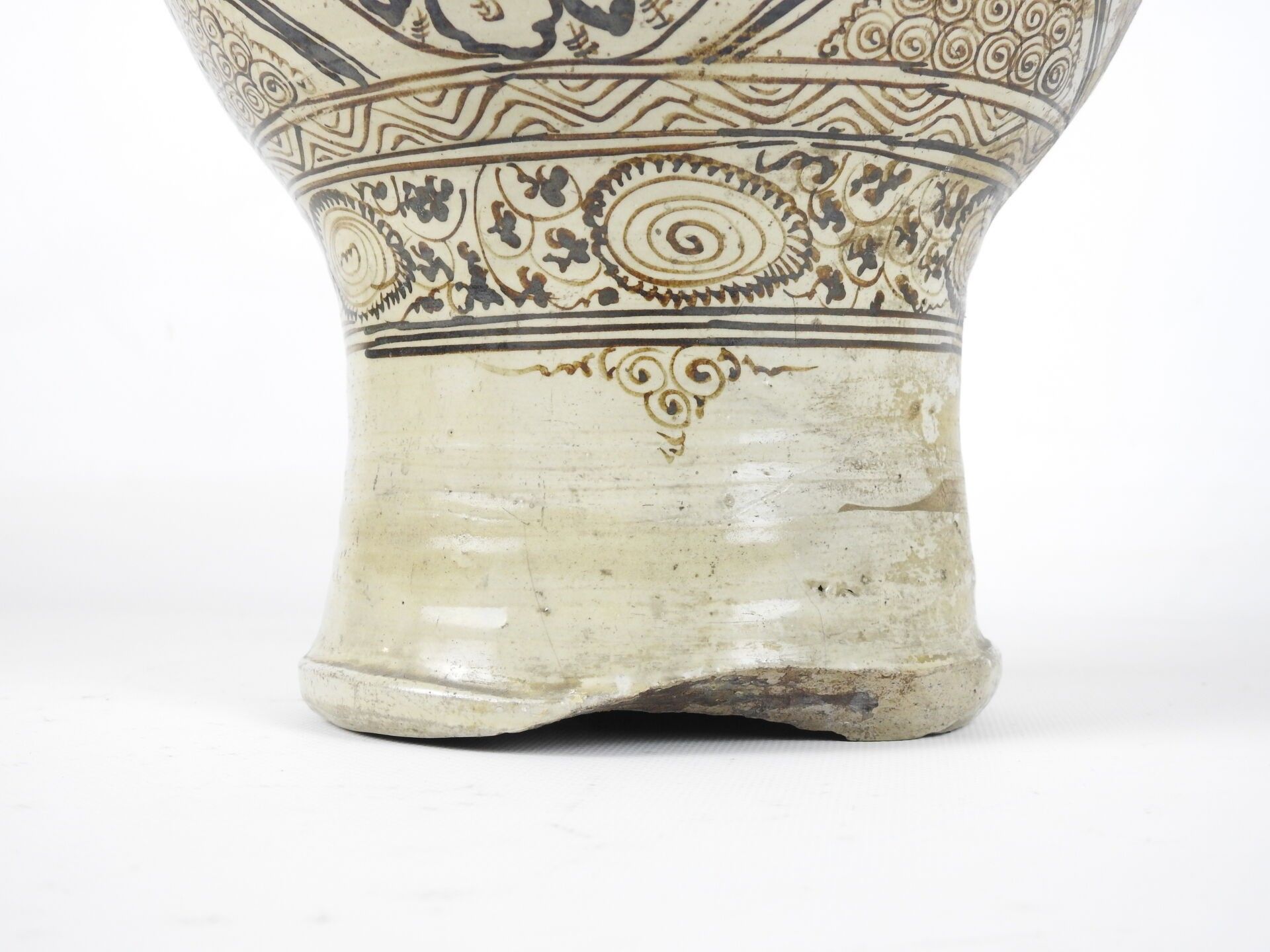 A Cizhou stoneware vase of Meiping form, the body decorated in black slip on a cream ground with rabbits, birds and human figures in four-lobed reserves standing out against a background of dense swirls.