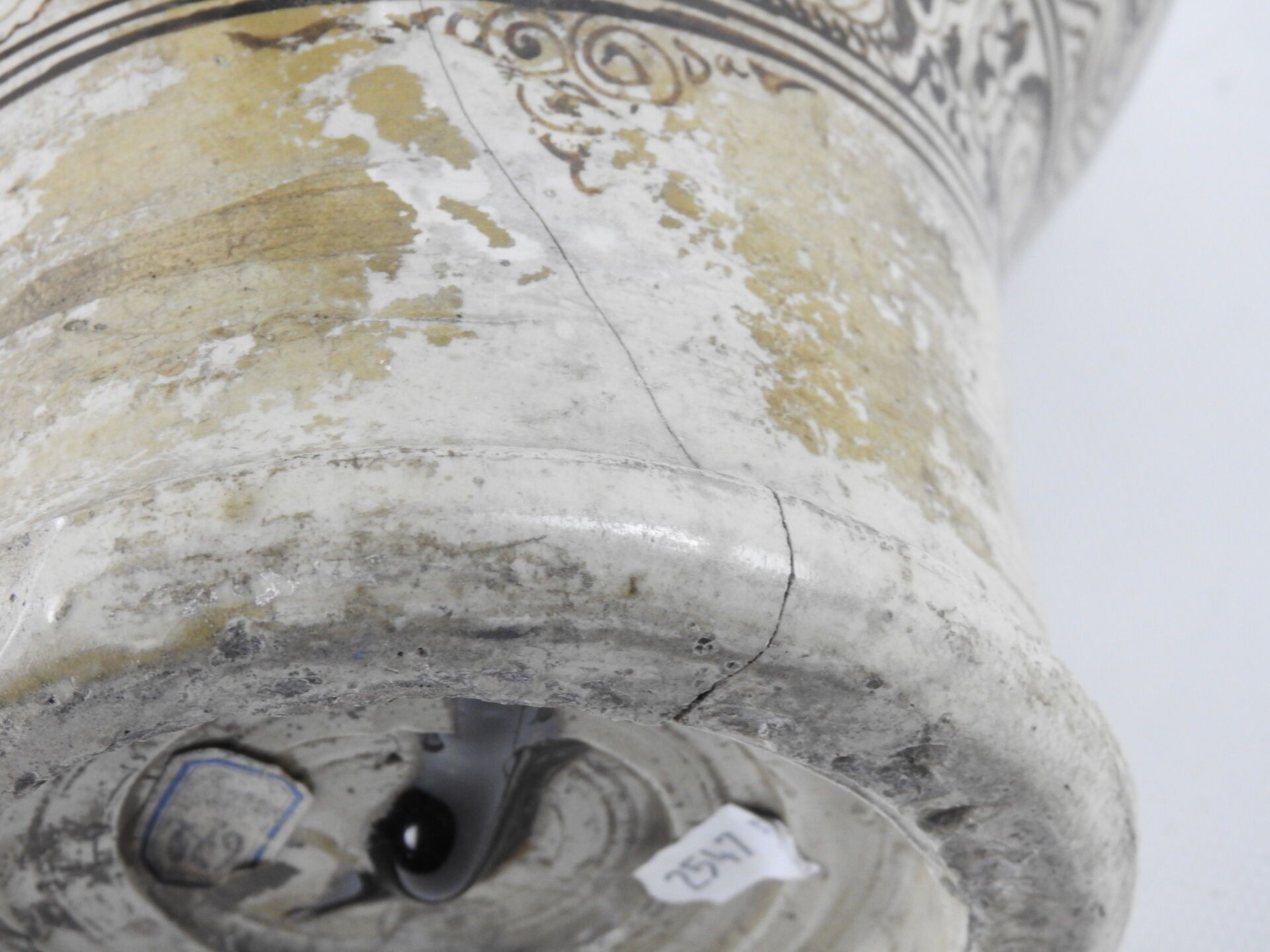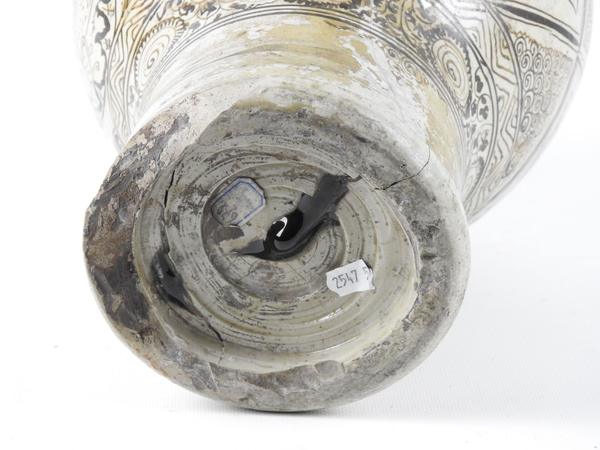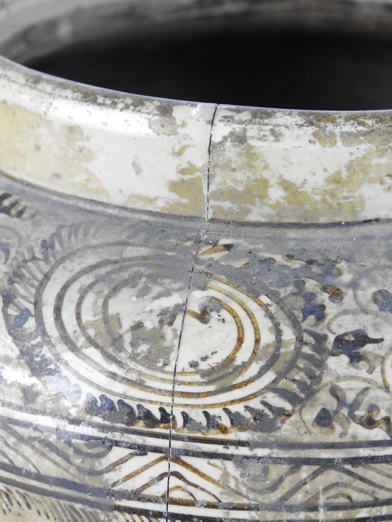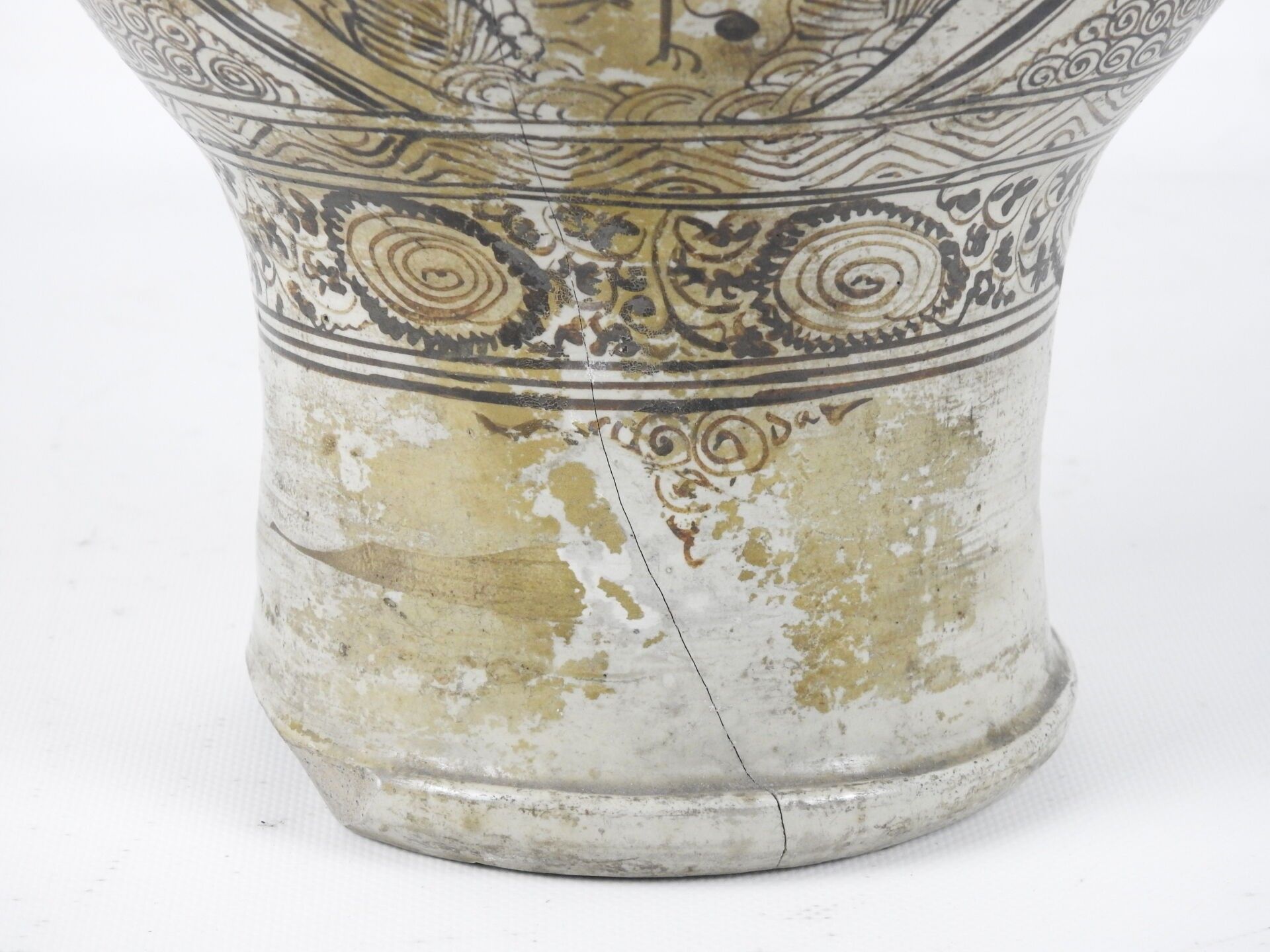 A Cizhou stoneware vase of Meiping form, the body decorated in black slip on a cream ground with rabbits, birds and human figures in four-lobed reserves standing out against a background of dense swirls.