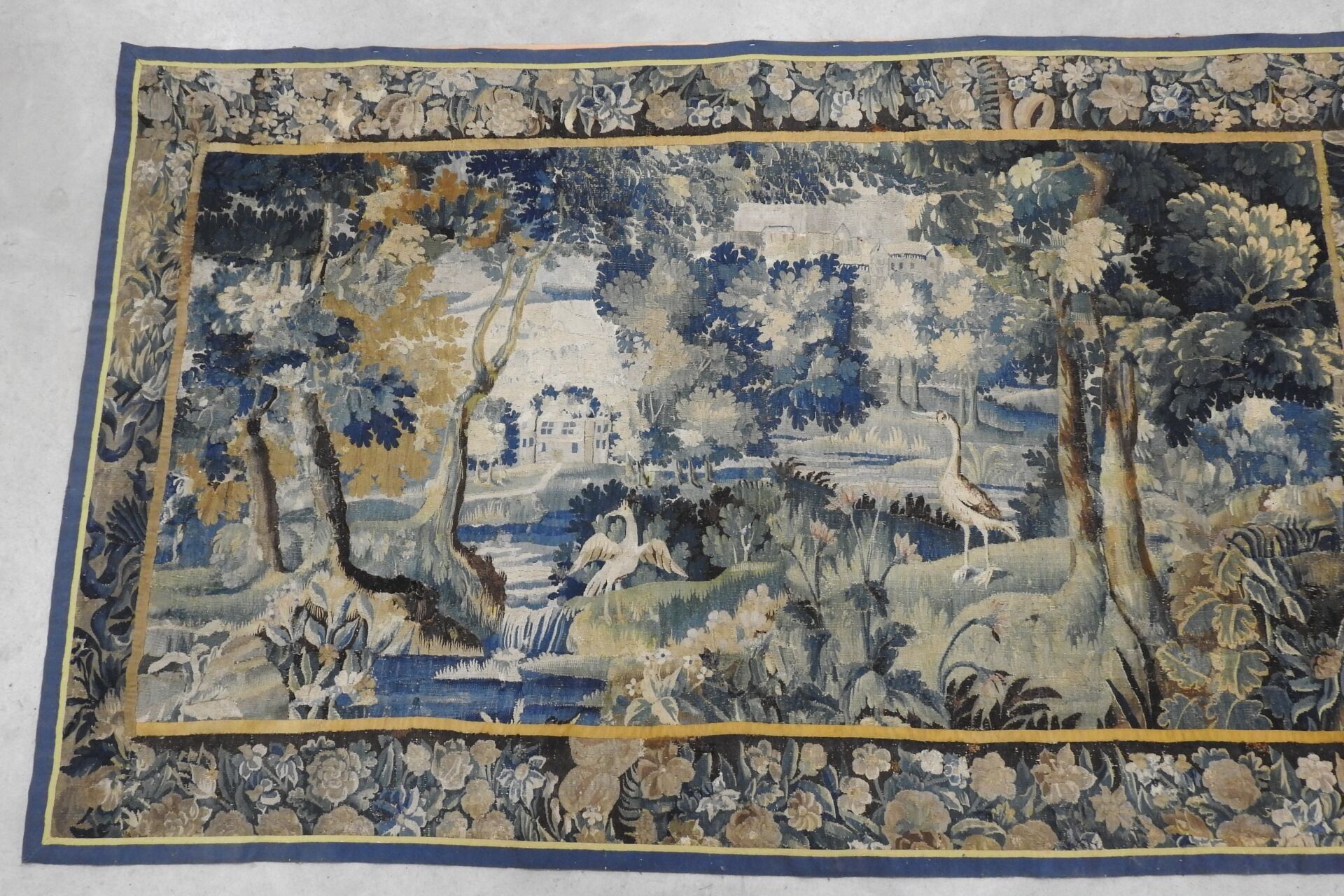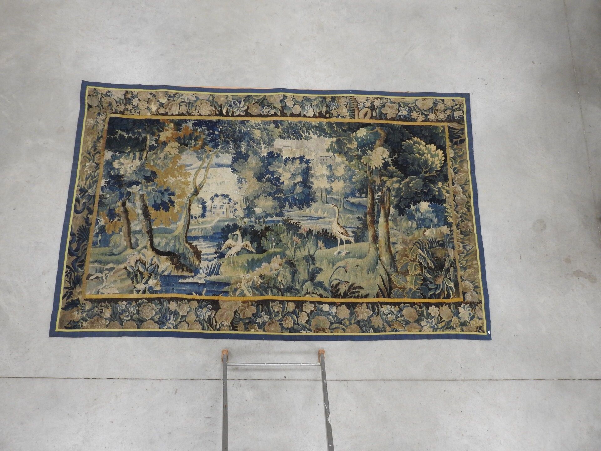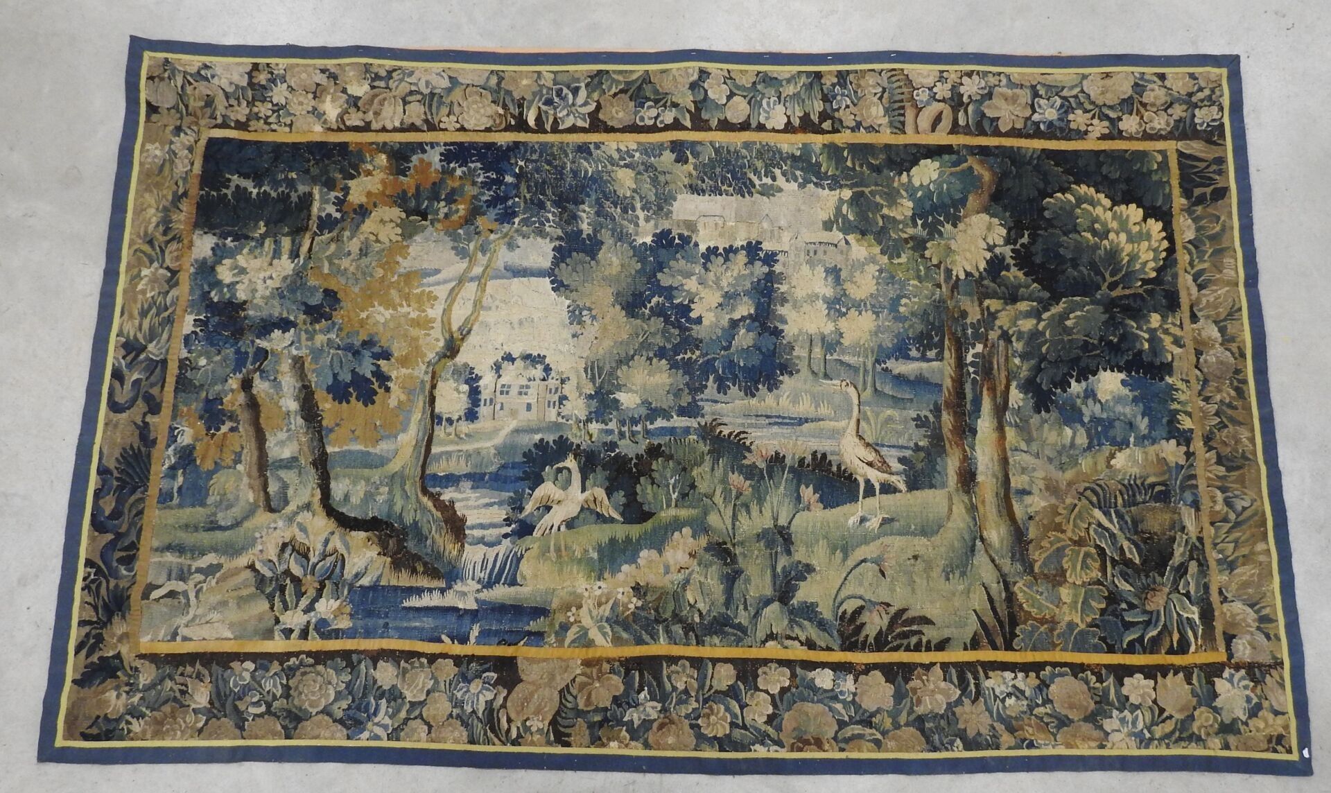 AUBUSSON : Wool tapestry called "Verdure aux volatiles" on a castle background. 18th century. 170 x 265 cm.
