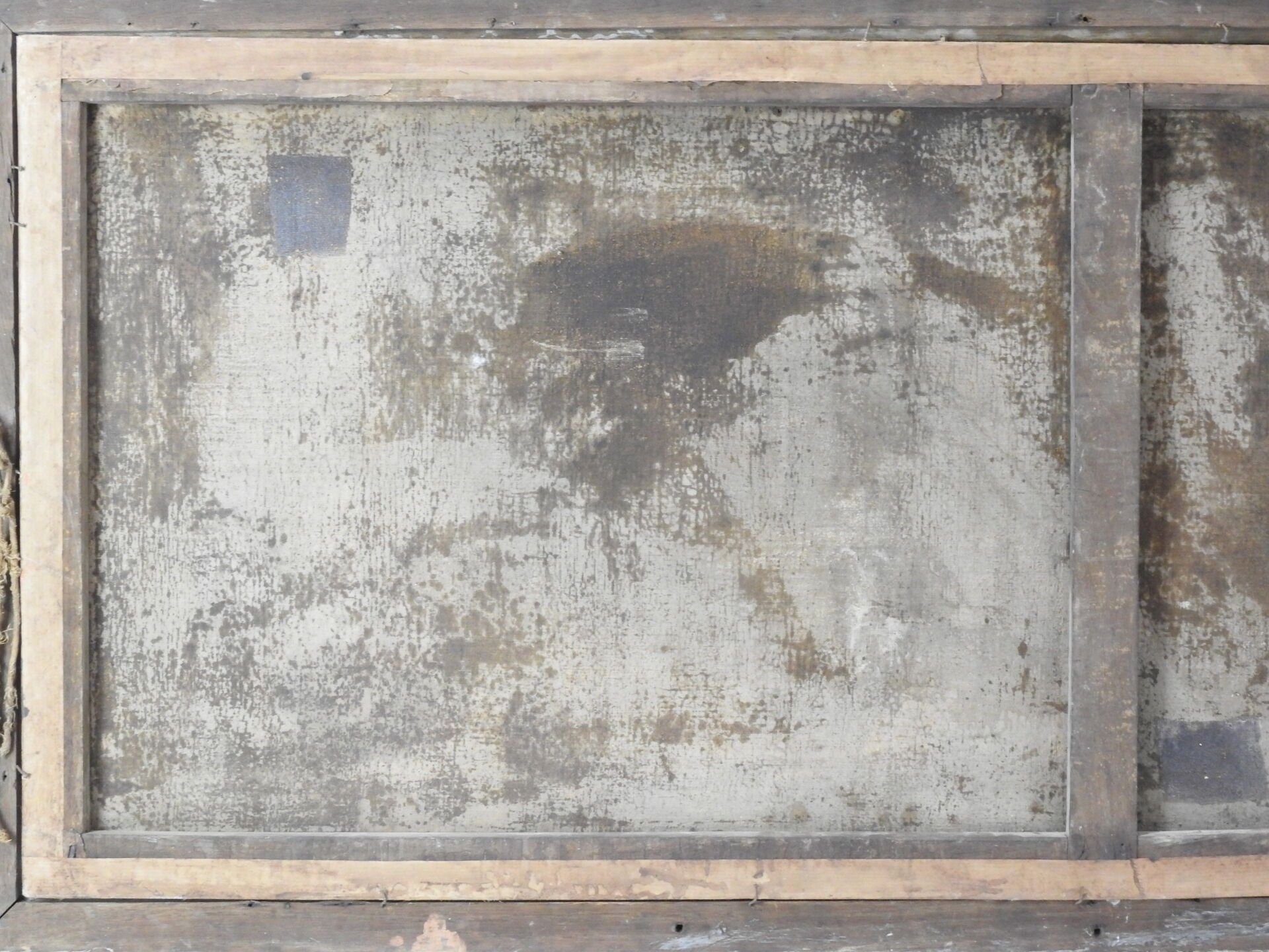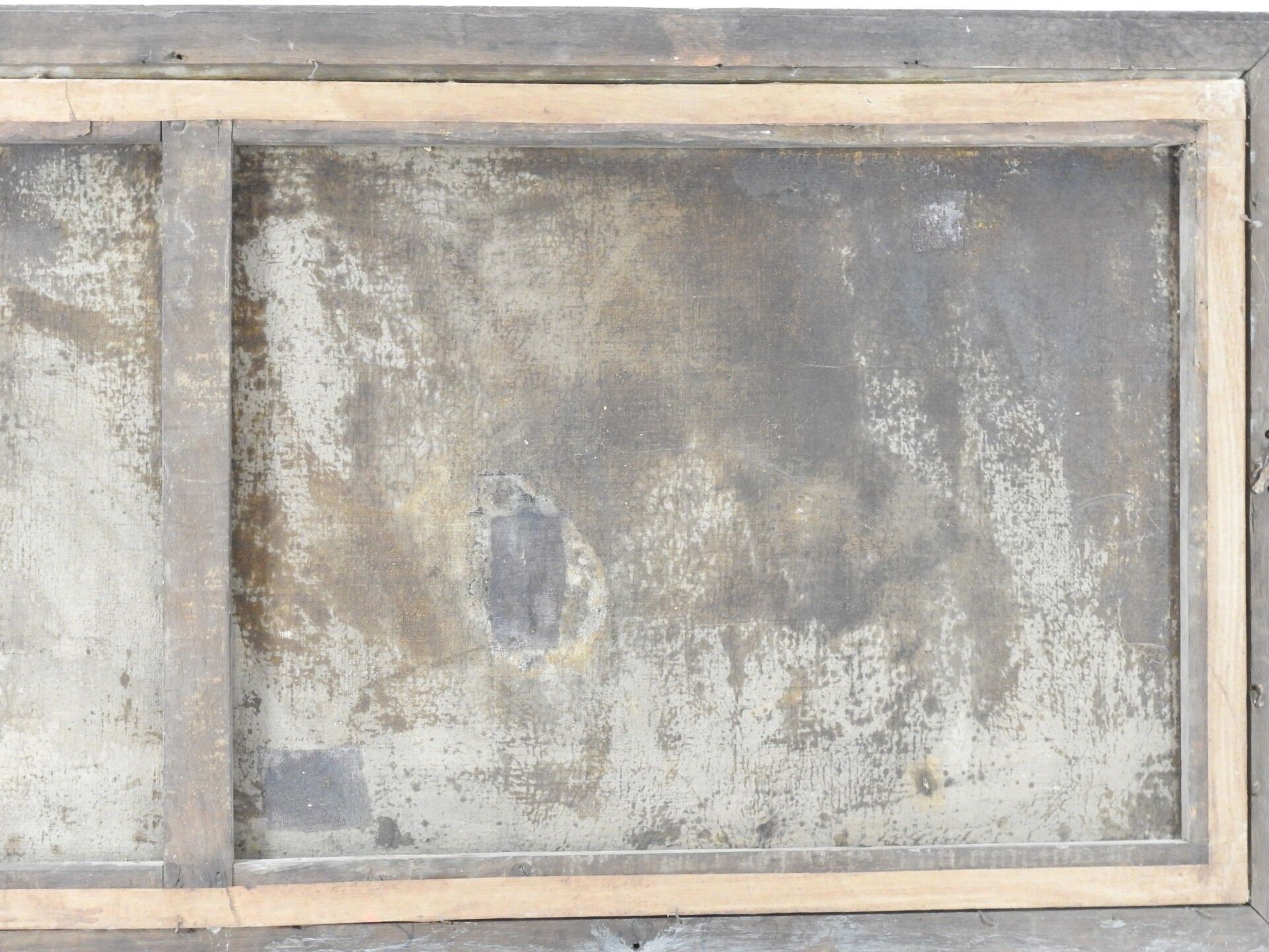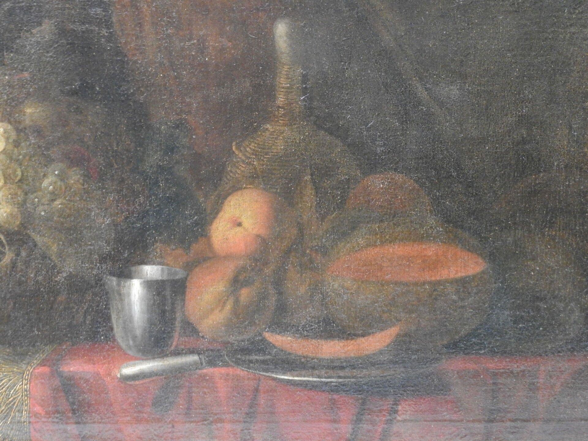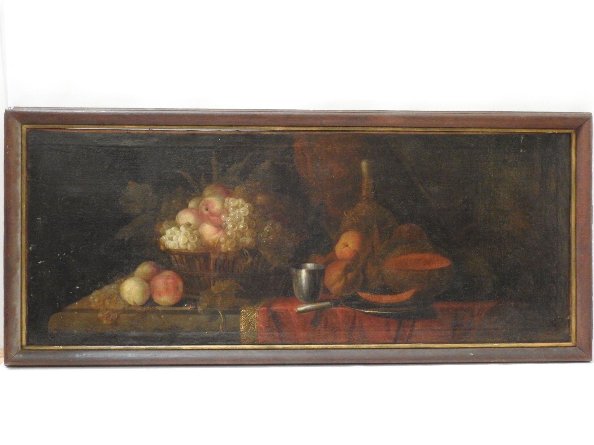 18th century FRENCH SCHOOL: Still life with fruit basket and kettledrum on an entablature. Oil on canvas (probably door top). 54 x 137 cm. Restorations