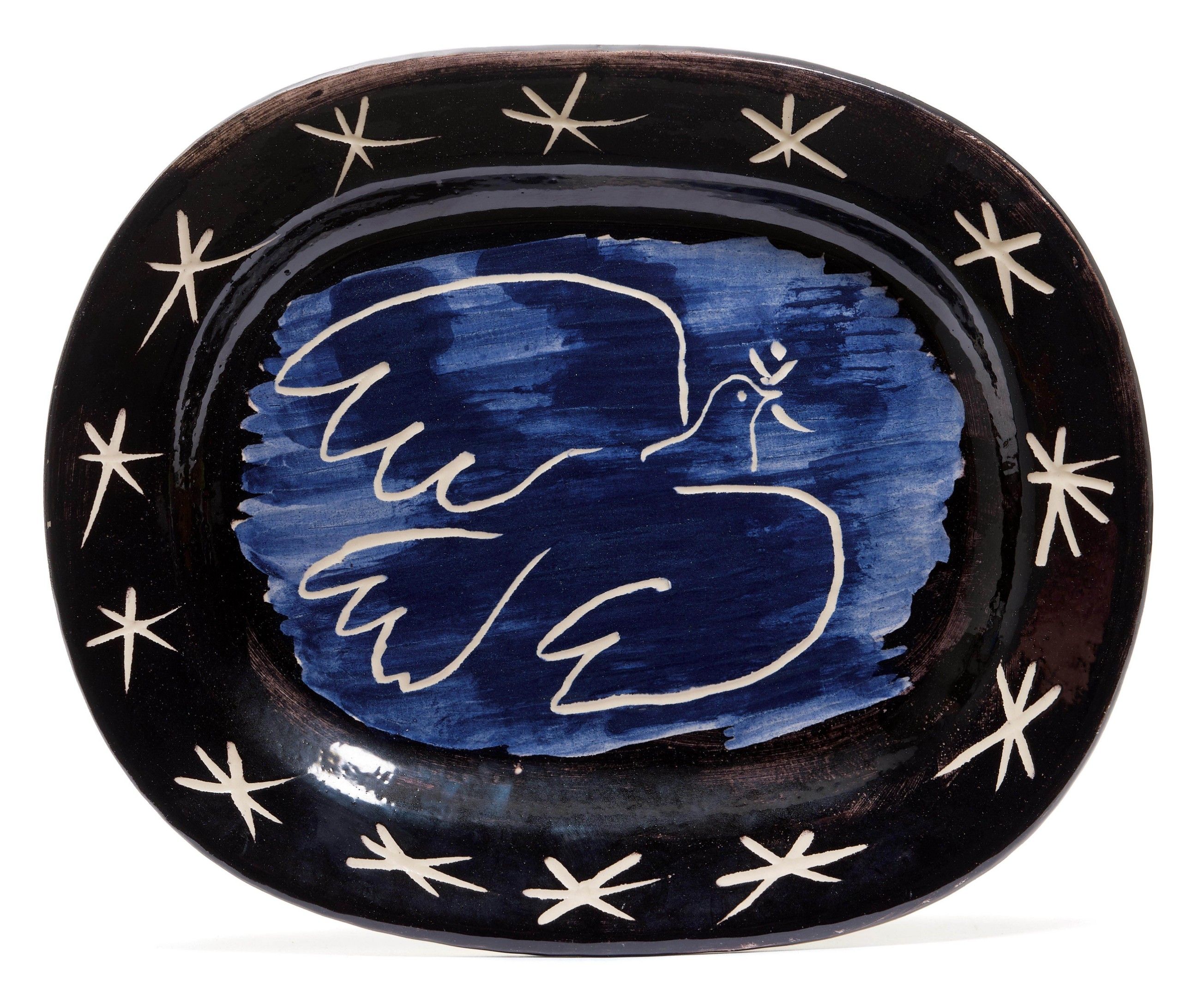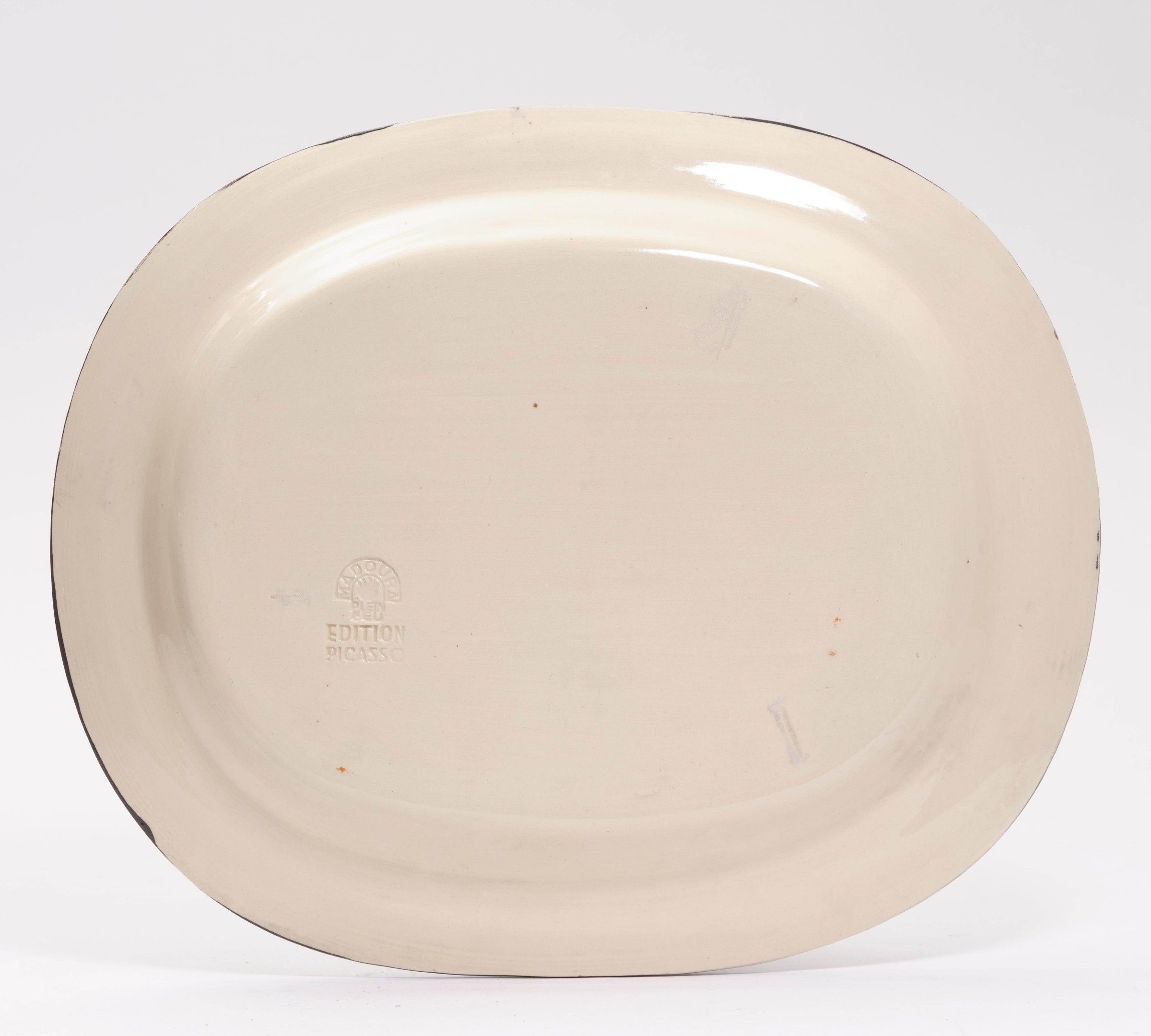 Plate. Ceramic, painted in black, blue, and white. Decorated with engobes and engraved with a knife under the glaze. From the edition of 400. On the underside, stamped under the glaze: MADOURA PLEIN FEU EDITION PICASSO. Dimensions: 31 × 37.5 cm.