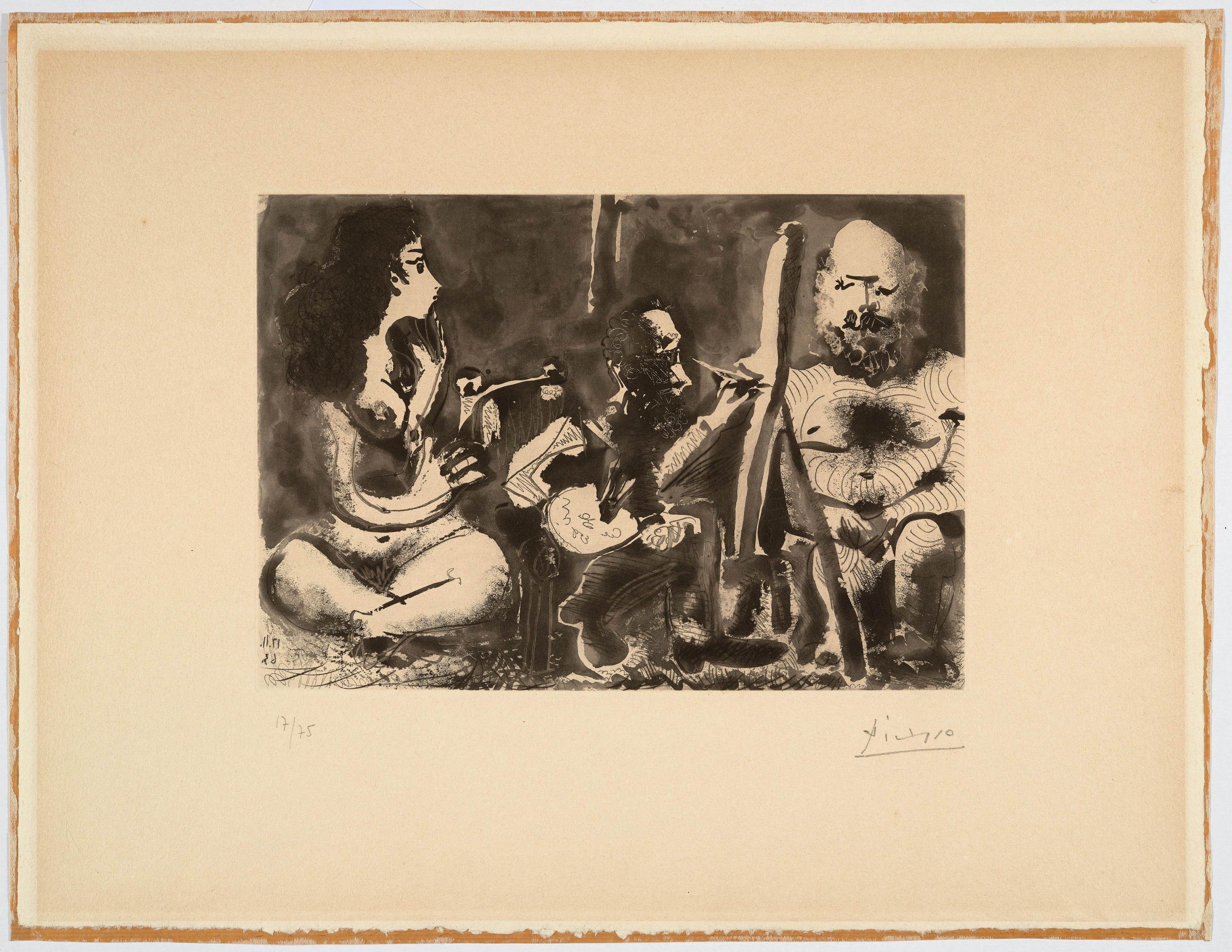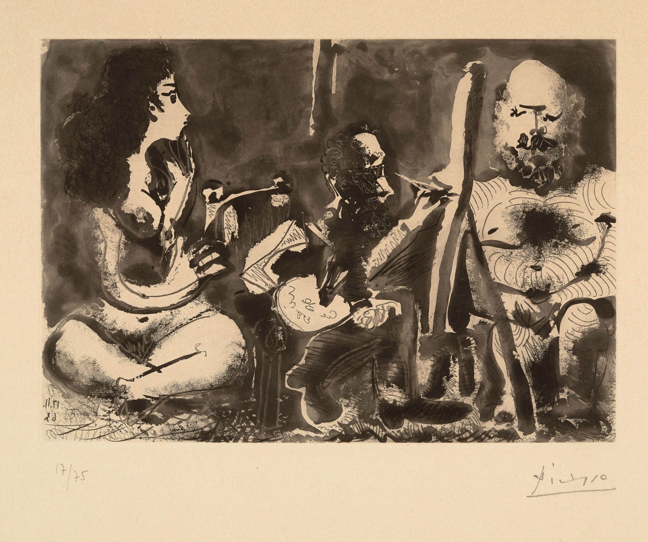 Aquatint etching and etching. 17/75. Signed in pencil lower right: Picasso, as well as dated in the plate lower left in reverse: 17.11.63. Image 23.2 × 33 cm on wove paper by Gourbeyre filigrane "Au Vent d'Arles" (with the watermarks), 42.5 × 55.5 cm. Published by Au Vent d'Arles, Paris. Printed by Atelier Crommelynck, Mougins. Frontispiece of the book "Les bleus de Barcelone" by Jaime Sabartés.