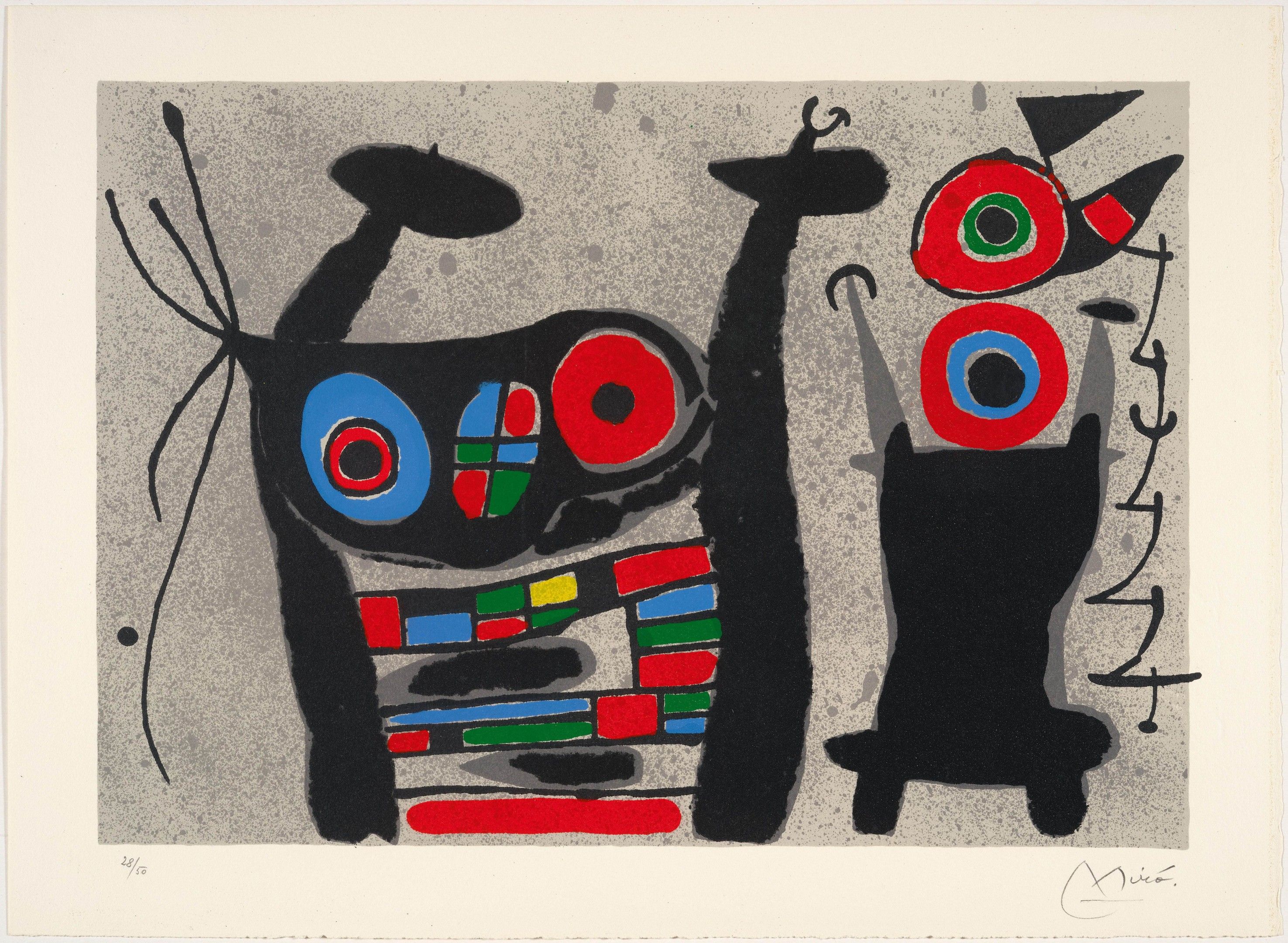 Color lithograph. 28/50, outside the edition of 170. Signed in pencil lower right: Miró. Image 33.6 × 48 cm on wove paper by BFK Rives (with the watermark: Miró) 41 × 56 cm. Published by Broder Éditeur, Paris. Printed by Mourlot Imprimeur, Paris. From the 15-part portfolio of the same name.