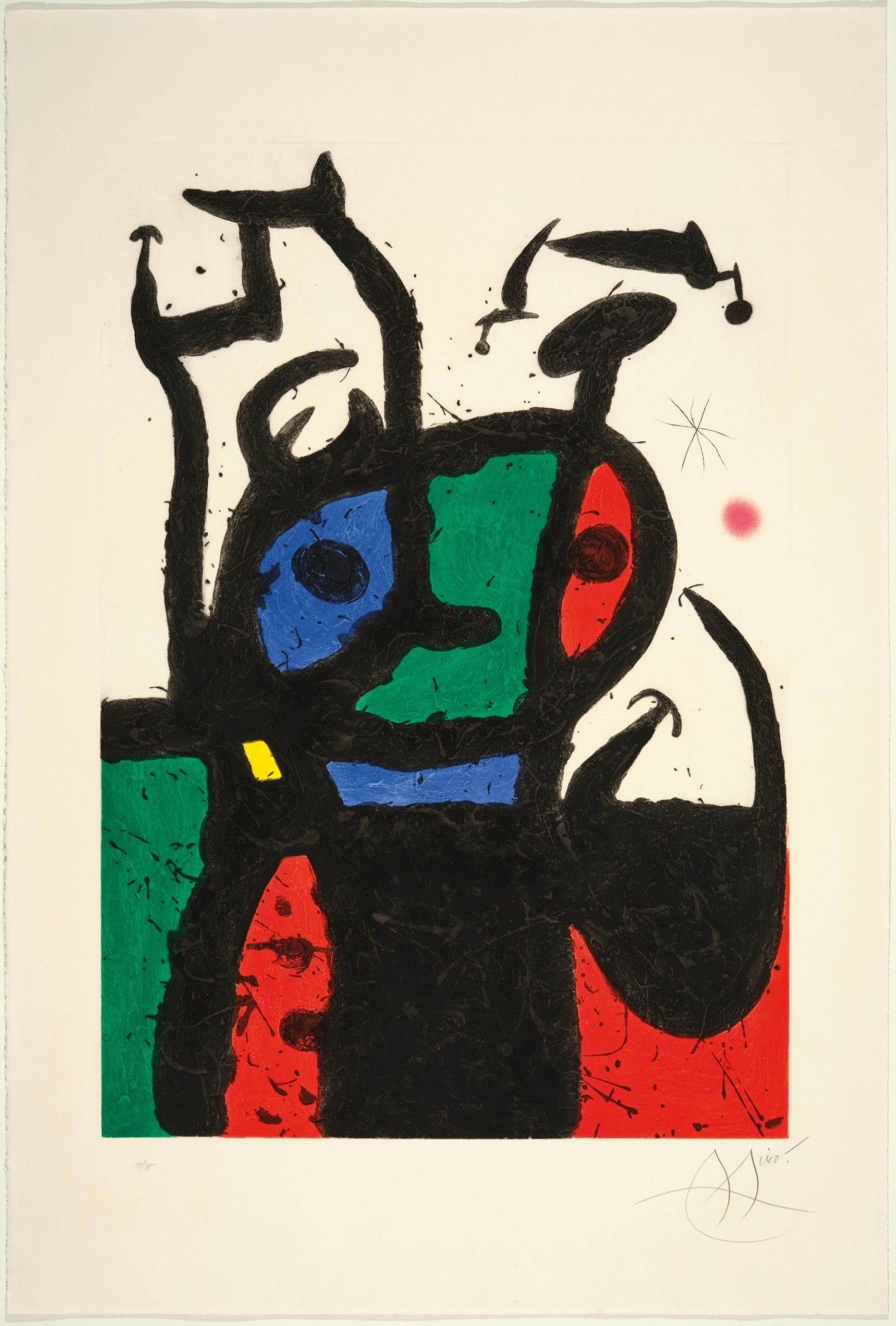 Etching, aquatint in colours, drypoint and carburundum. 18/75. Signed in pencil lower right: Miró. Image 106.5 × 73.6 cm on wove paper by Arches 139.7 × 94.5 cm. Published by Maeght, Paris. Printed by Morsang, Paris.