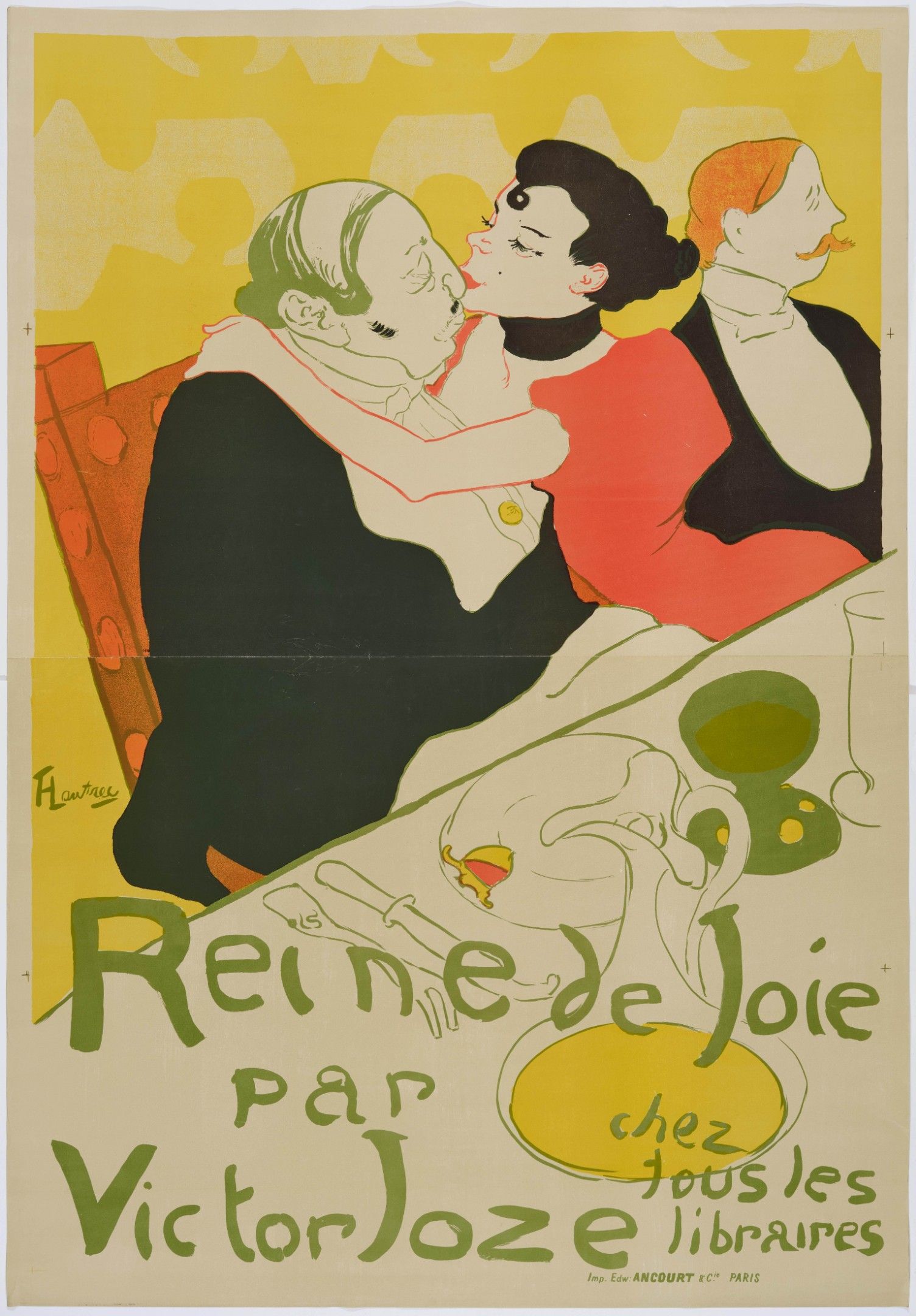 Color lithograph. From an unknown edition. Signed in the plate in the center left with the ligated monogram signature: HTLautrec, as well as titled and inscribed in the plate at the bottom center: Reine de Joie par Victor Joze chez tous les libraires. Image 136.3 × 93.8 cm on poster paper 141.8 × 98 cm. Printed by Imprimerie Edward Ancourt & Cie., Paris (with the printer's mark in the plate).