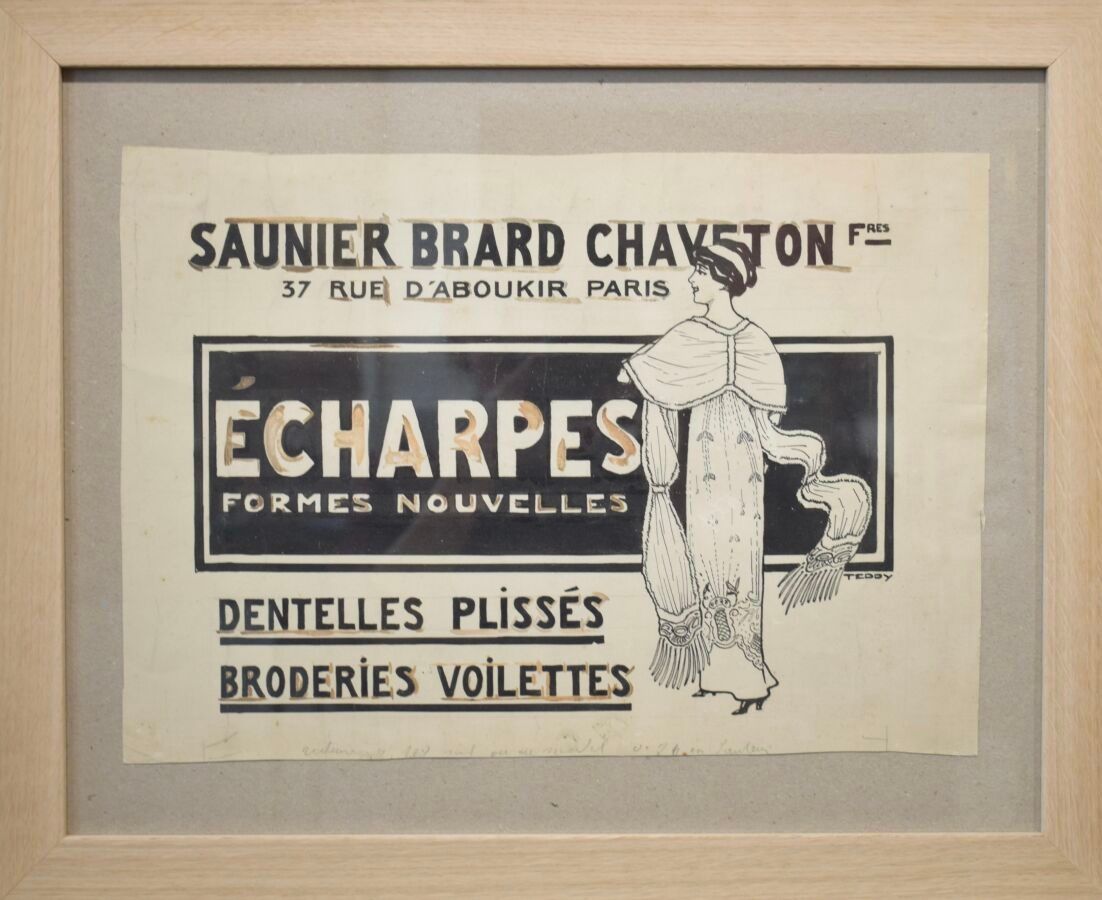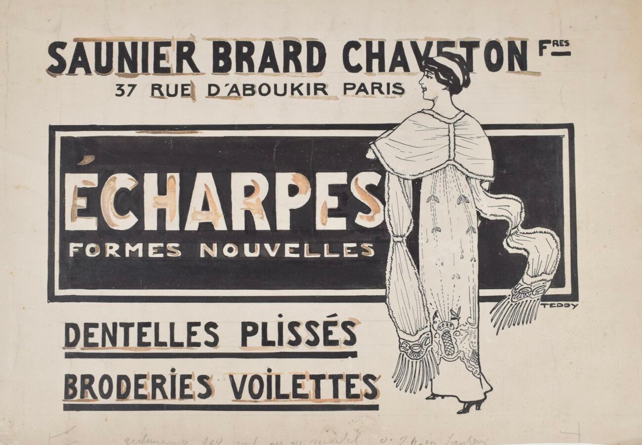 His advertising designs covered a wide range of fields: catering, millinery, fashion, footwear, optics and tyres. They are usually signed with his pseudonym "Teddy" or accompanied by a studio stamp "Edouard Saunier, dessins artistiques" or a stamp with the ES monogram. Brands include hatters Henry, Léon and Rochet, toy shop Le Paradis des Enfants, UNIC shoes, Caveryrac and Raoul, Maignen filters, Wolber and Lucifer tyres, and tailors Boka, Dewachter, Lejeune and Libby.