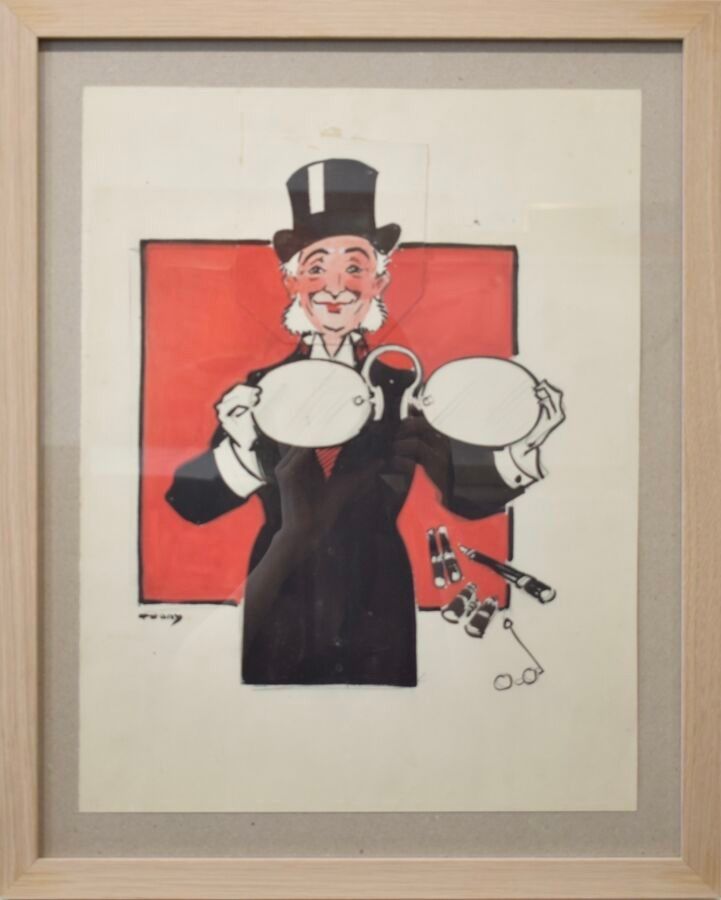 Edouard SAUNIER (1885-1918), "Binocle et Haut-de-Forme", drawing and gouache on heavy paper, signed lower left, framed, 39 x 28.5 cm