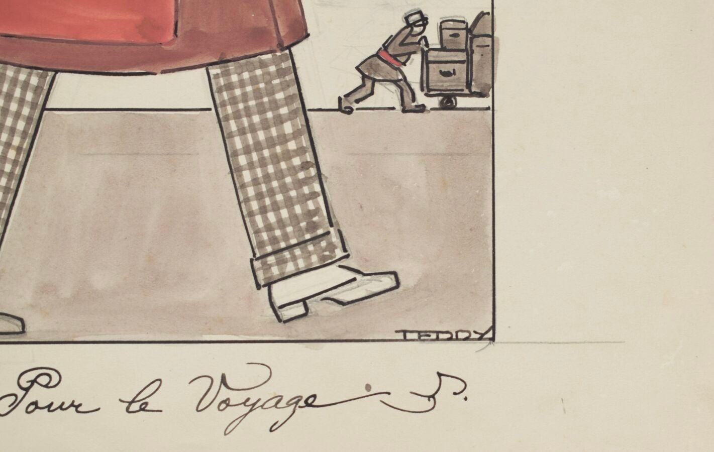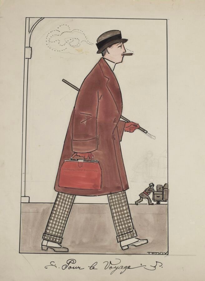 His advertising designs covered a wide range of fields: catering, millinery, fashion, footwear, optics and tyres. They are usually signed with his pseudonym "Teddy" or accompanied by a studio stamp "Edouard Saunier, dessins artistiques" or a stamp with the ES monogram. Brands include hatters Henry, Léon and Rochet, toy shop Le Paradis des Enfants, UNIC shoes, Caveryrac and Raoul, Maignen filters, Wolber and Lucifer tyres, and tailors Boka, Dewachter, Lejeune and Libby.