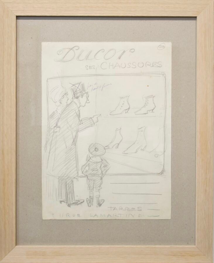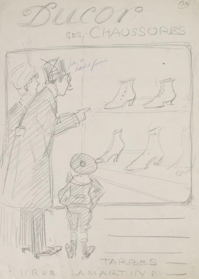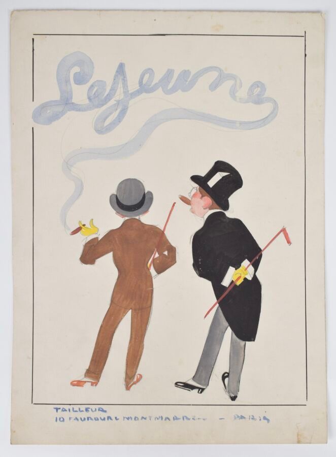 Edouard SAUNIER (1885-1918), "Lejeune, tailleur... Ducor, chaussures", double-sided drawing, gouache on strong paper, framed, 32.5 x 23.5 cm.