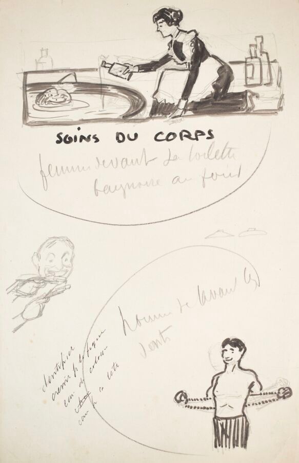 Edouard SAUNIER (1885-1918), "LE JEUNE, Tailleur des élégants" and "Soins du corps", ink drawing on paper, 27.5 x 21 cm and 30 x 20 cm.