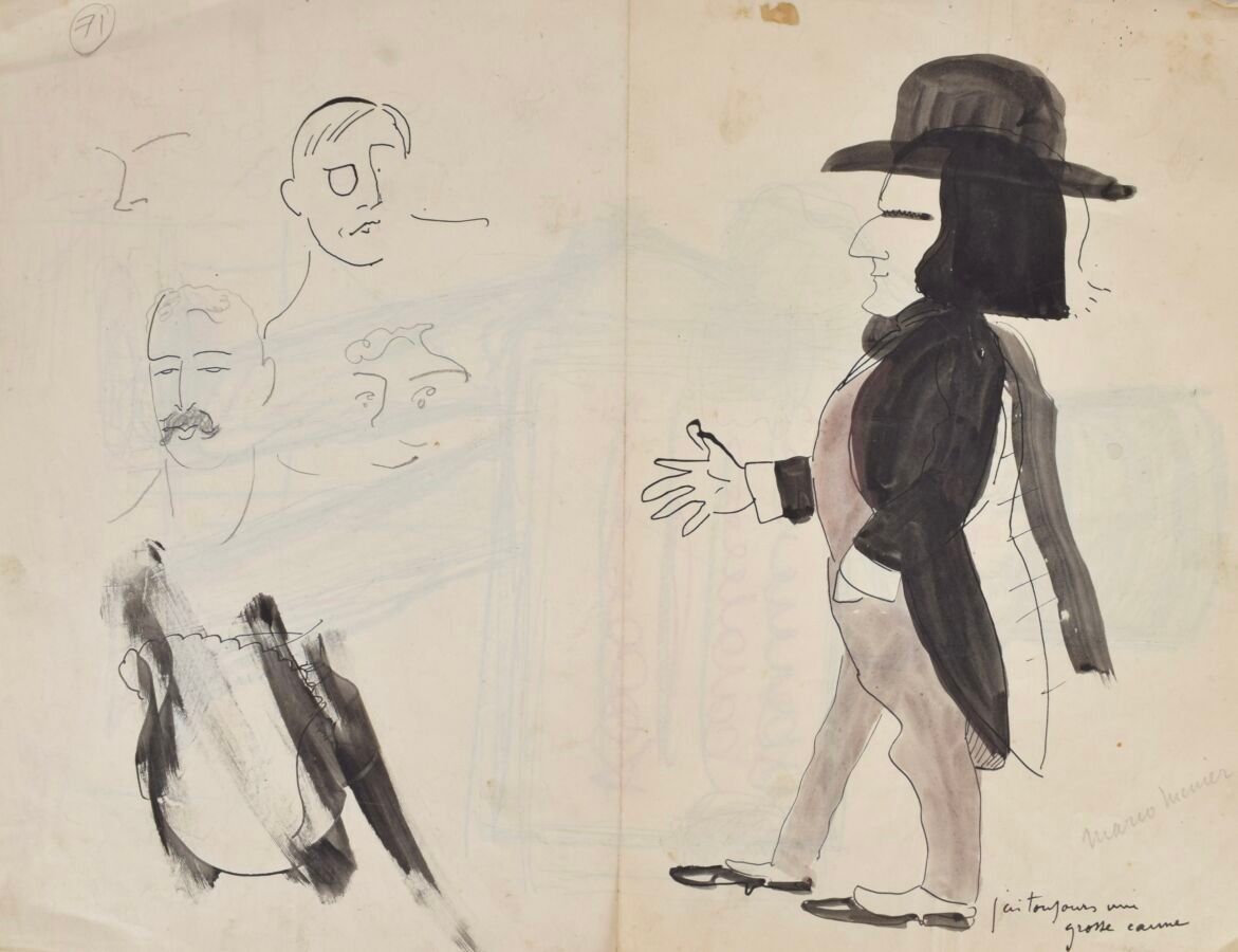Edouard SAUNIER (1885-1918), "LE GROOM, QUEUE DE PIE ET HAUT-DE-FORME", double-sided drawings, calam pencil and ink on tracing paper, framed, 40 x 30 cm.