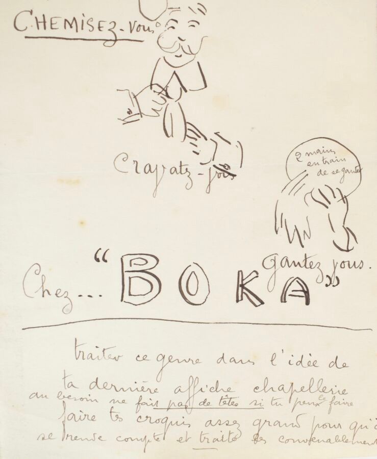 His advertising designs covered a wide range of fields: catering, millinery, fashion, footwear, optics and tyres. They are usually signed with his pseudonym "Teddy" or accompanied by a studio stamp "Edouard Saunier, dessins artistiques" or a stamp with the ES monogram. Brands include hatters Henry, Léon and Rochet, toy shop Le Paradis des Enfants, UNIC shoes, Caveryrac and Raoul, Maignen filters, Wolber and Lucifer tyres, and tailors Boka, Dewachter, Lejeune and Libby.
