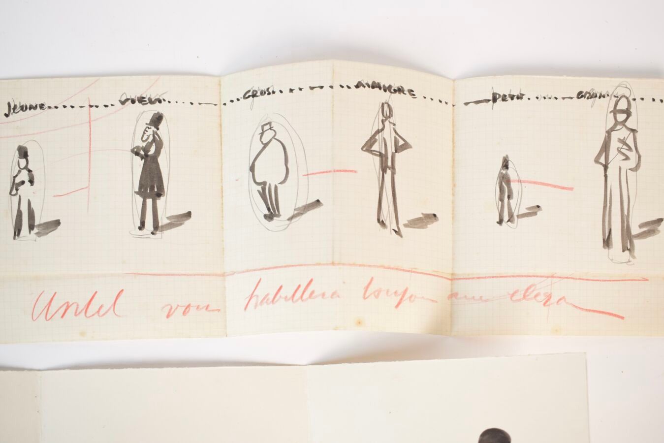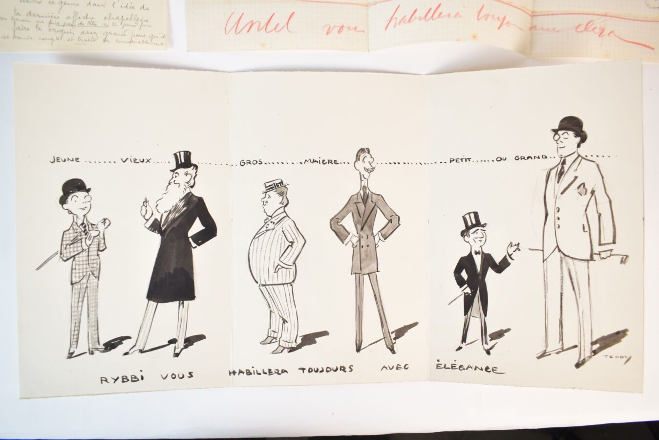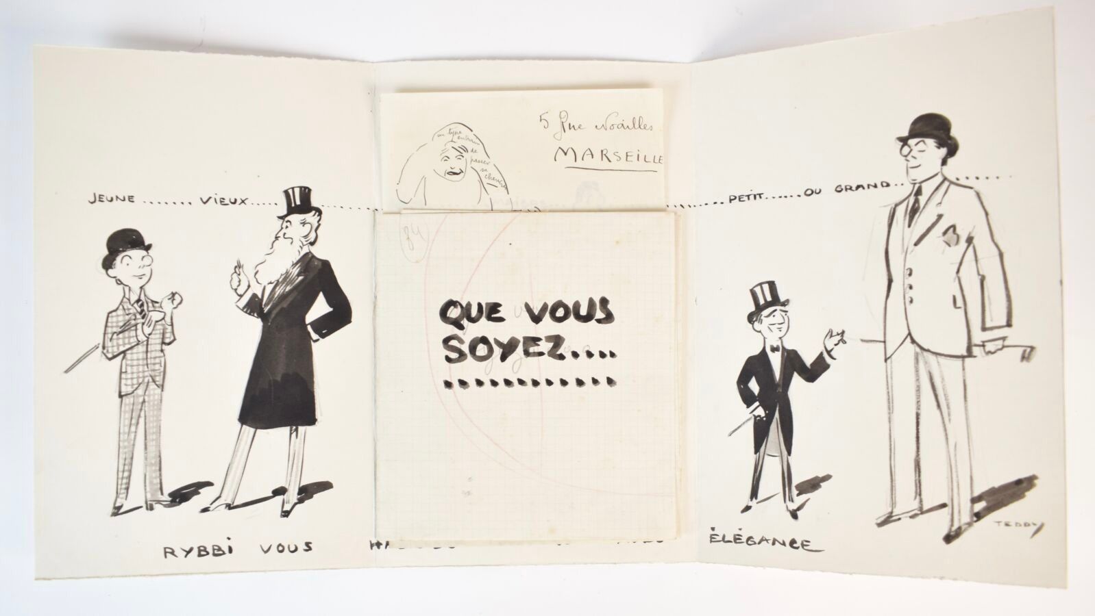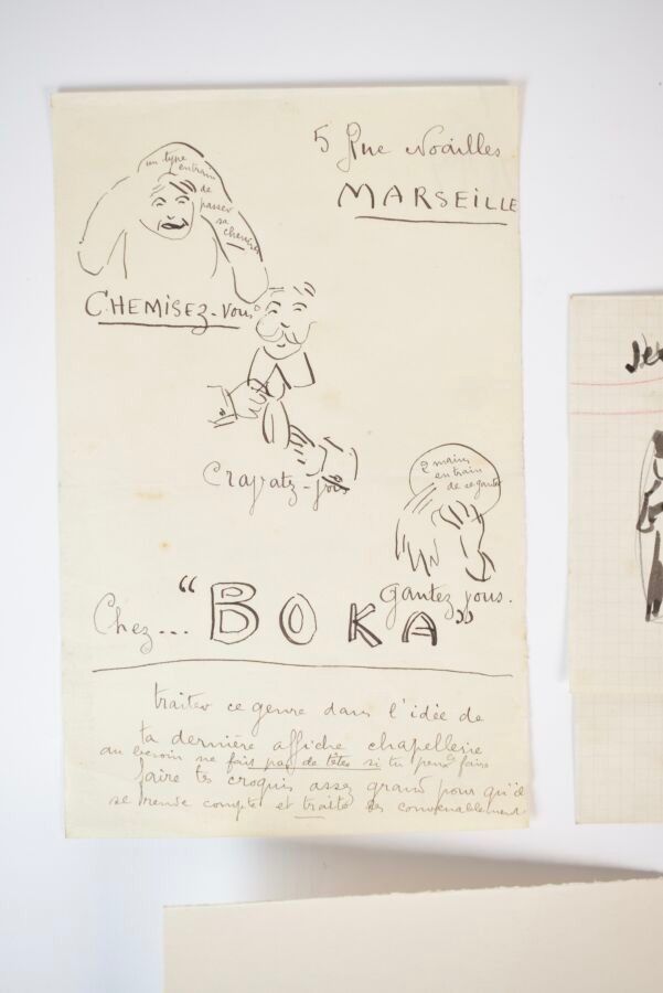 Edouard SAUNIER (1885-1918), "RYBBI", "Que vous soyez..." and "Chez Boka", set of three ink and ink wash drawings, one signed, 21.5 x 13 cm; 45 x 24 cm; 41.5 x 27 cm.