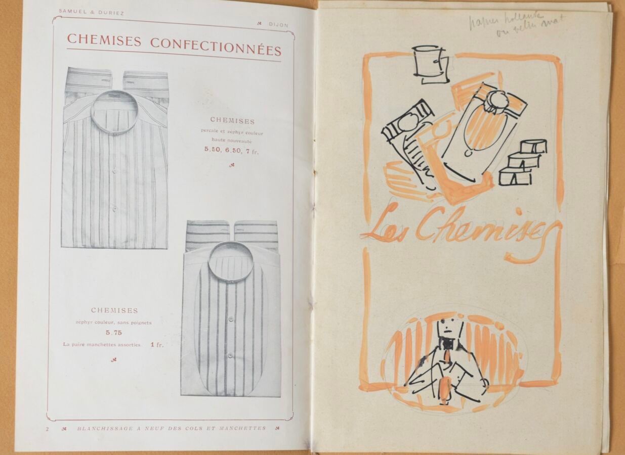 Edouard SAUNIER (1885-1918), "On ne voit pas vos dessous mais on les devine! "booklet including 4 drawings and watercolours: "Les chemises"; "Les cravates"; "La Bonneterie"; "Les gants", 22 x 15 cm.