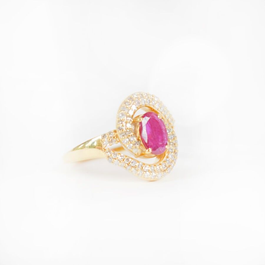 14K (575/oo) gold ring set with an oval ruby weighing approx. 0.5 ct, in a double surround of diamonds weighing approx. 0.5 ct. TDD: 53. Gross weight: 3.66 g.