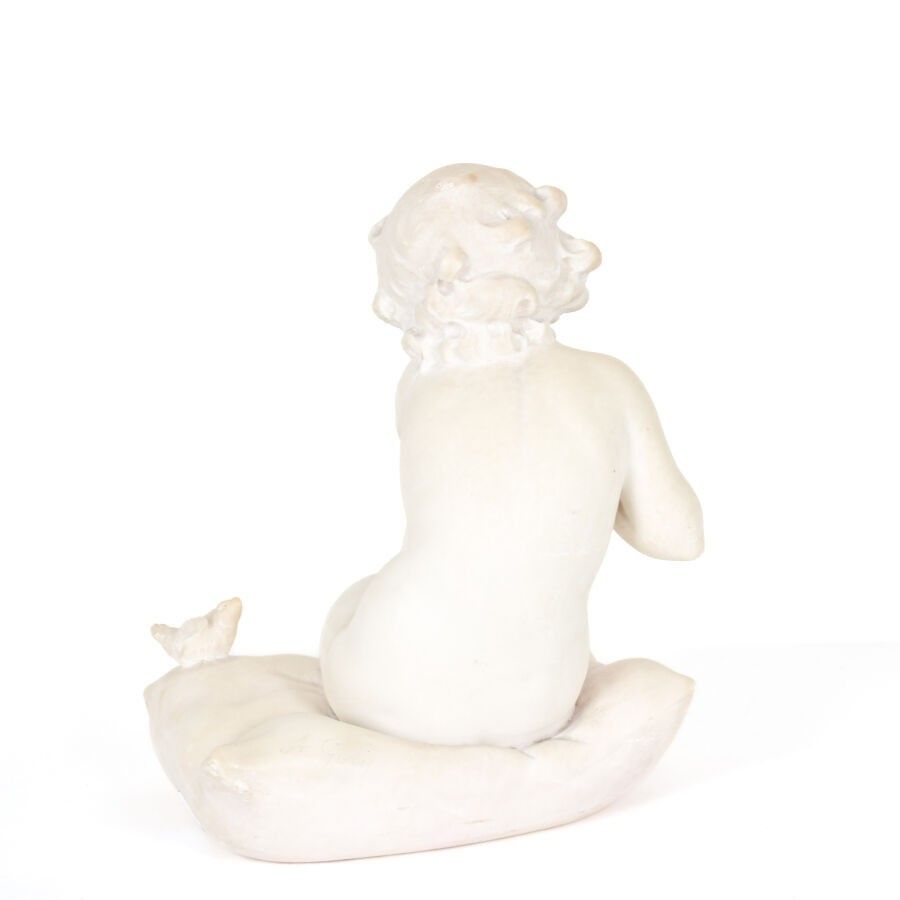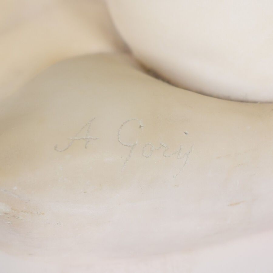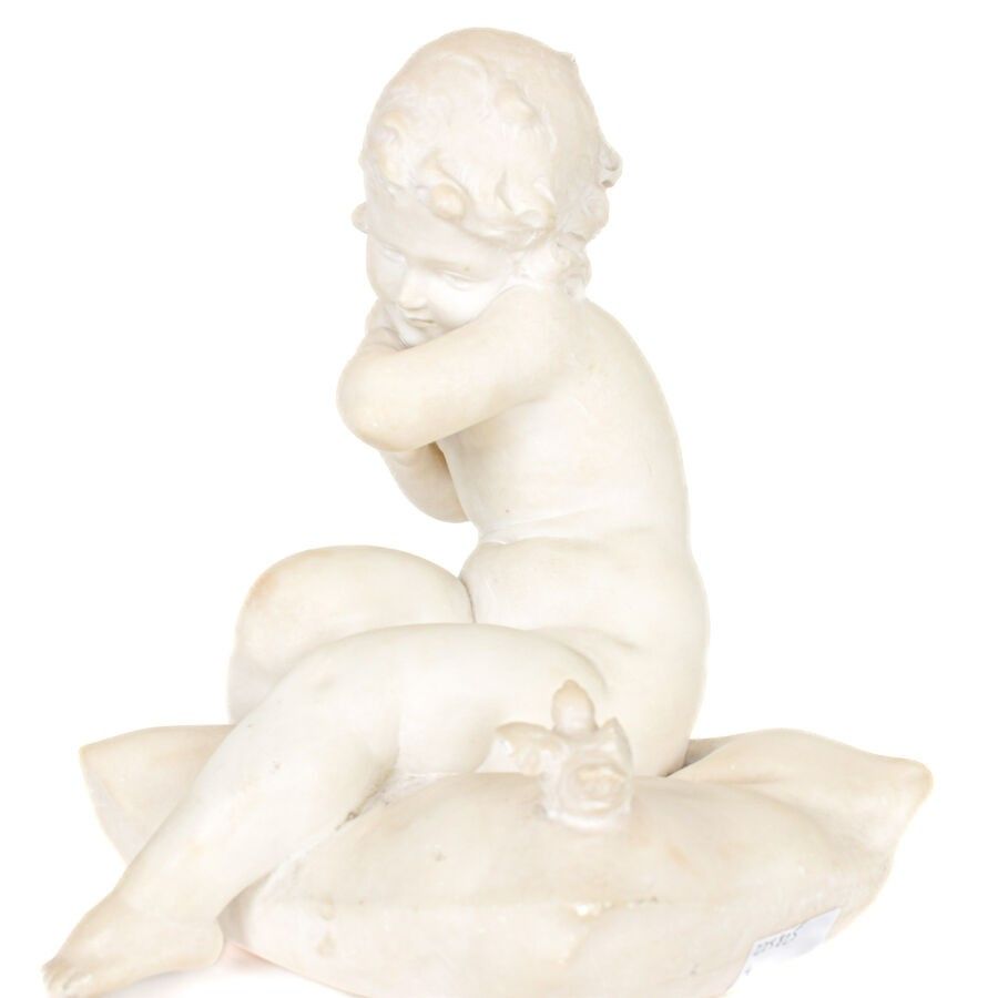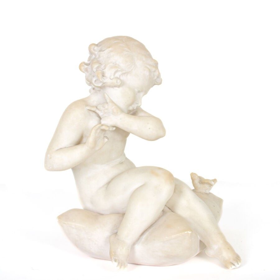 Affortunato GORI (1886-1925), "Young child with cushion and bird", white marble, 22 x 29 x 29 cm (small accident to the wing, chips to the thumb and middle finger).