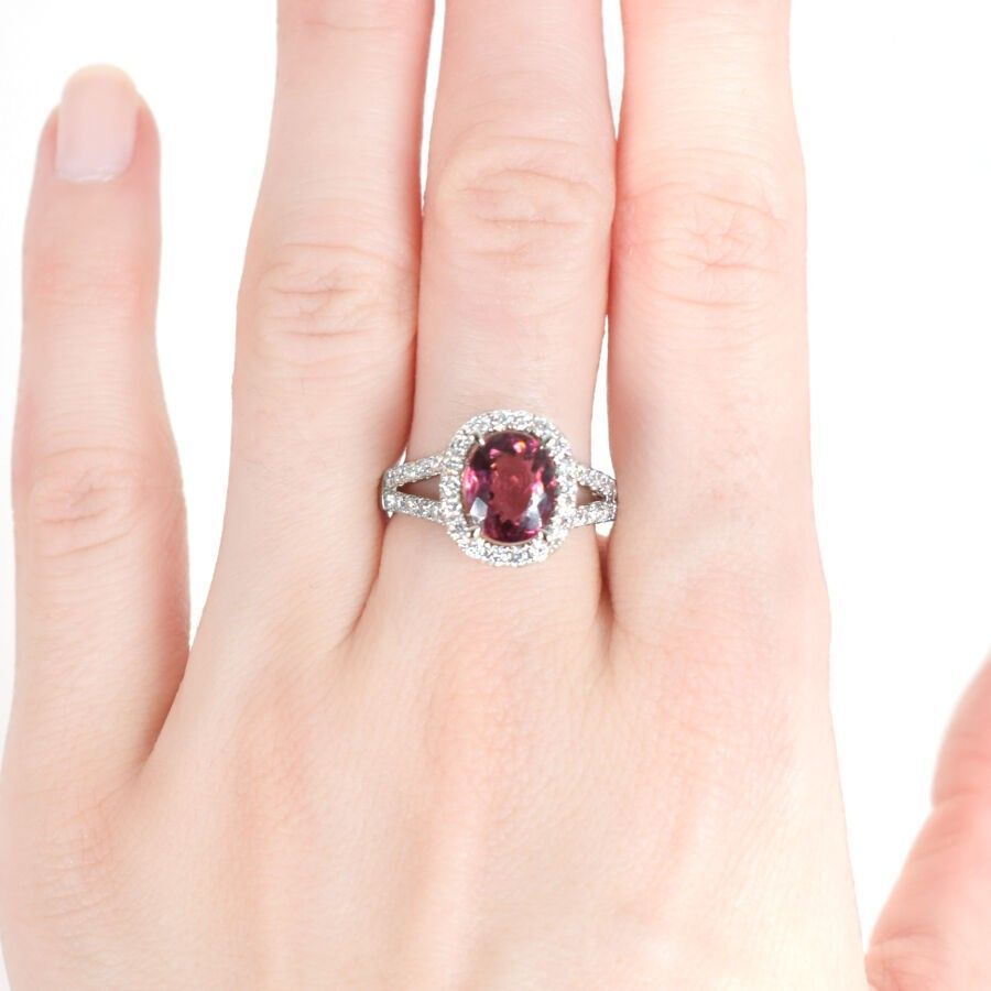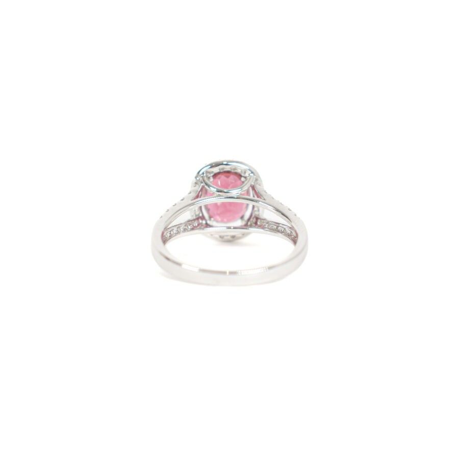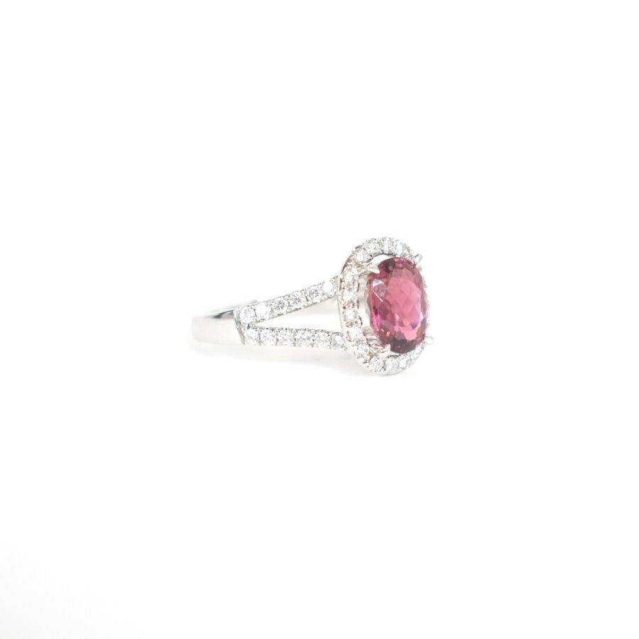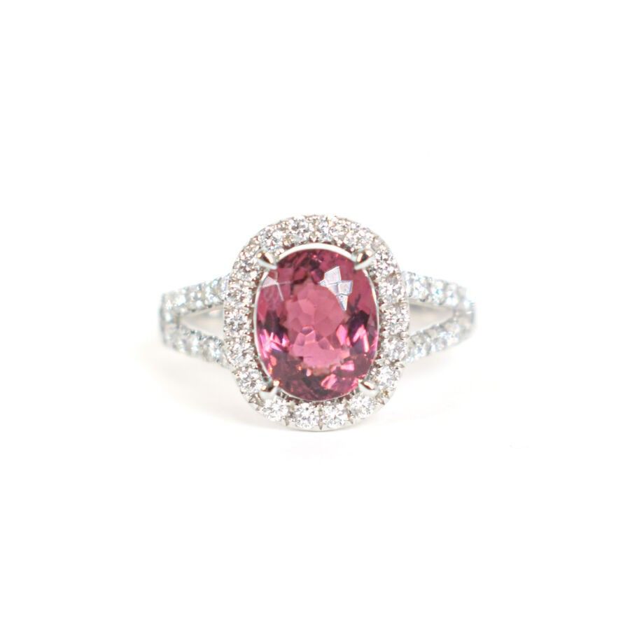 Double-brown 18K (750/oo) white gold ring set with an oval-cut pink tourmaline weighing approximately 1.9 ct, set with forty-two modern-cut white diamonds weighing approximately 0.5 ct. TDD: 53.