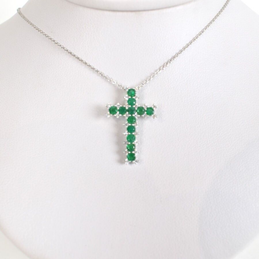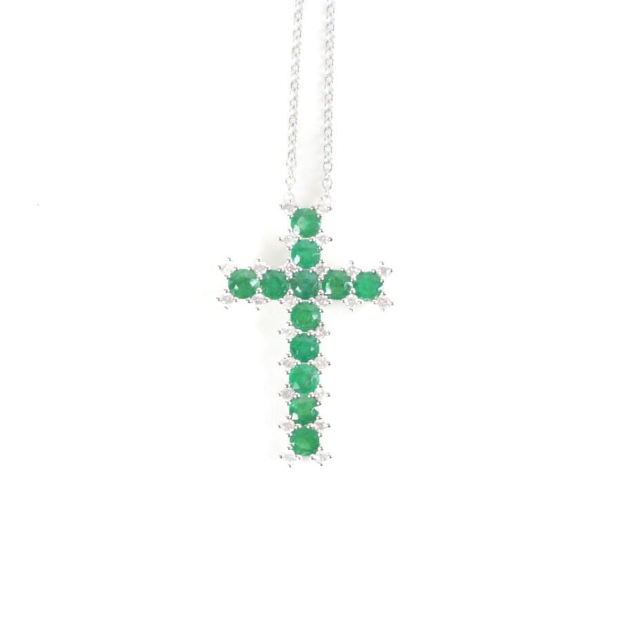 Necklace in 18K (750/oo) white gold set with a cross of emeralds weighing approximately 0.7 ct, enhanced with modern-cut diamonds weighing approximately 0.2 ct, L. 45 cm. Gross weight: 1.9 g.