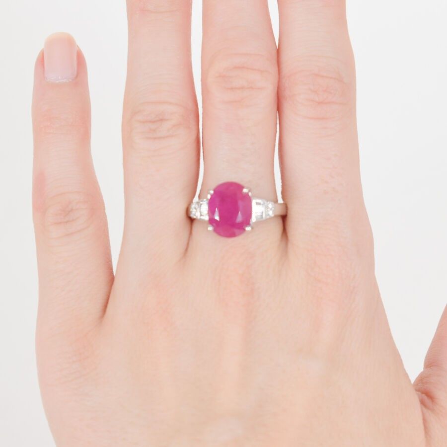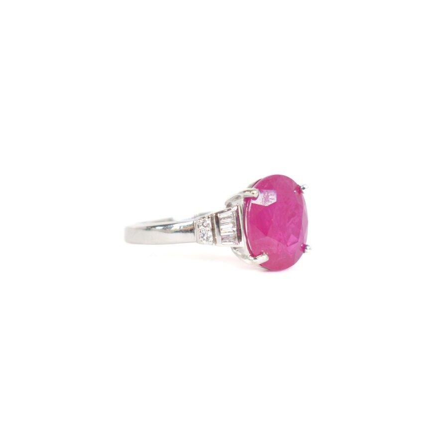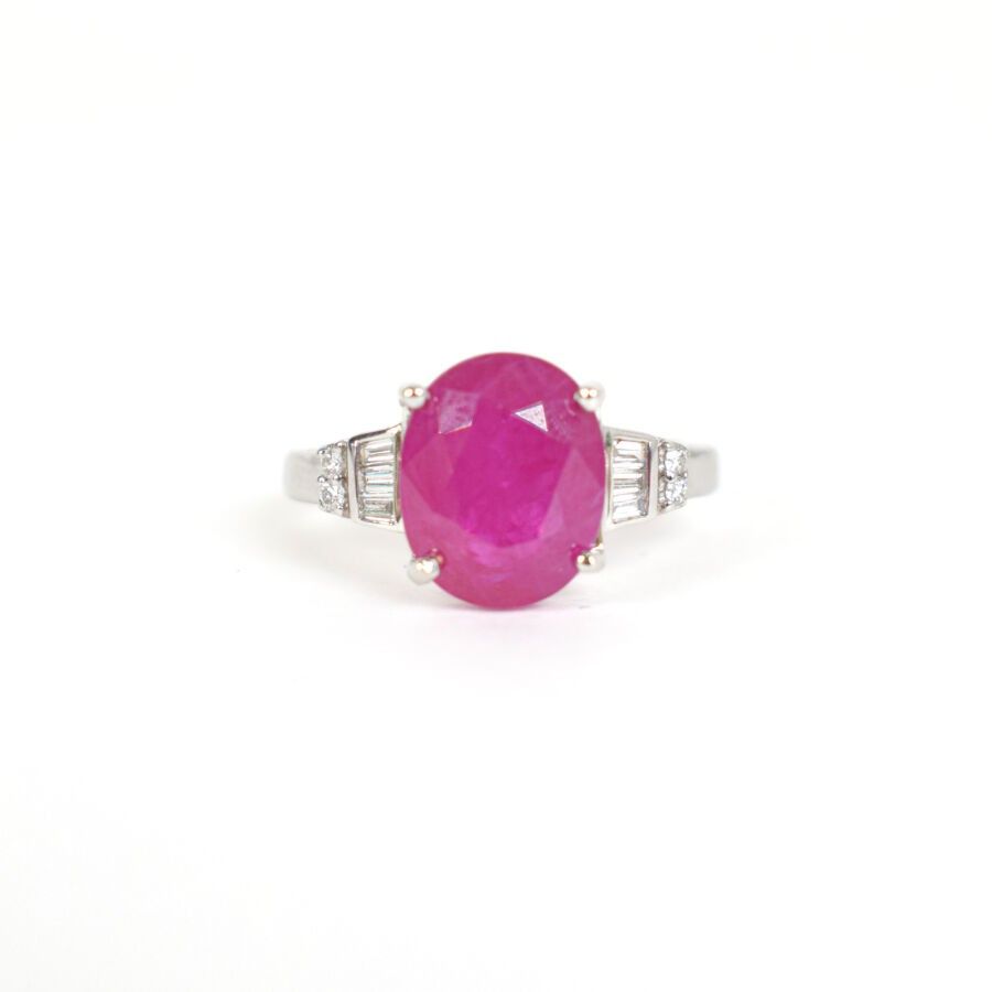 Ring in 18K (750/oo) white gold set with an oval-cut ruby weighing approx. 4.8 ct, set with six baguette-cut white diamonds weighing approx. 0.1 ct and four modern-cut white diamonds weighing approx. 0.05 ct. Ring size: 17 x 11 mm. TDD: 54.