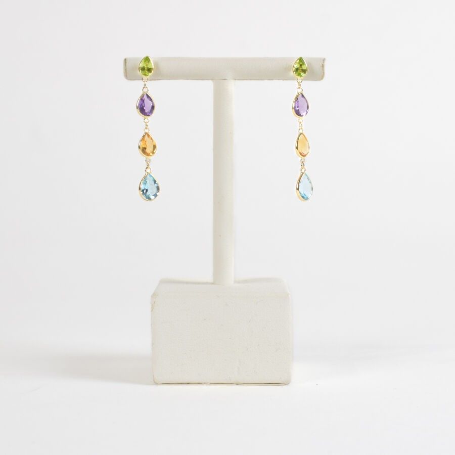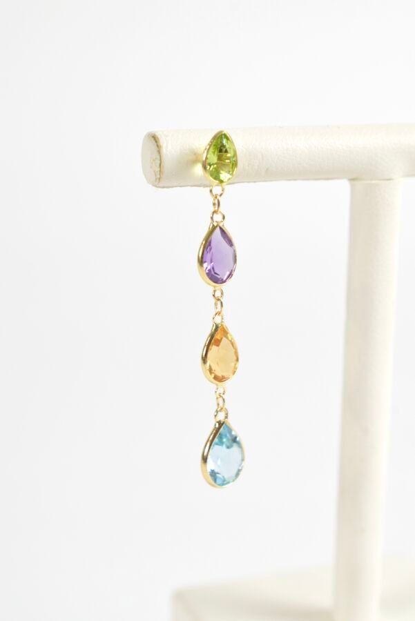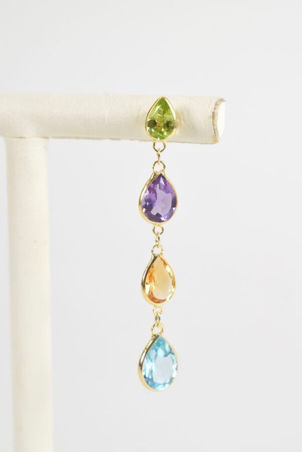 Pair of 18K (750/oo) yellow gold earrings set with pear-cut peridots, amethysts, citrines and topazes weighing approximately 6.1 ct, Belgian pousette clasps. Gross weight: 2.3 g.