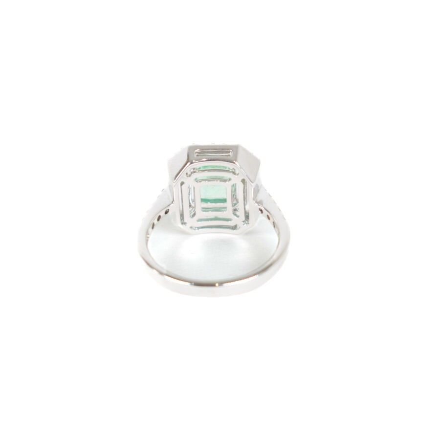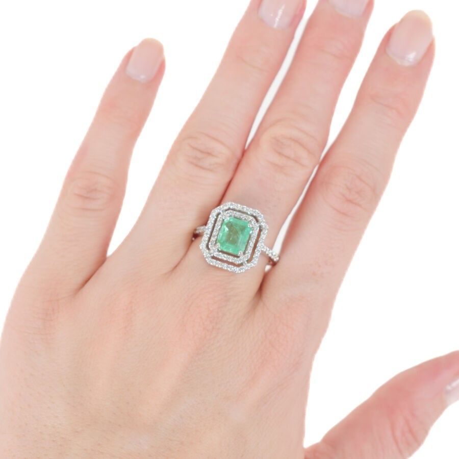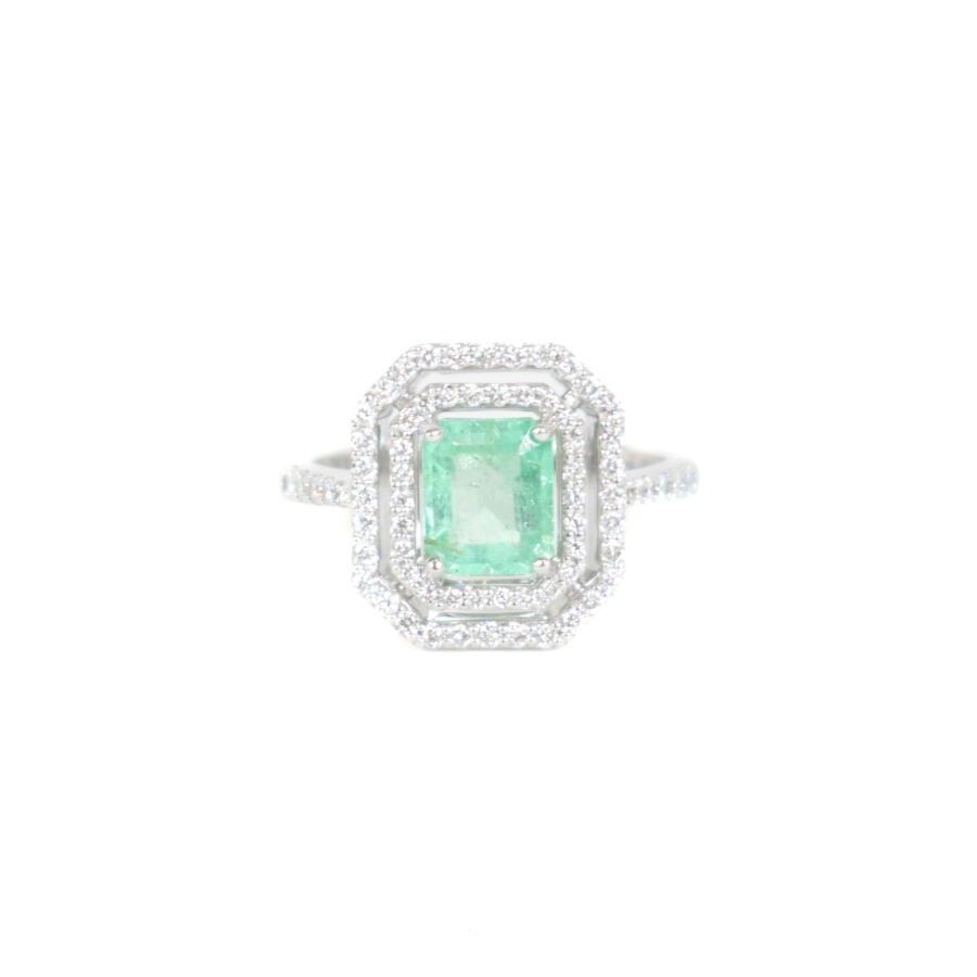 18K (750/oo) white gold ring set in its centre with an emerald-cut (probably Colombian) emerald weighing approximately 1.1 ct in a double surround of sixty-eight modern-cut white diamonds weighing approximately 0.5 ct. TDD: 54. Ring size: 14 x 20 mm.