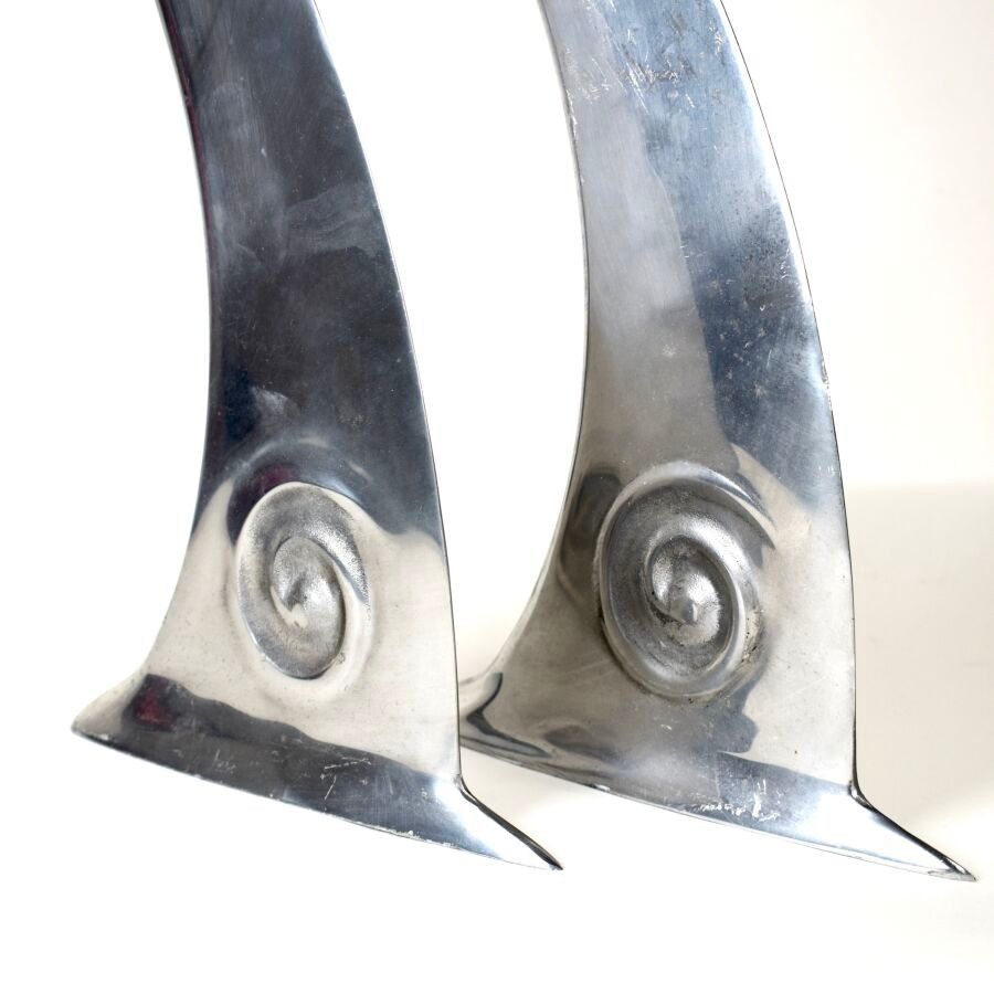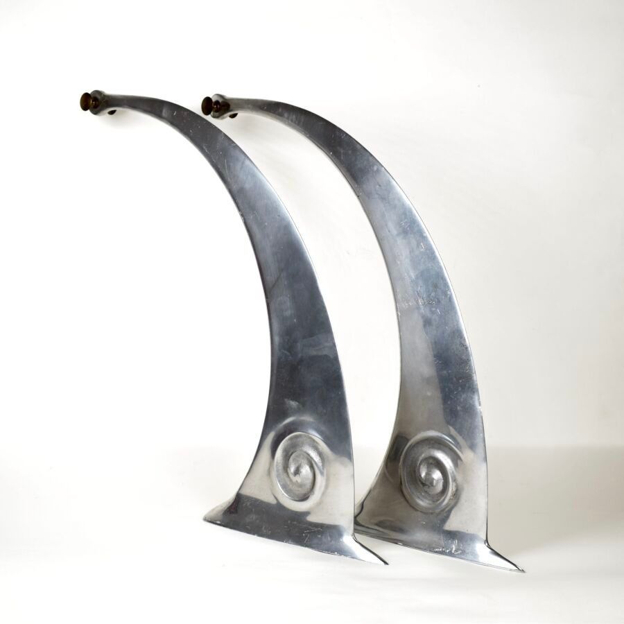 Pucci De ROSSI (1947-2013) : Suite of 2 organic "Trompe" coat hooks in lustrous aluminium, decorated with spirals.