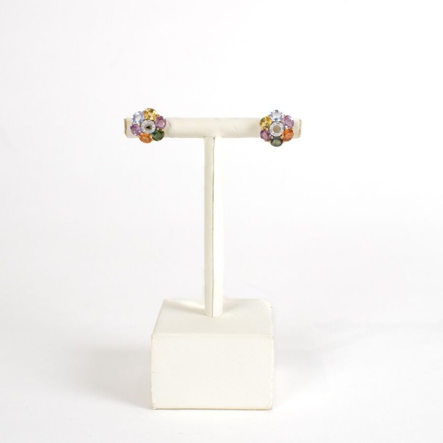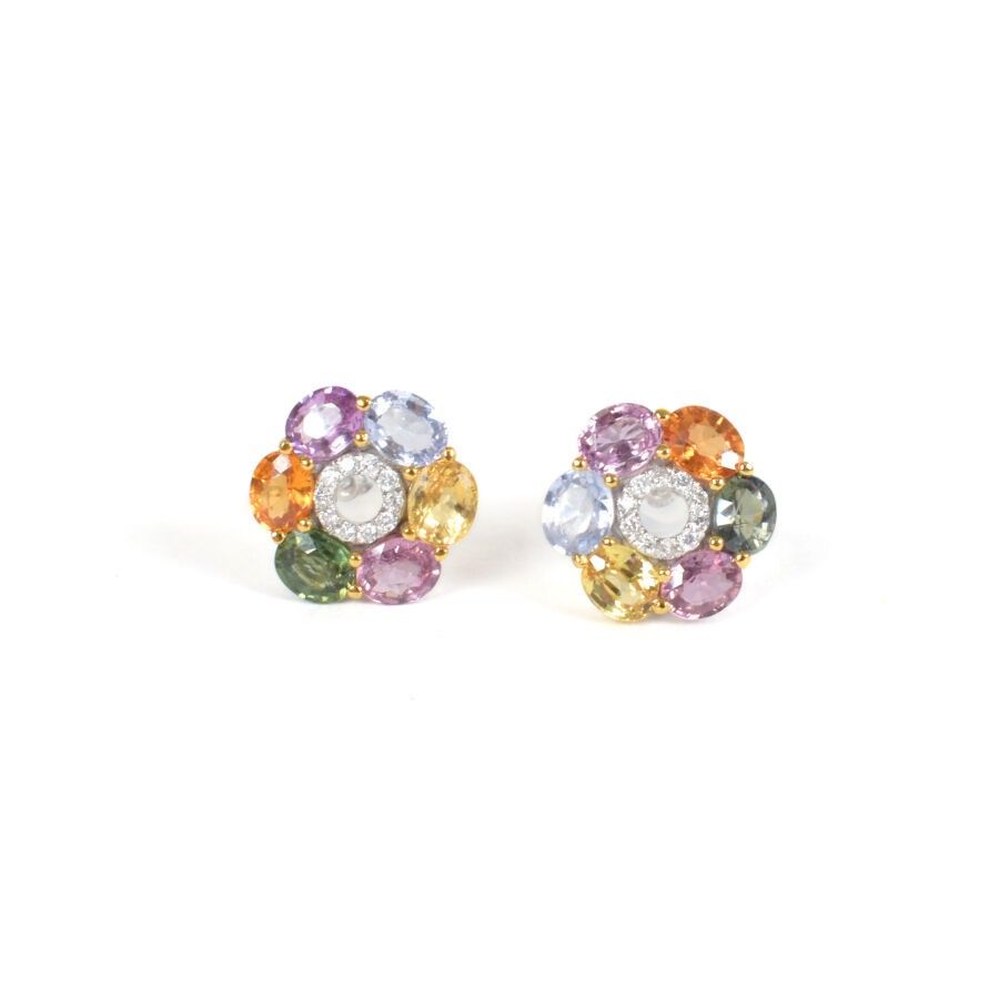 Pair of platinum ear studs set with pink, green, orange, yellow and blue sapphires weighing approximately 4 ct and enhanced with diamonds weighing approximately 0.1 ct, silicone clasps. Gross weight: 2.8 g.