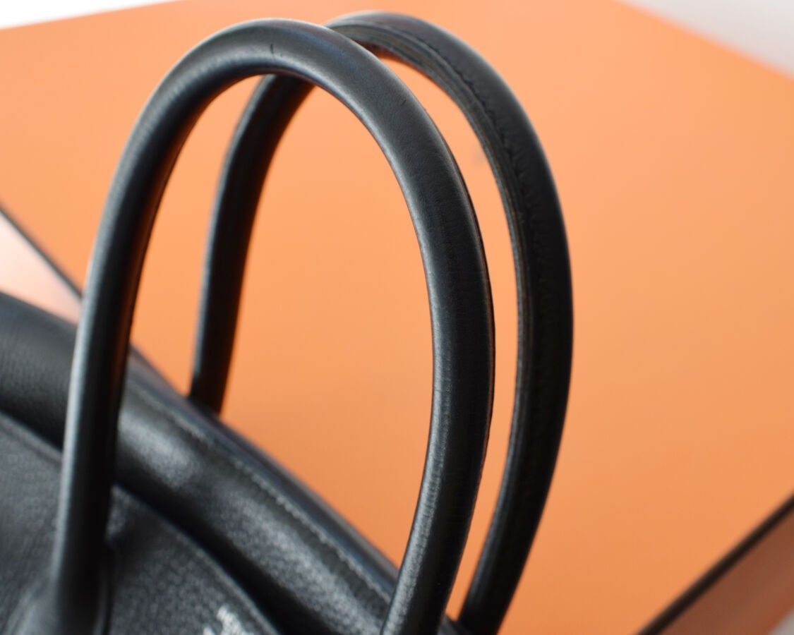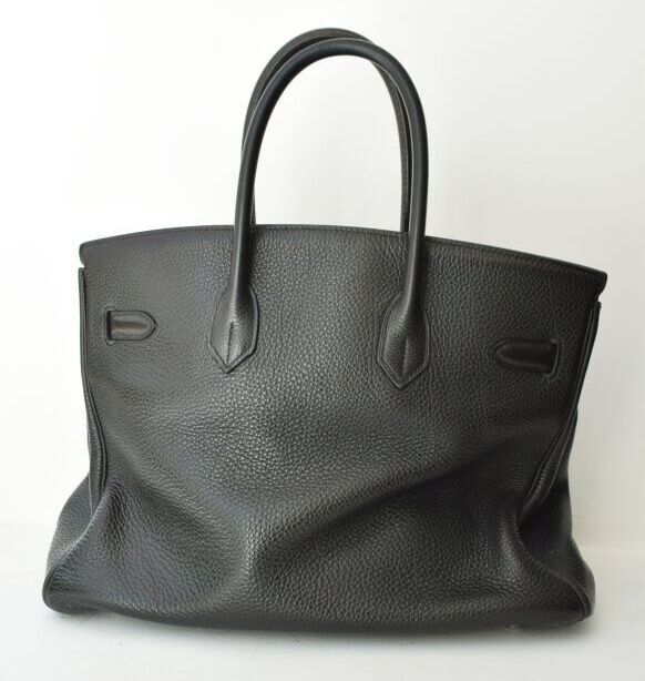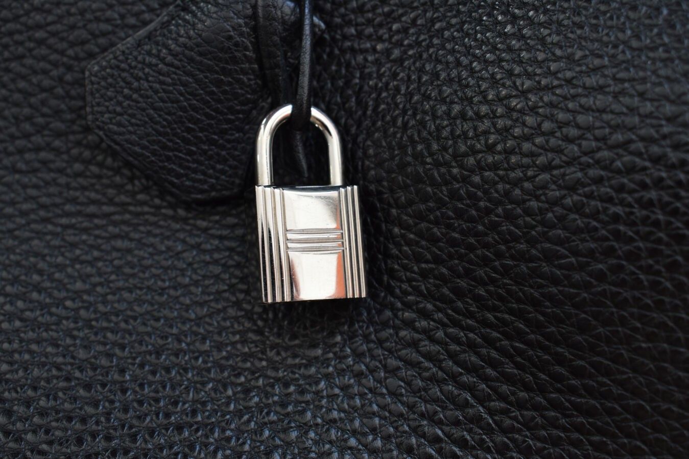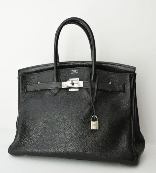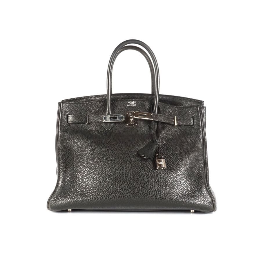 HERMES: 2004 "Birkin" bag in black leather and silver-tone metal jewellery, double top handle for hand-carrying, black interior, date letter H in a square, marked "AE", presented with its padlock and bell holding a key, accompanied by its original box and original dustbag, H. 25 cm. H. (with handles) 37 cm. W. 33 cm. W. 17 cm (minor wear scratches on the jewellery, some wear to the top corners and tiny marks to the leather).