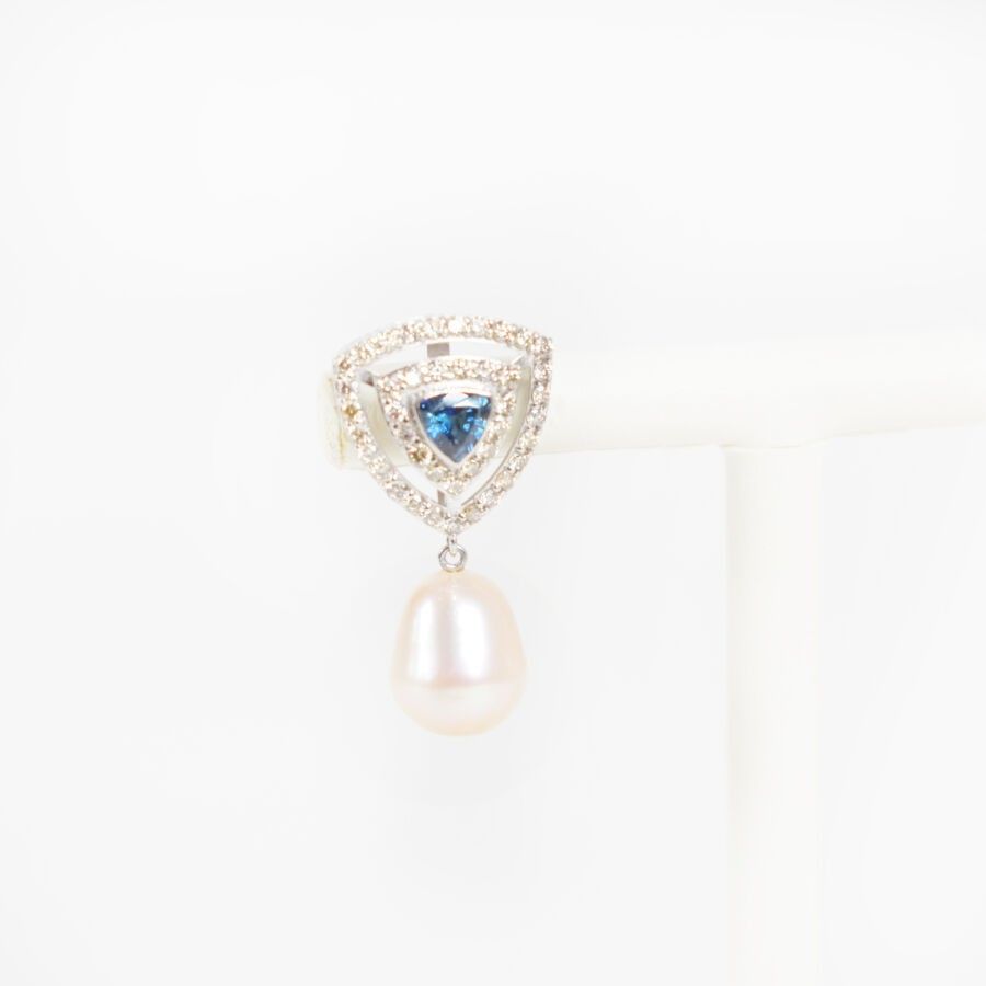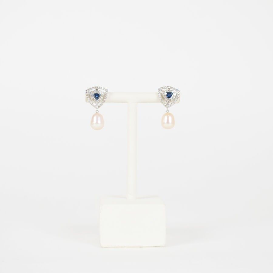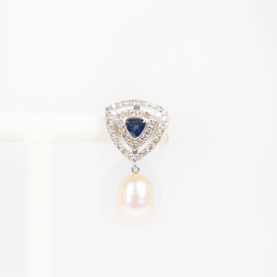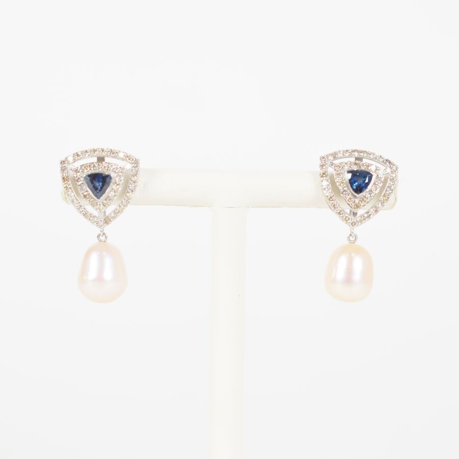 Pair of 9K (385/oo) gold triangle-shaped earrings, centred on sapphires weighing approximately 0.6 ct, in a double border of diamonds, ending in a pearl pendant weighing approximately 12.3 ct, L. 24 mm. Gross weight: 4.7 g.