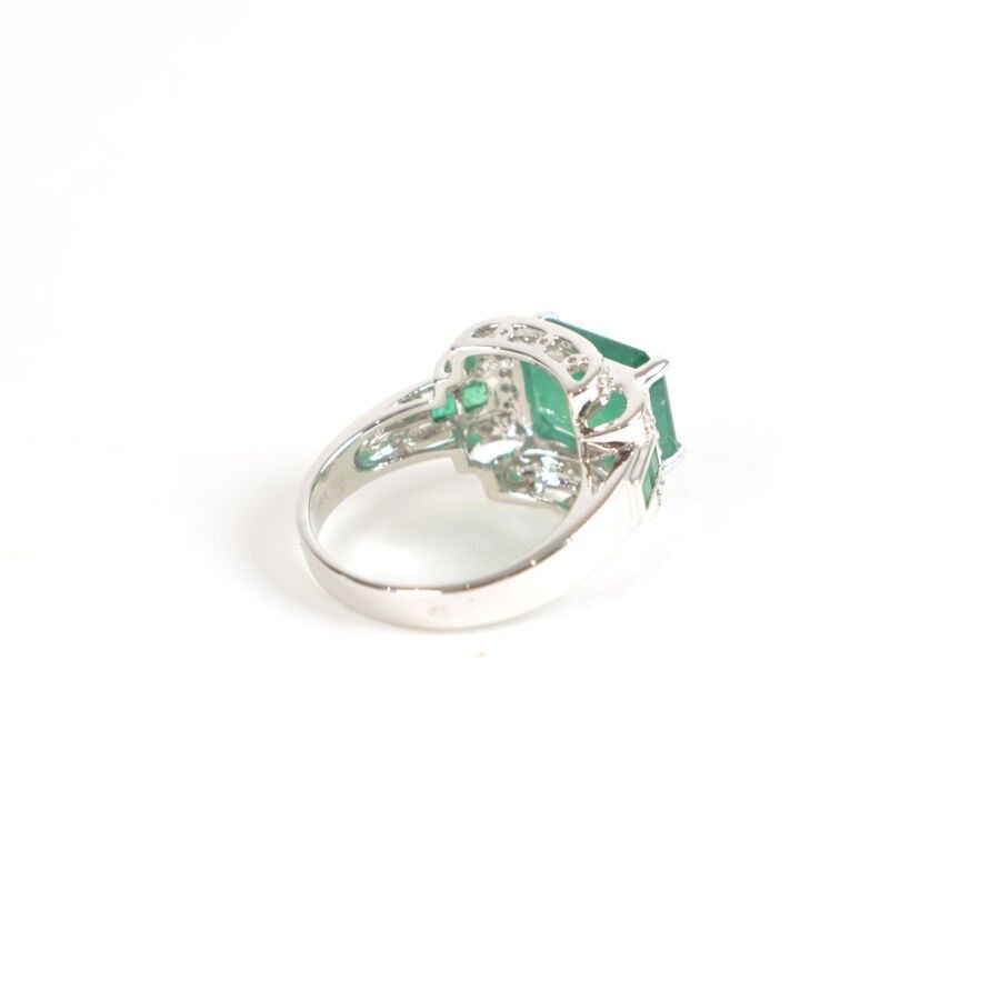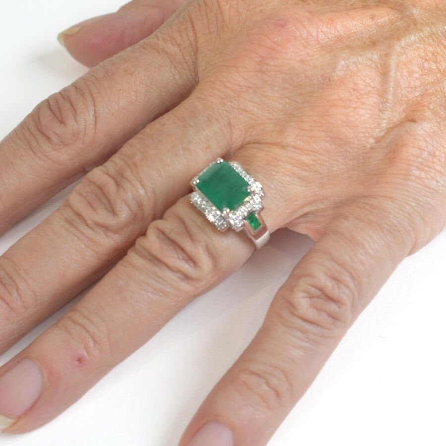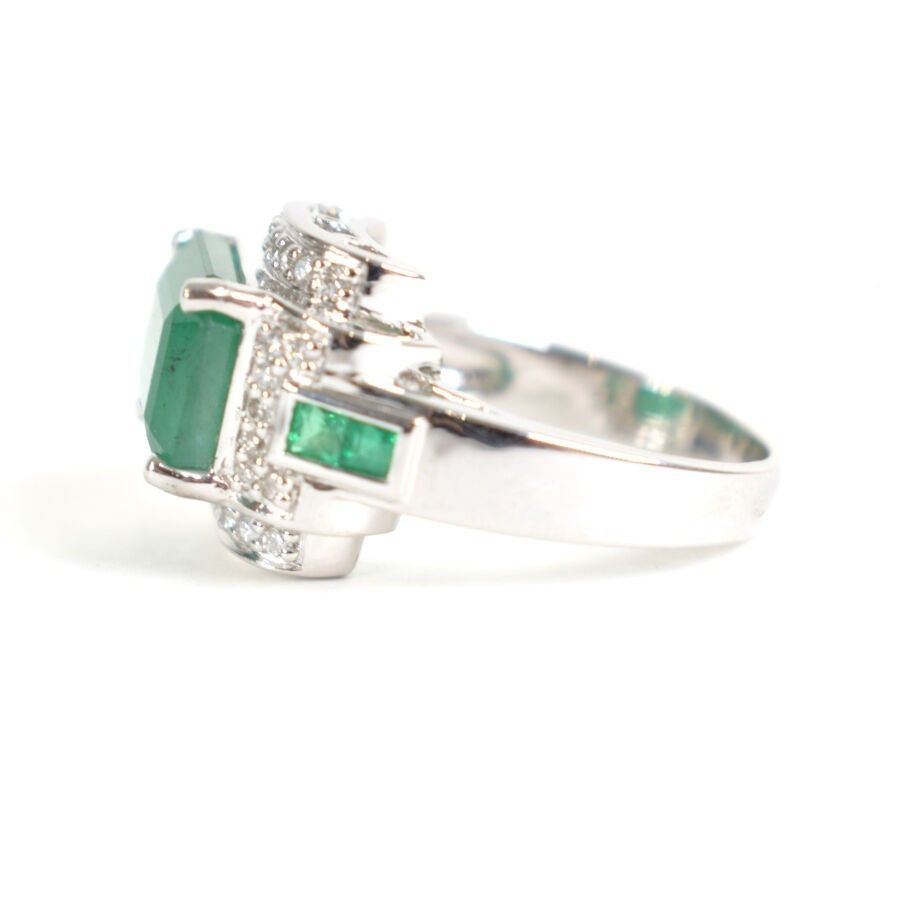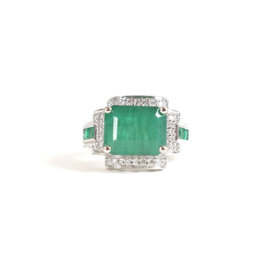 18K (750/oo) white gold "Art Deco" style ring set with a Zambian emerald approx. 3.9 ct, surrounded by emeralds approx. 0.2 ct and modern-cut diamonds approx. 0.3 ct. TDD : 54. Gross weight: 6.9 g.