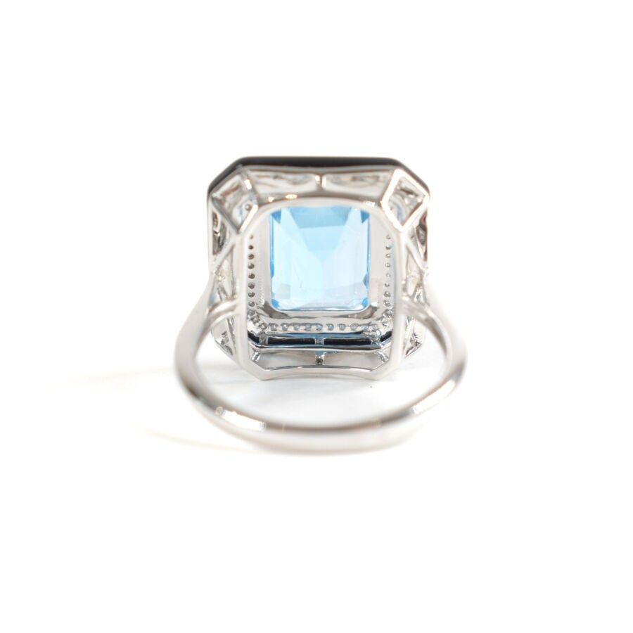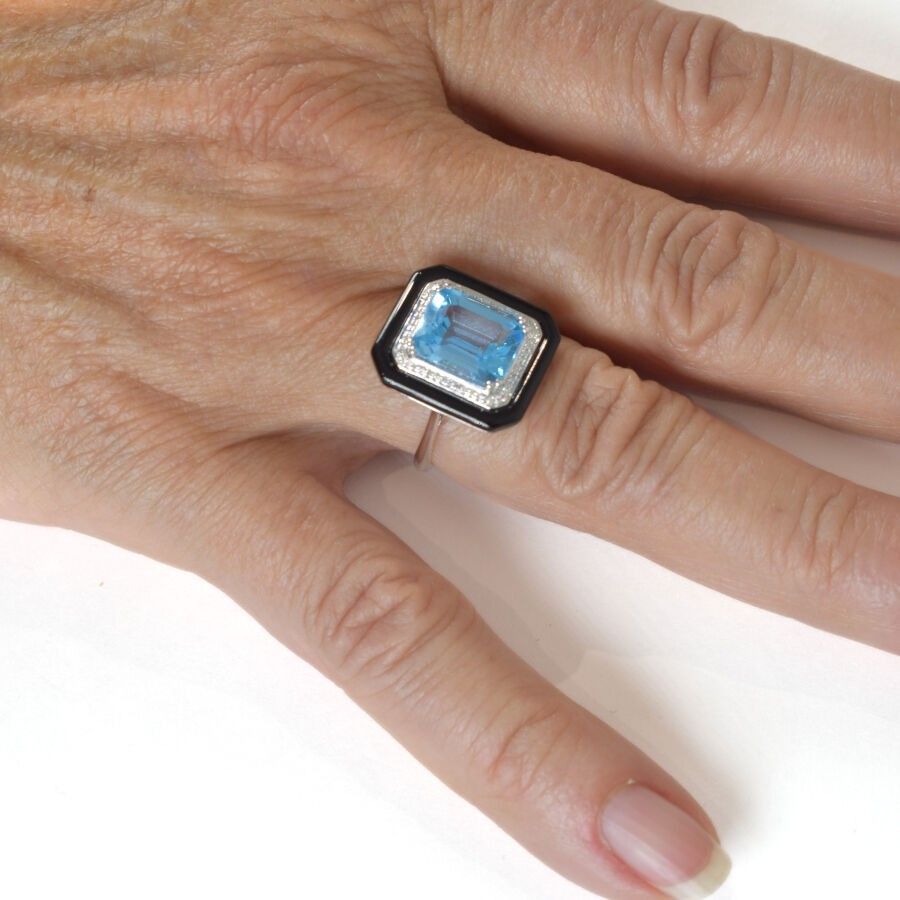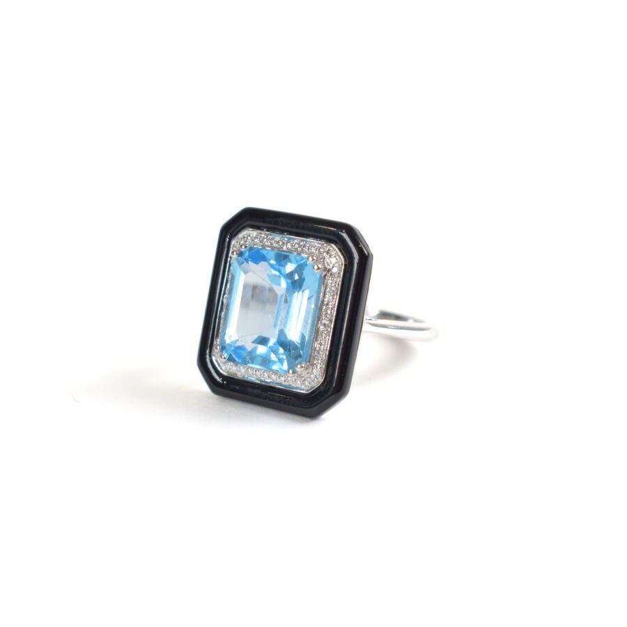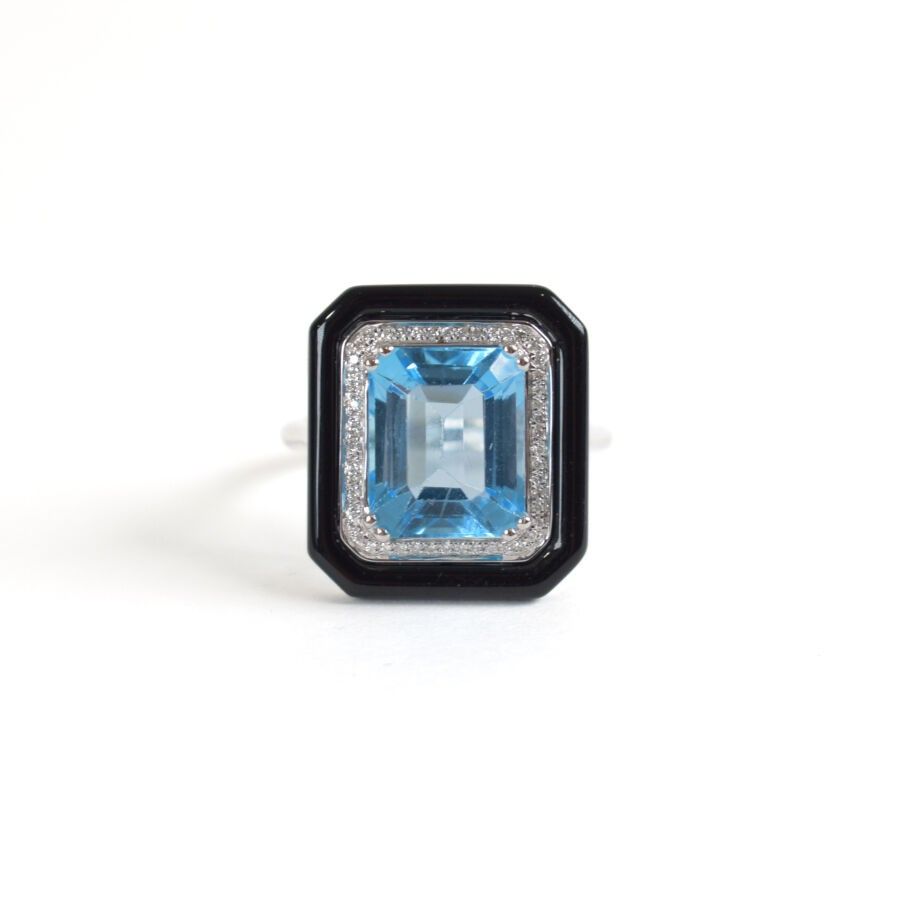 18K (750/oo) white gold "Art Déco" style ring set with a beautiful emerald-cut topaz, approx. 5.6 ct, in a double setting of diamonds (approx. 0.1 ct) and black agate (approx. 2.3 ct). TDD: 54. Gross weight: 5.5 g.