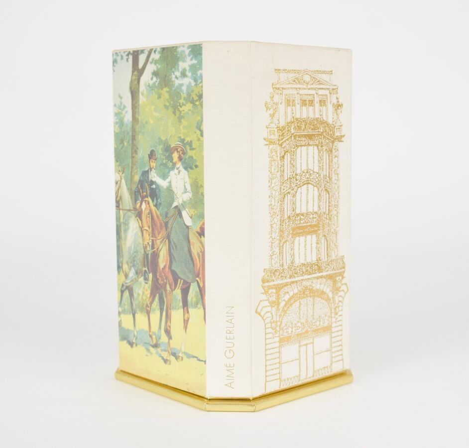 GUERLAIN: "Guerlinade", 50 ml colourless glass bottle, "Vase Tibétain" model, presented in its luxury illustrated embossed cardboard box, original fragrance partly used up.