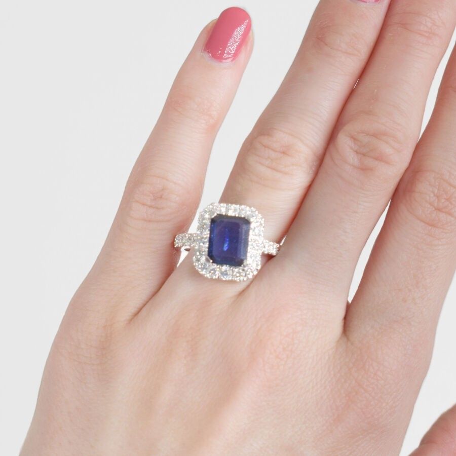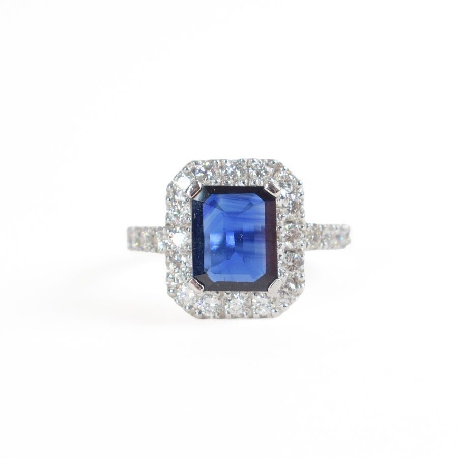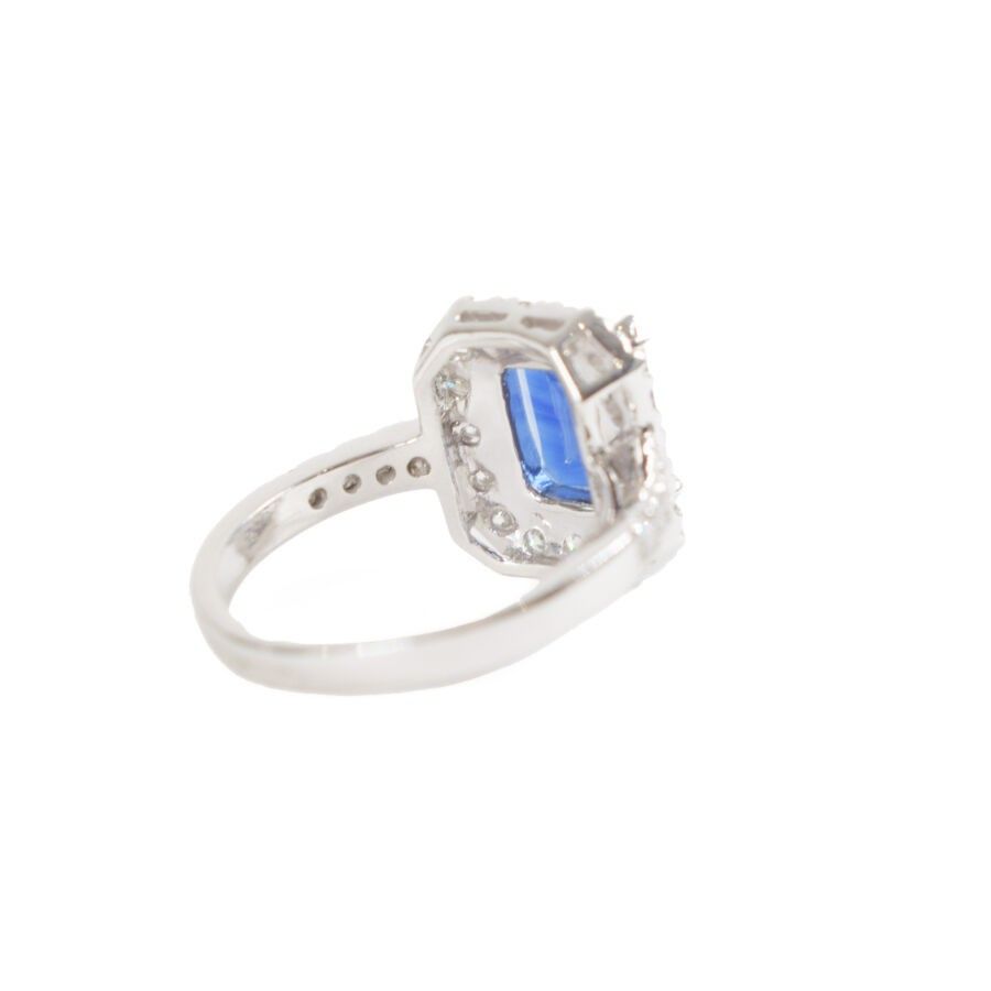 Art Deco" style ring in 18K (750/oo) white gold set with an emerald-cut sapphire weighing approx. 2 ct in a surround of diamonds weighing approx. 1 ct. TDD: 55. Gross weight: 6.88 g.