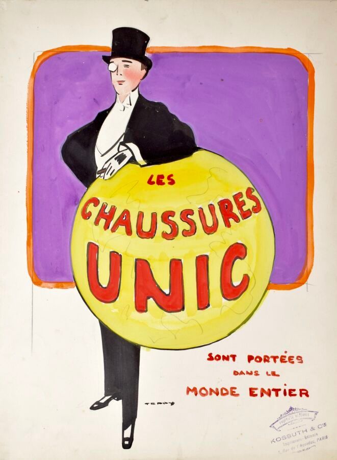 His advertising designs covered a wide range of fields: catering, millinery, fashion, footwear, optics and tyres. They are usually signed with his pseudonym "Teddy" or accompanied by a studio stamp "Edouard Saunier, dessins artistiques" or a stamp with the ES monogram. Brands include hatters Henry, Léon and Rochet, toy shop Le Paradis des Enfants, UNIC shoes, Caveryrac and Raoul, Maignen filters, Wolber and Lucifer tyres, and tailors Boka, Dewachter, Lejeune and Libby.