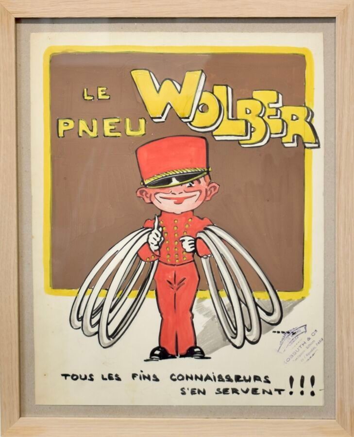 Edouard SAUNIER (1885-1918), "Le Pneu Wolber", watercolour and gouache on heavy paper, signed lower right, framed, 40 x 30 cm.