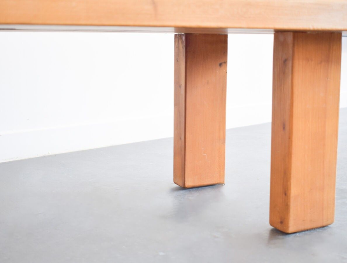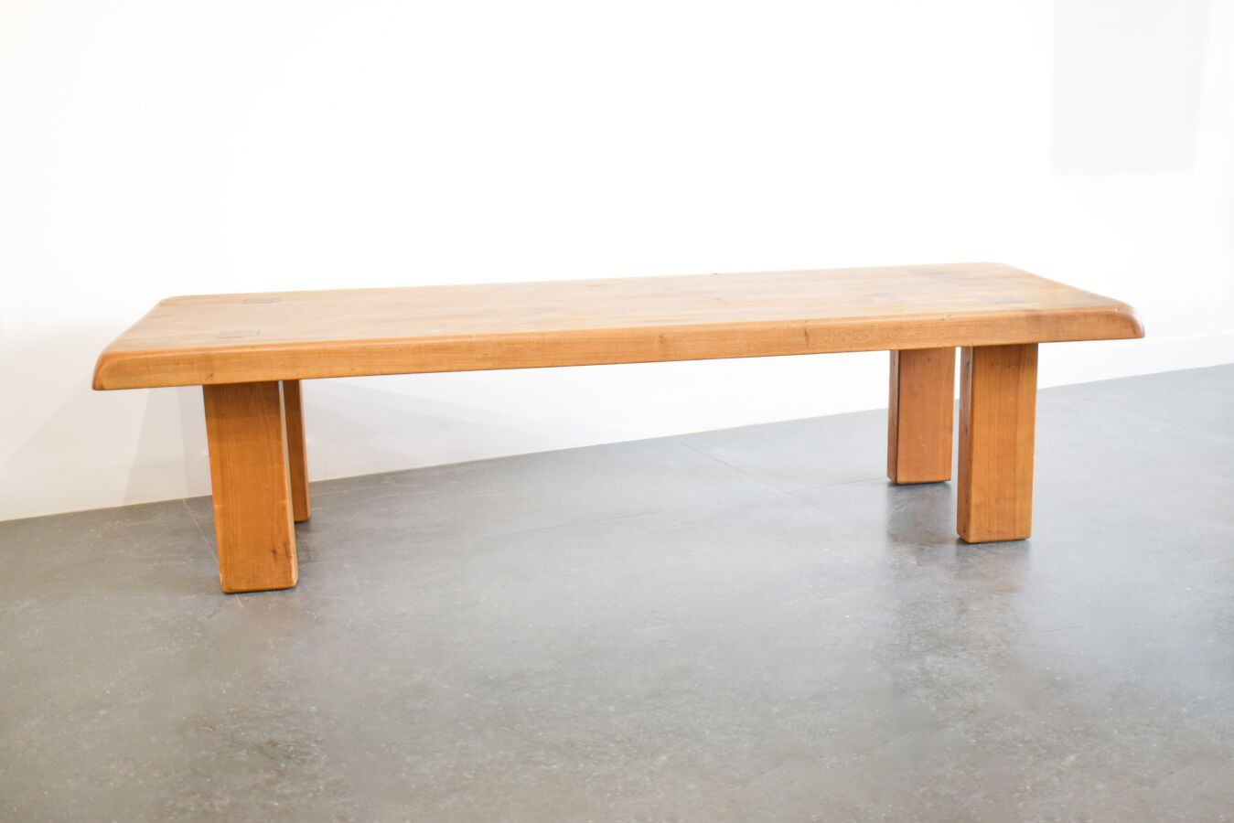 Pierre CHAPO (1927-1987): "T08" model table in solid elm, with a rectangular top supported by four square legs whose structure crosses the top in a traditional mortise and tenon assembly. Height 35 cm - Length 136 cm - Width 40 cm.