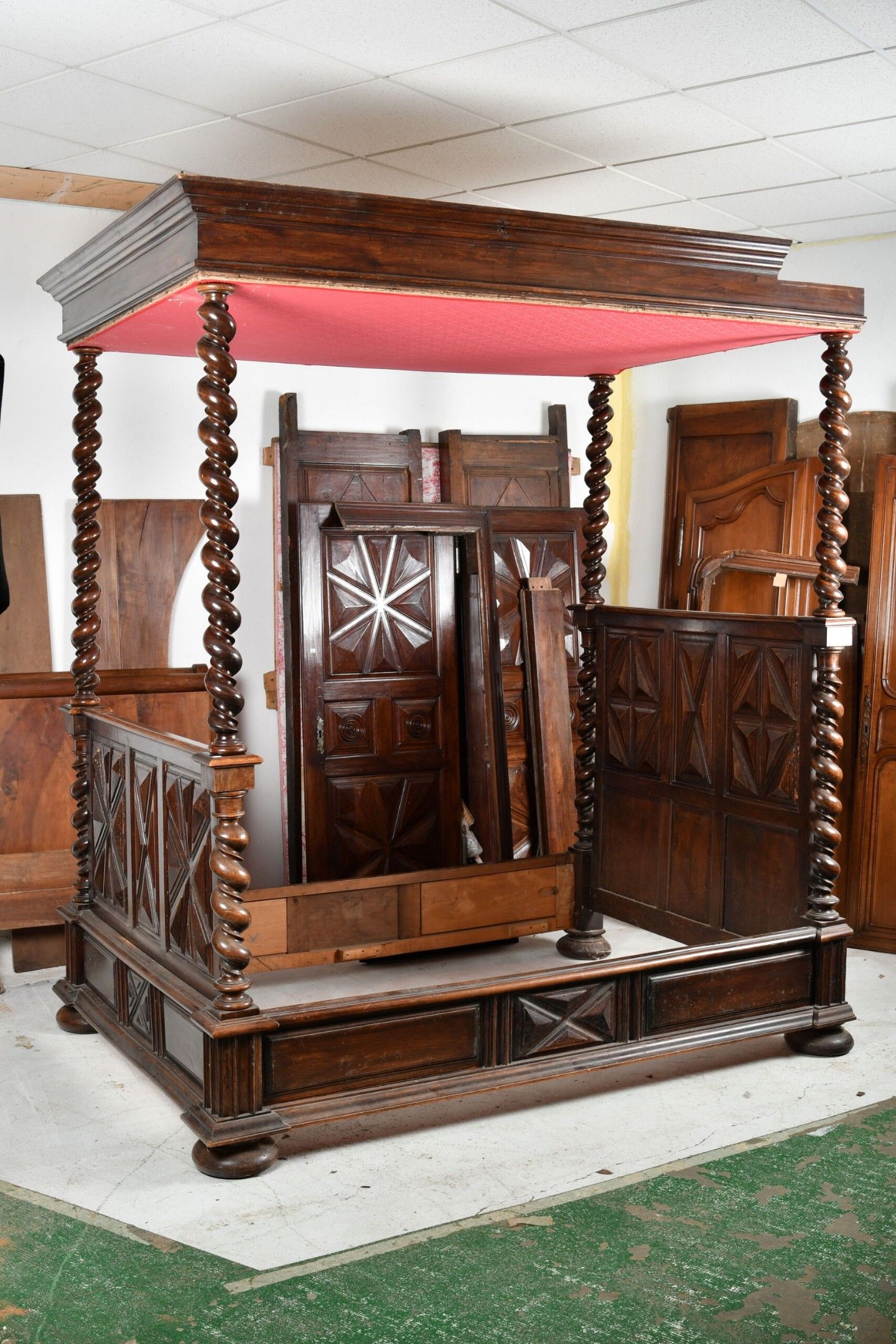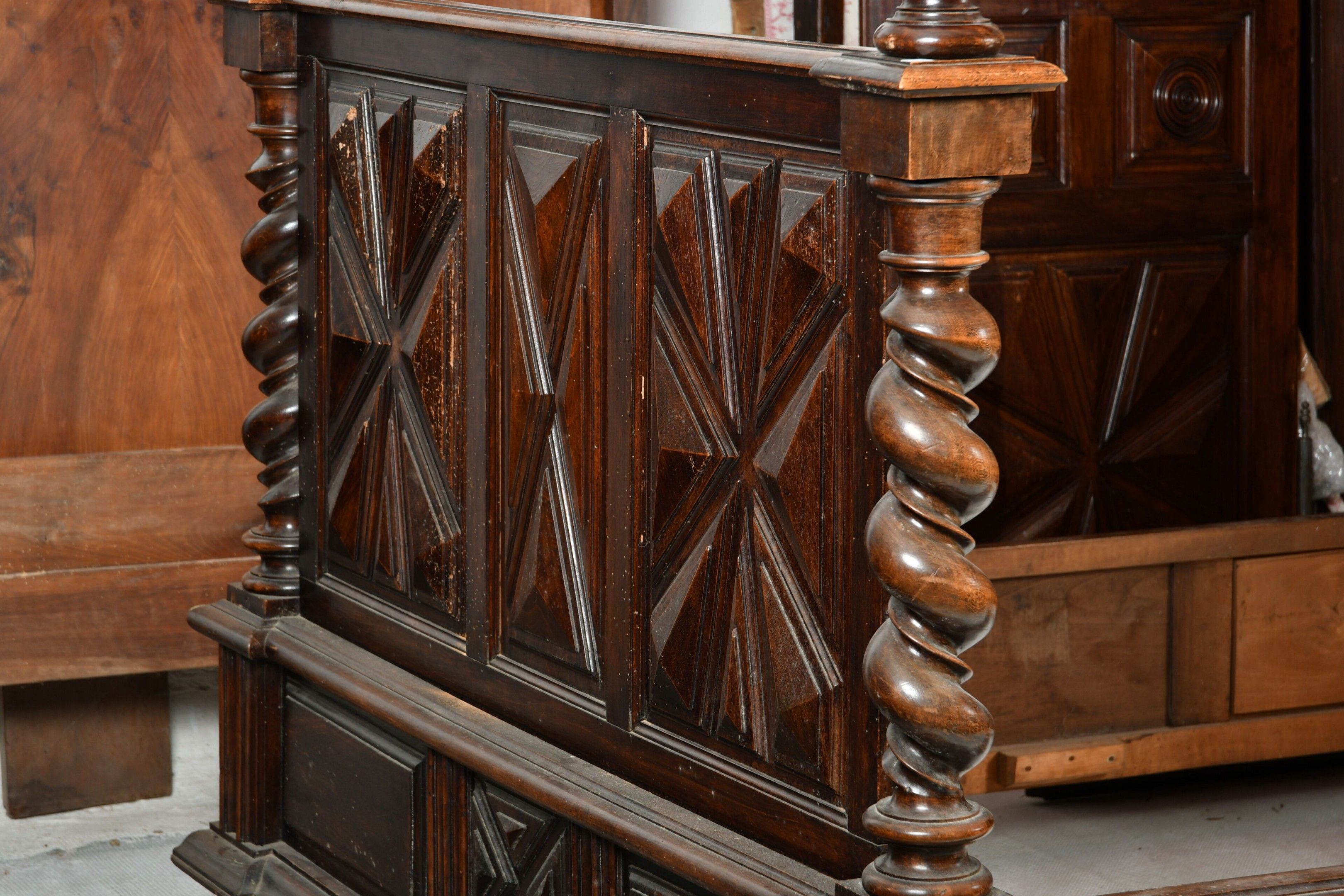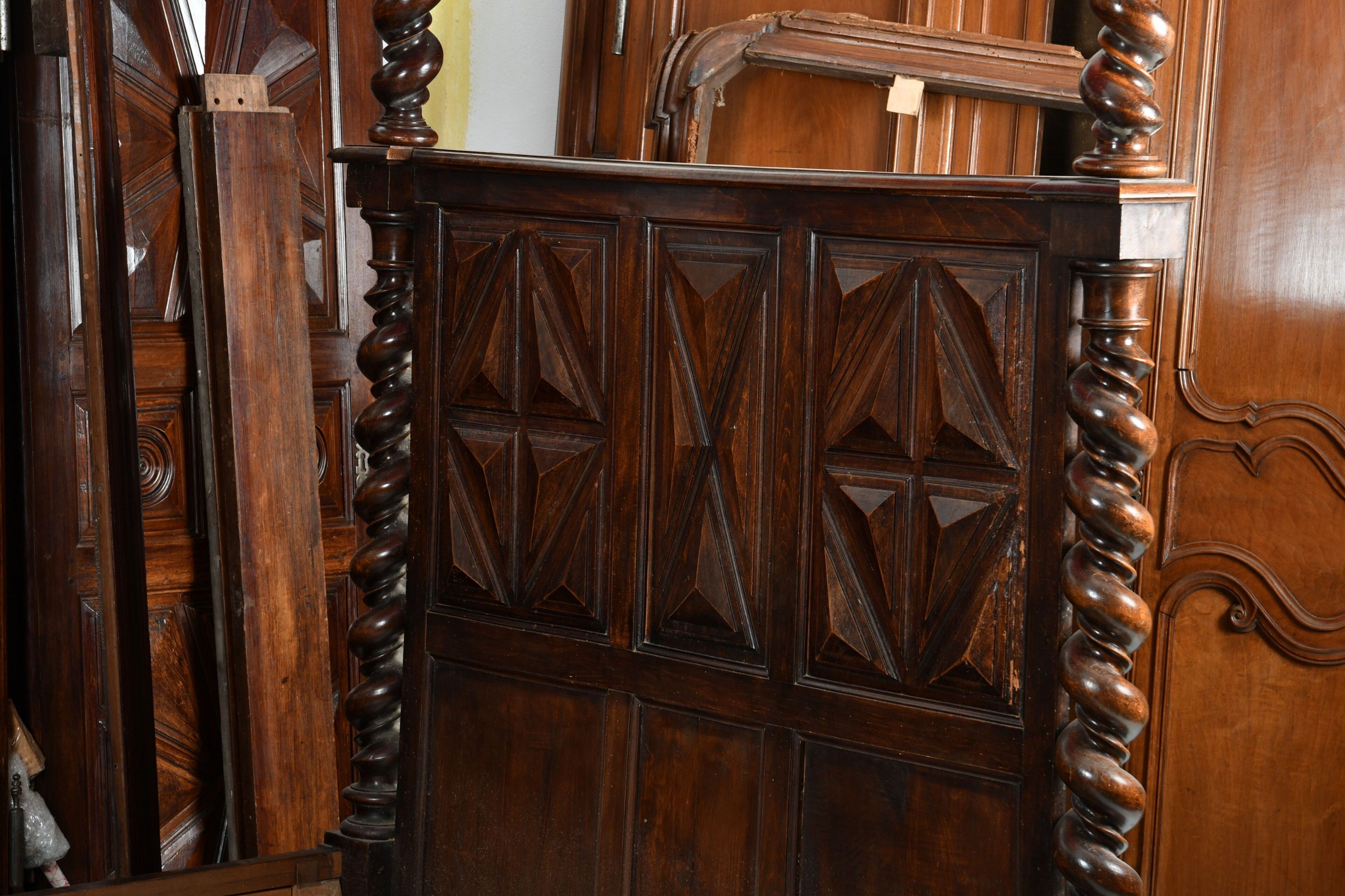 Walnut canopy bed with uprights and twisted base forming solomonic columns and supporting a moulded canopy. Diamond-point head and footboard. Louis XIII style, 19th century. H. 251 - W. 148 - D. 216 cm. Part of the canopy cut out to pass under a beam (the elements are present). Wear from use.