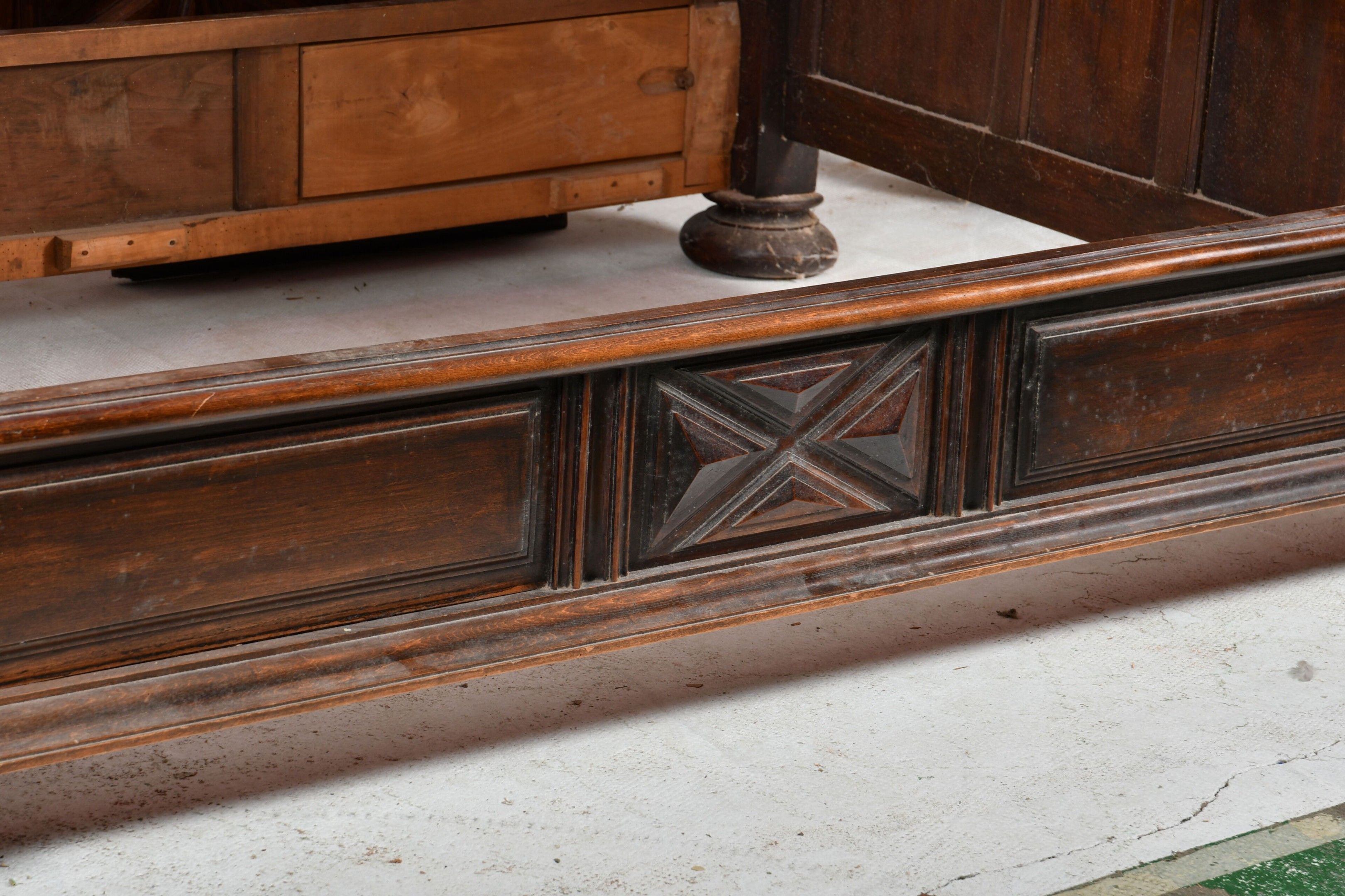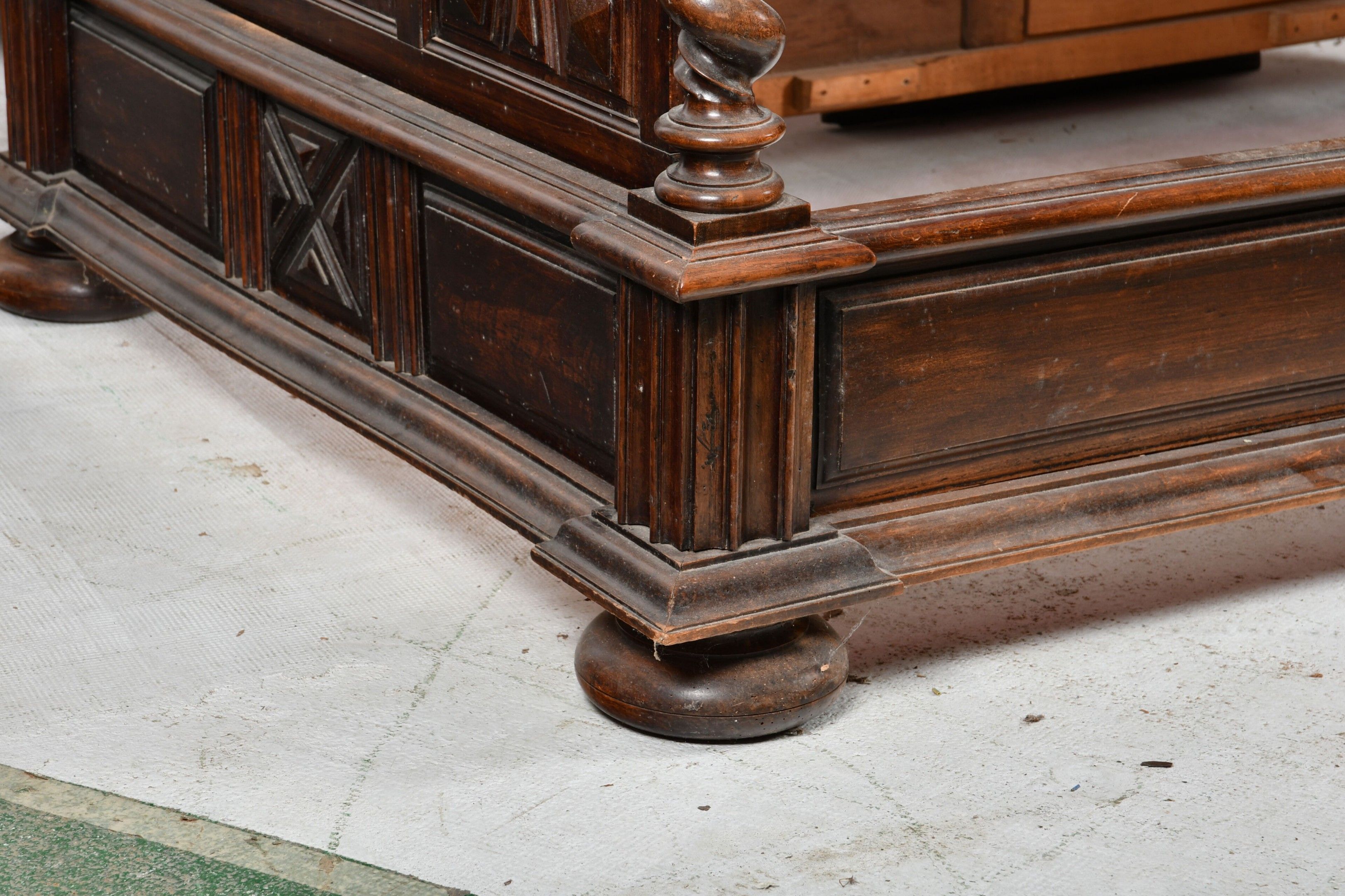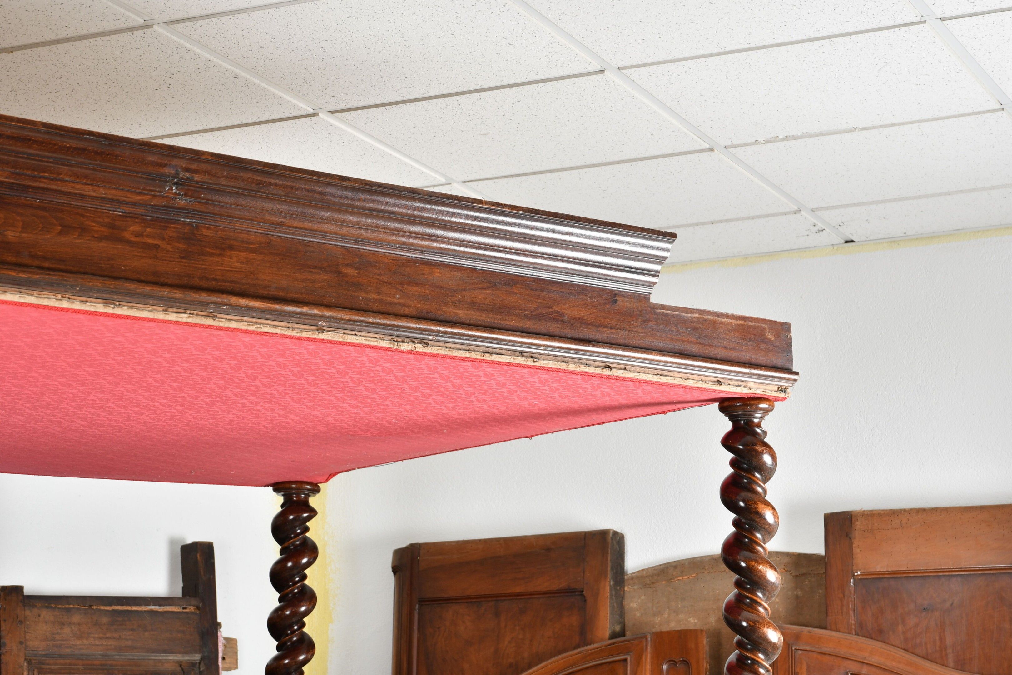 Walnut canopy bed with uprights and twisted base forming solomonic columns and supporting a moulded canopy. Diamond-point head and footboard. Louis XIII style, 19th century. H. 251 - W. 148 - D. 216 cm. Part of the canopy cut out to pass under a beam (the elements are present). Wear from use.