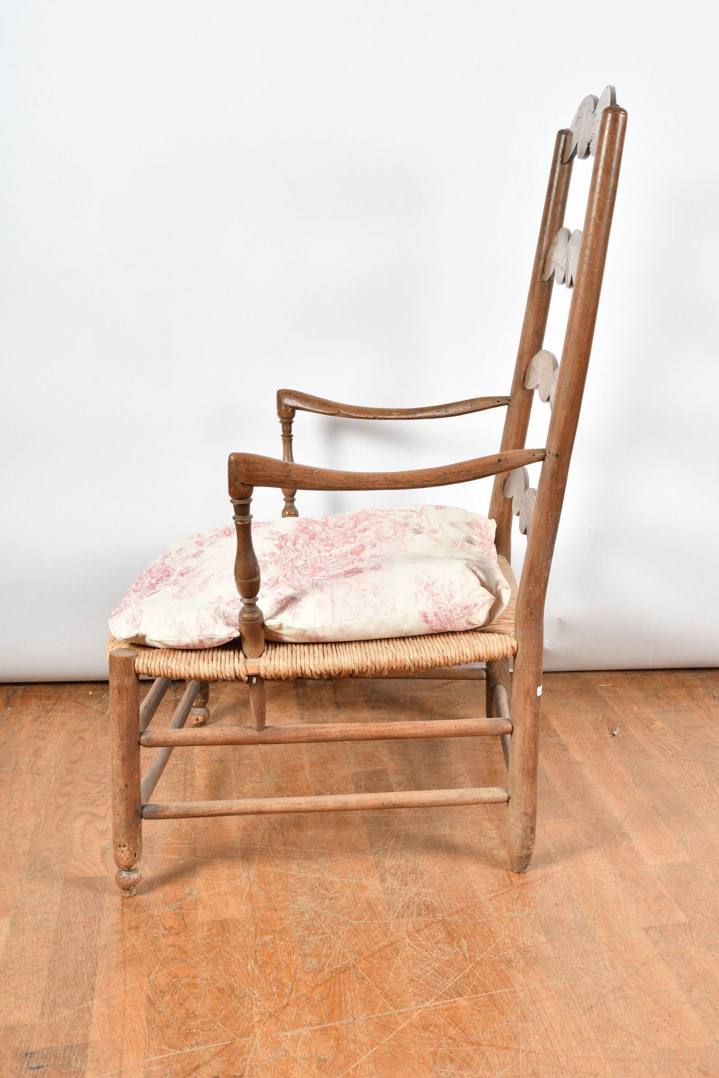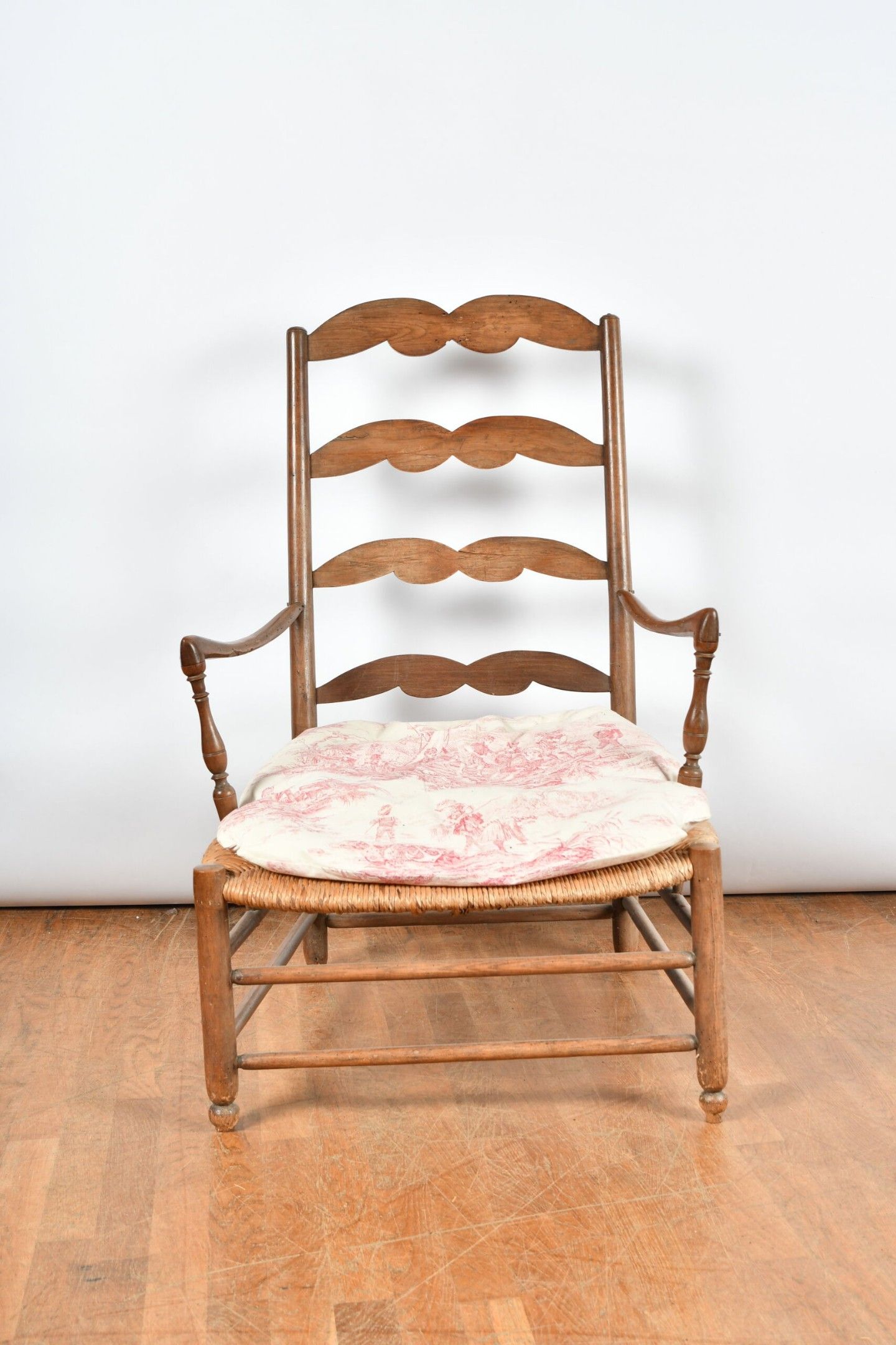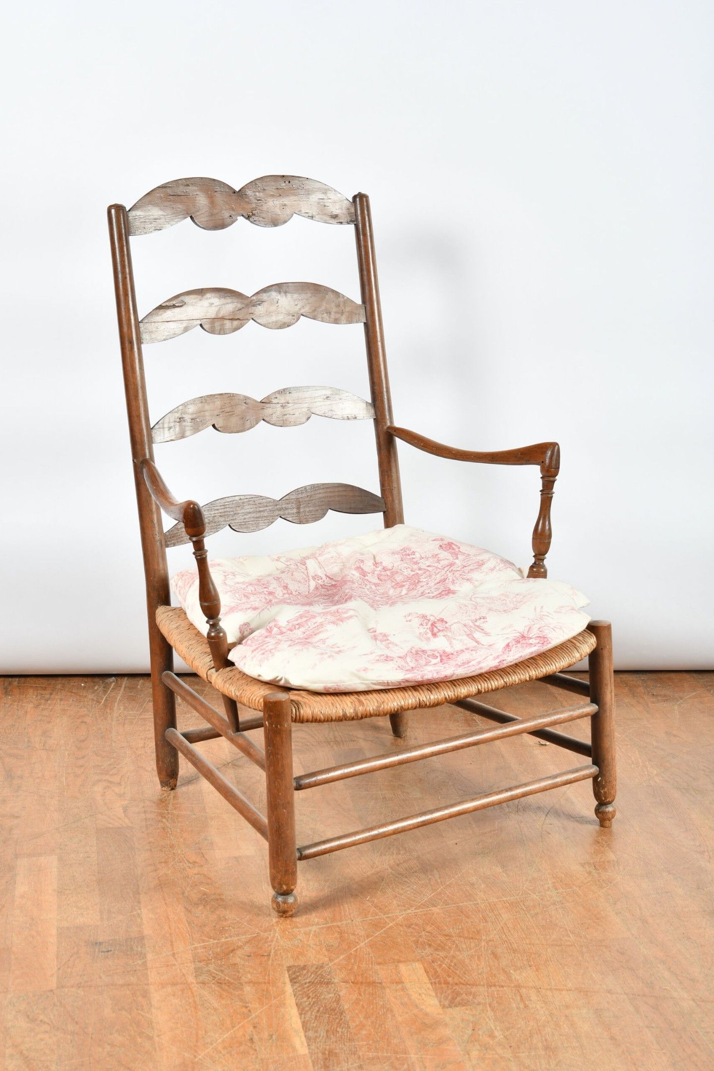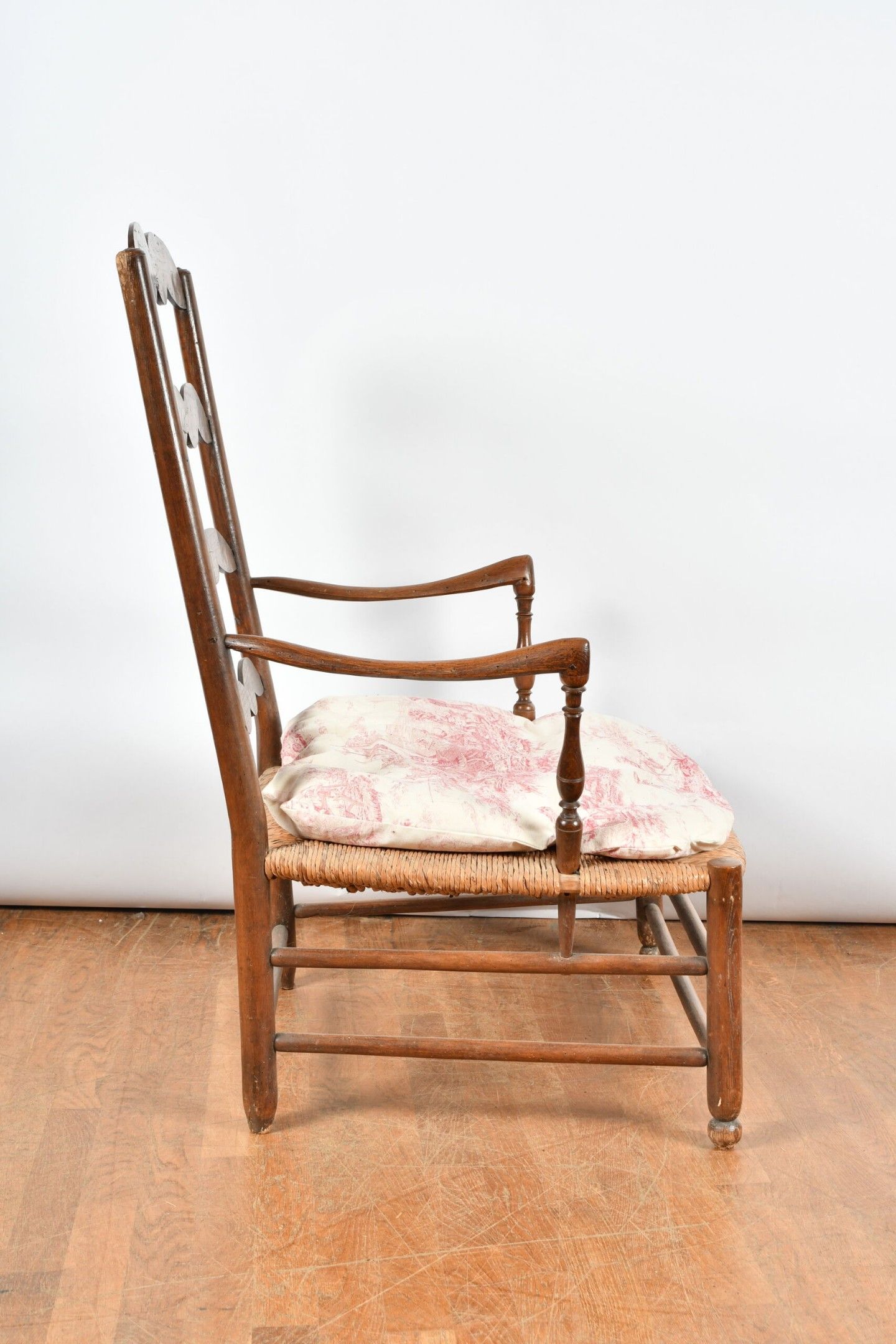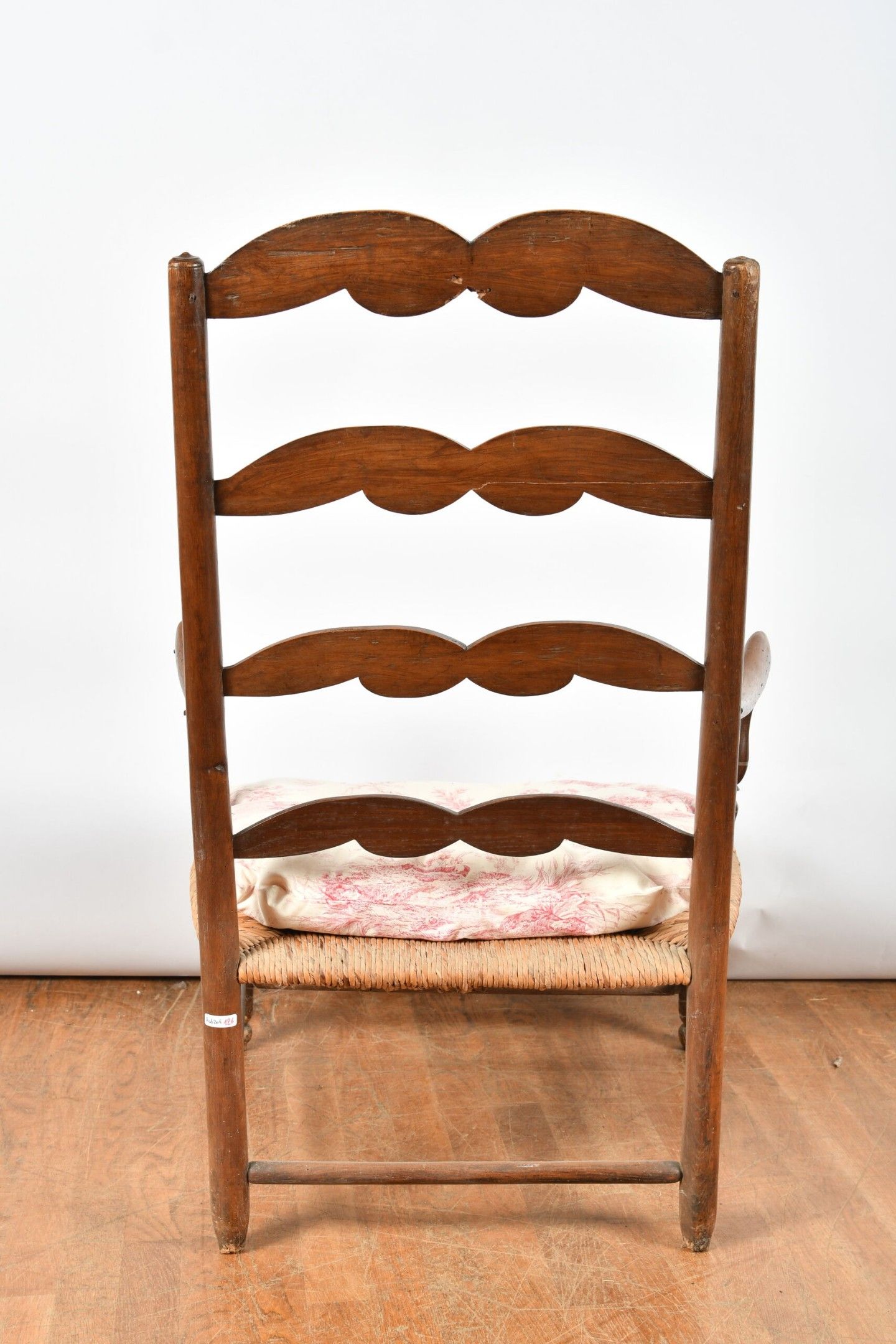A large armchair with a straw base; straight legs; curved bar back; arched armrests and baluster arm brackets. Regional work from the 19th century. H. 109 - W. 73 - D. 70 cm. Minor scratches and restorations