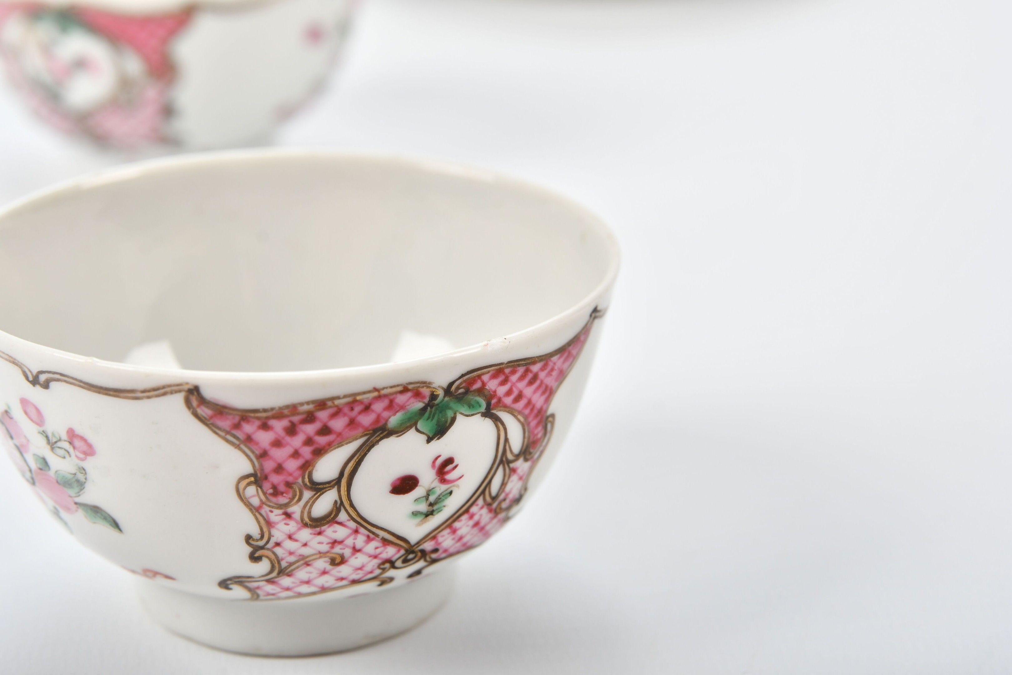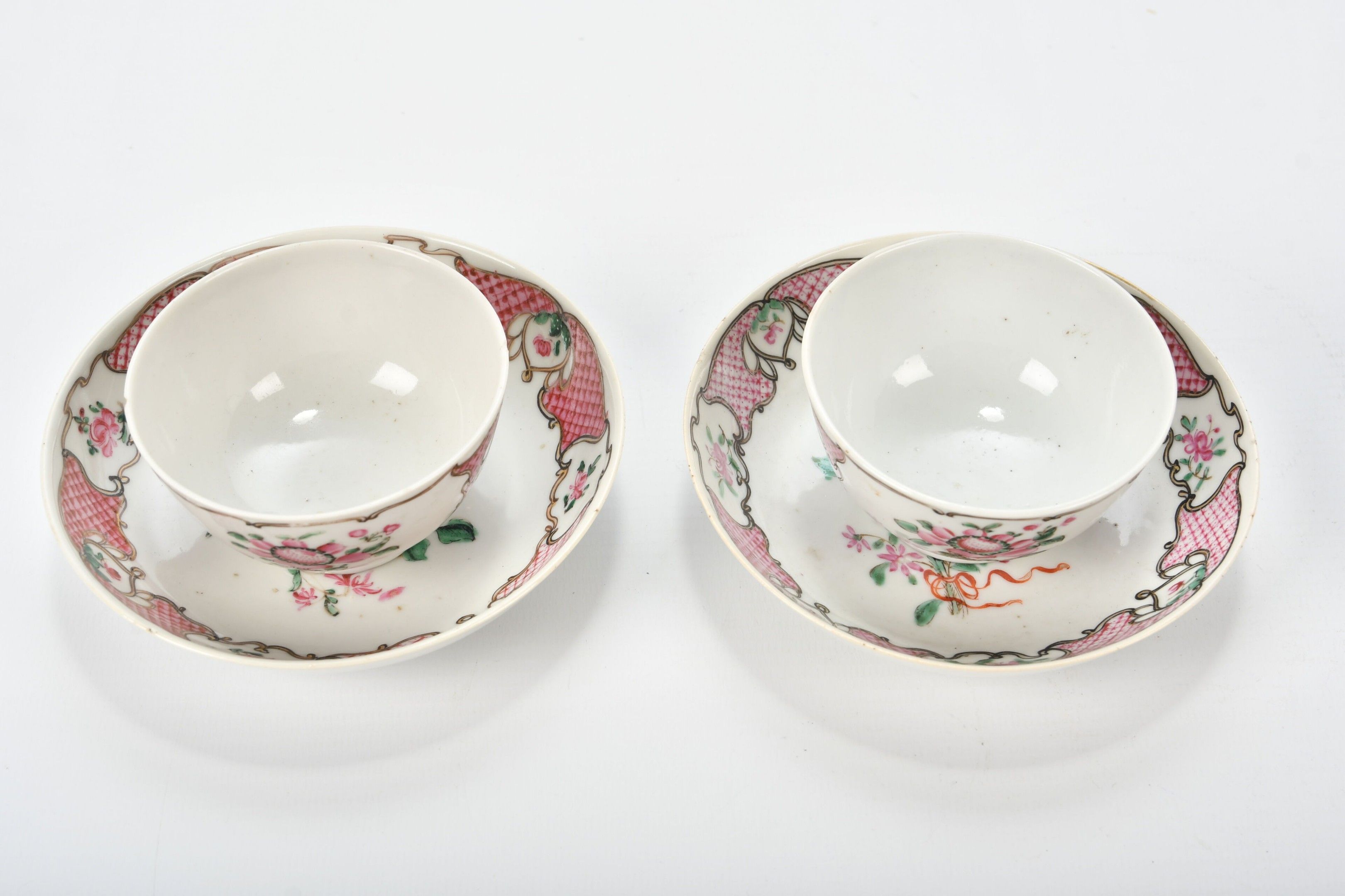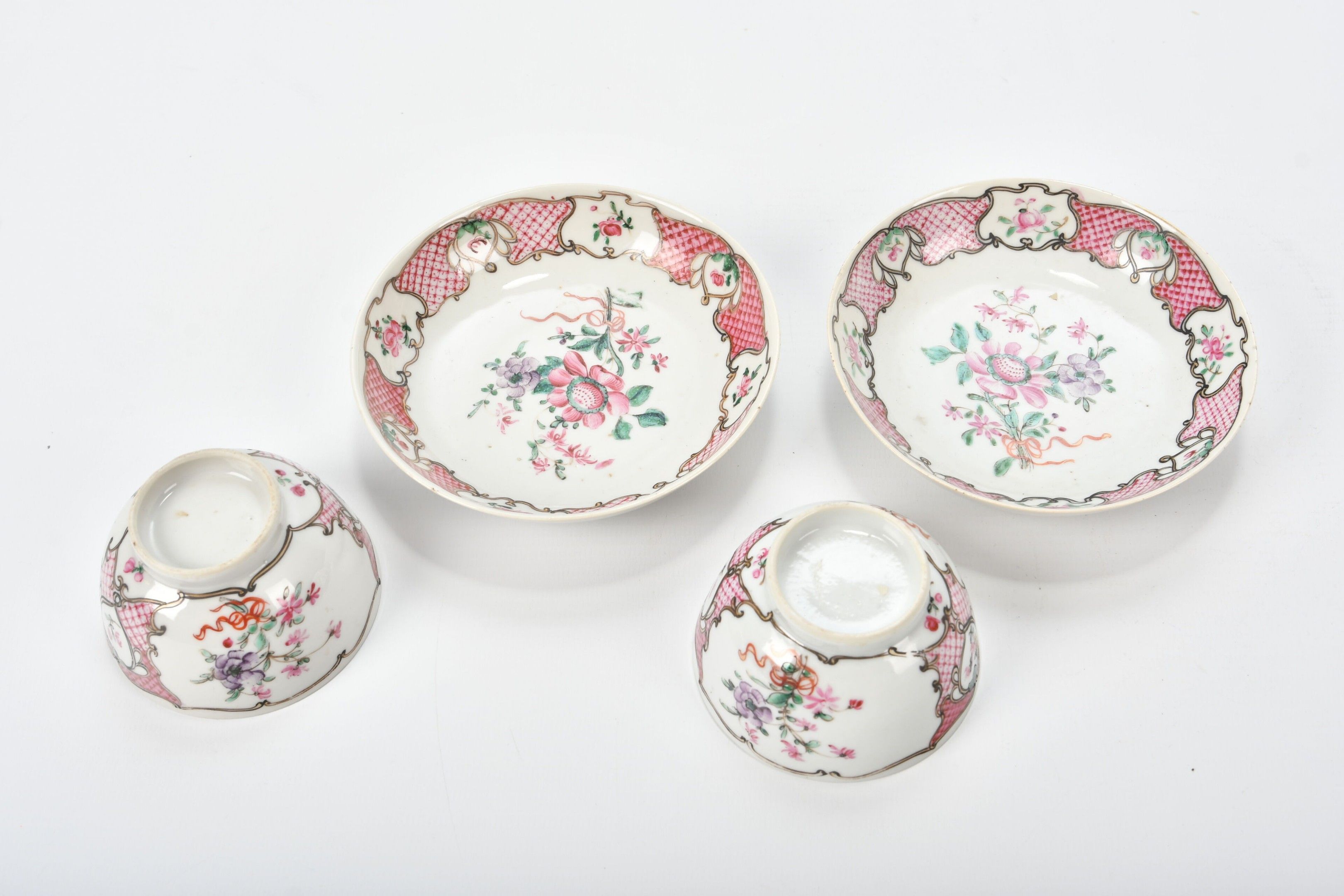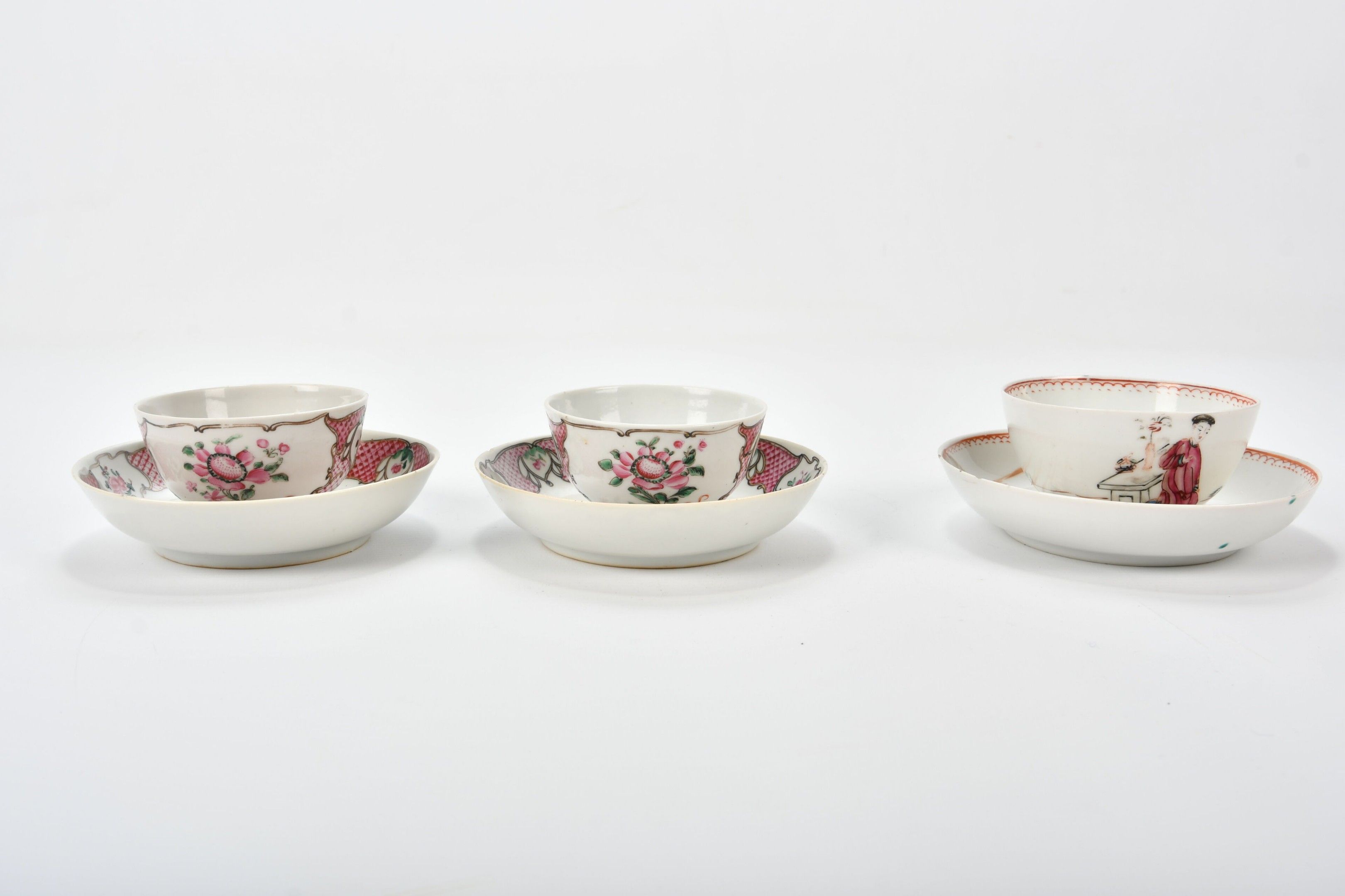 CHINA. COMPAGNIE des INDES 18th century. A suite of three porcelain Cups and saucers comprising a pair decorated with flowers in cartouches on a guilloche ground and a cup decorated with animated outdoor scenes. A small chip to one of the cups of the pair and a crack to the saucer of the cup alone.