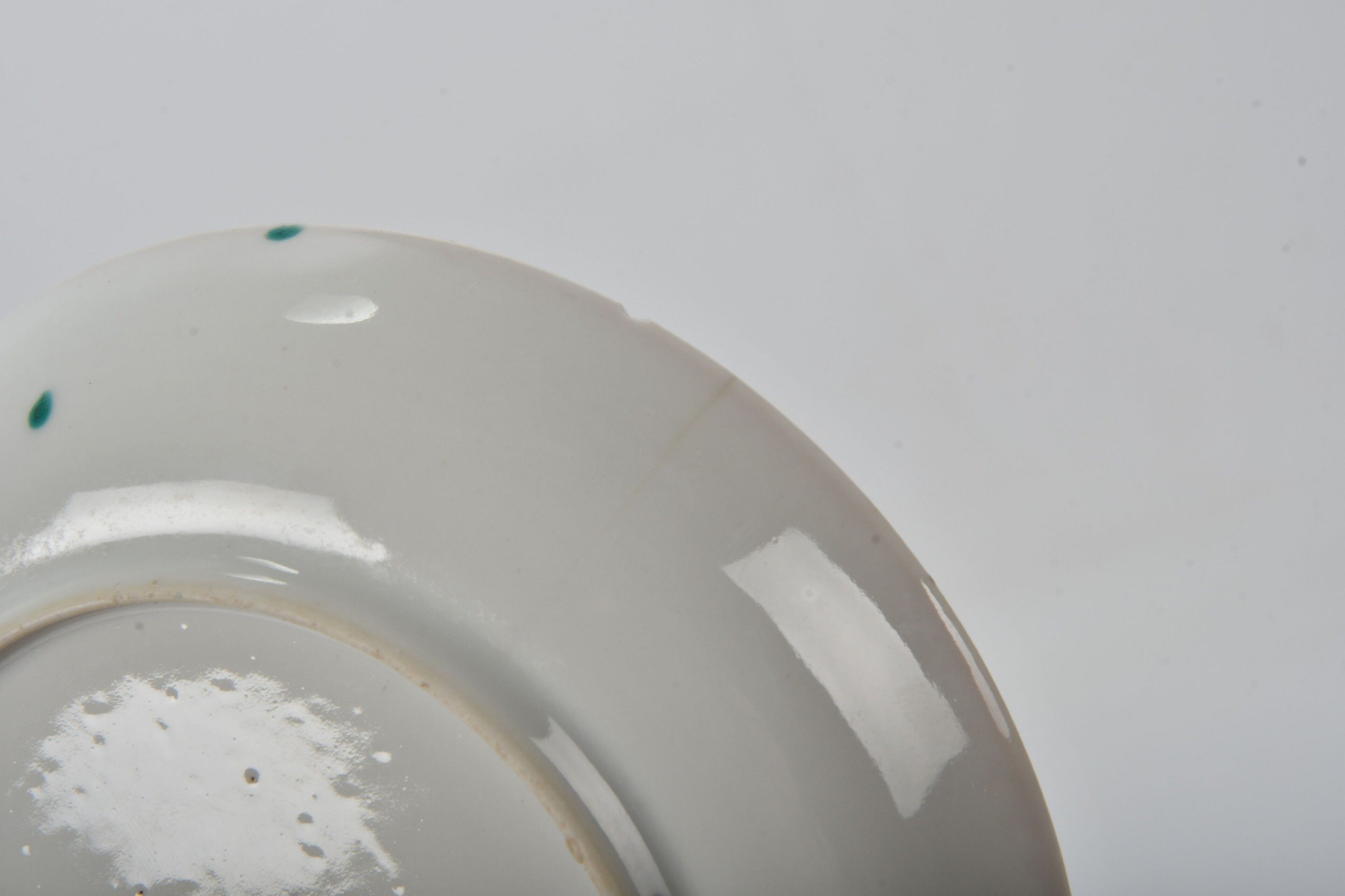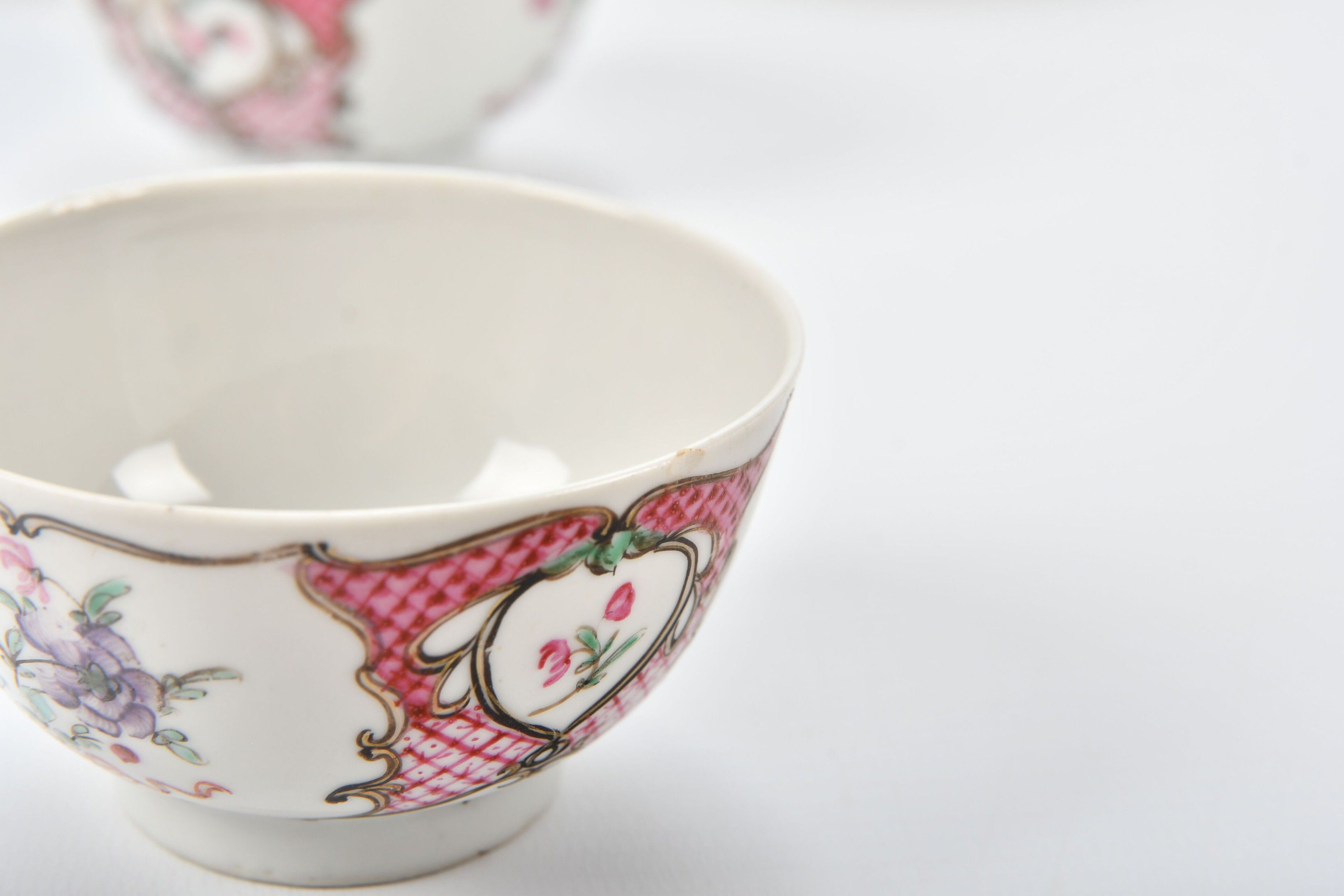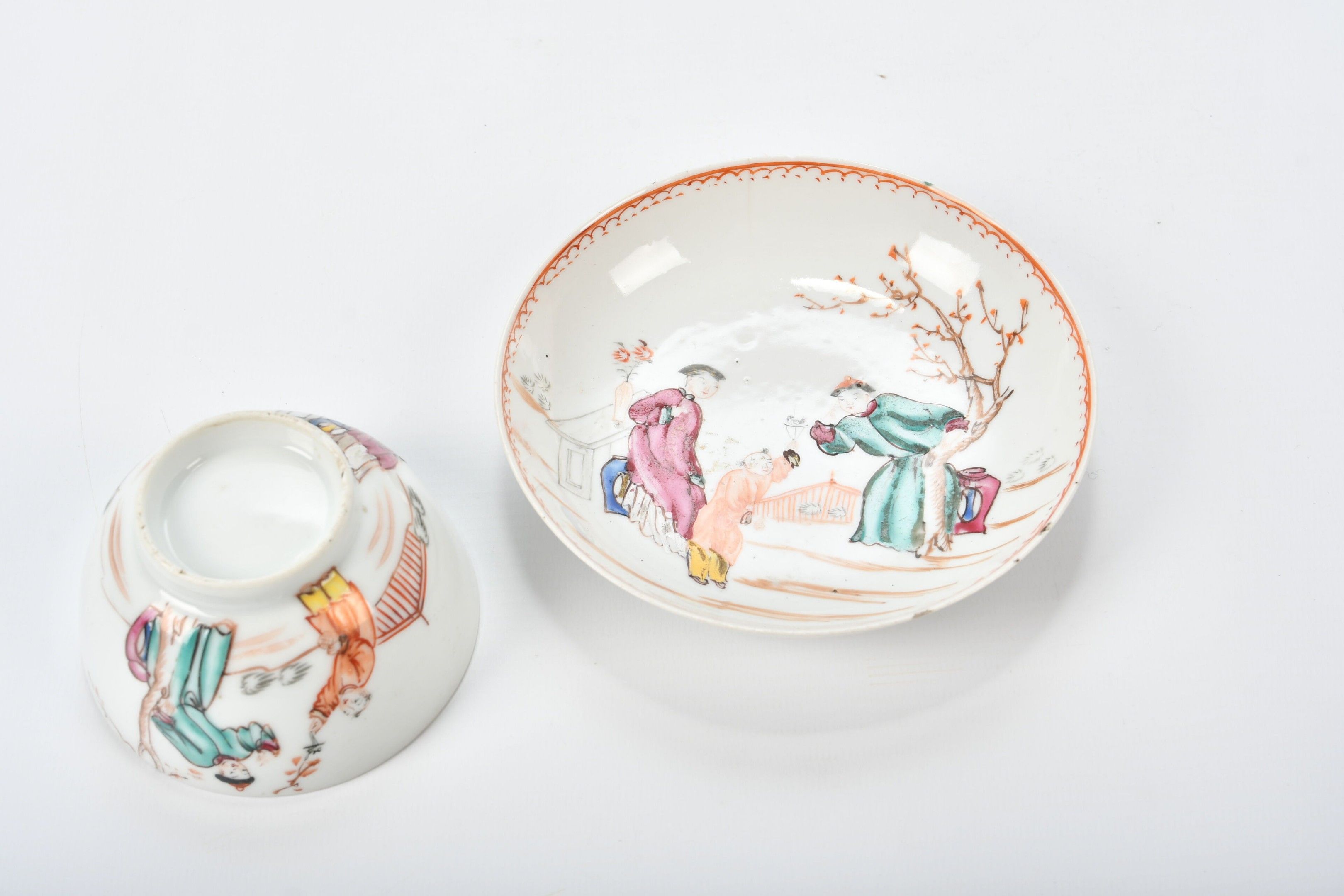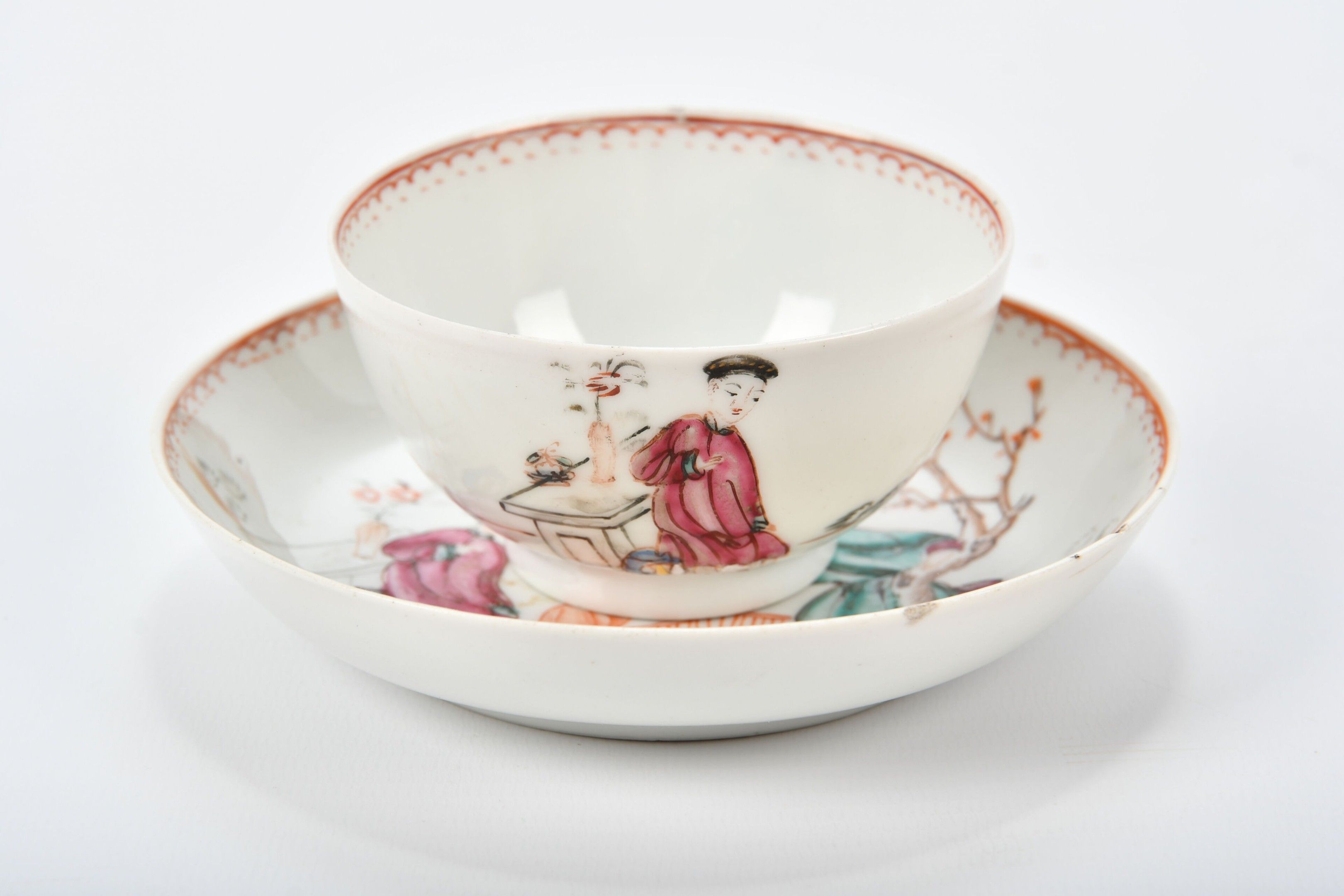 CHINA. COMPAGNIE des INDES 18th century. A suite of three porcelain Cups and saucers comprising a pair decorated with flowers in cartouches on a guilloche ground and a cup decorated with animated outdoor scenes. A small chip to one of the cups of the pair and a crack to the saucer of the cup alone.