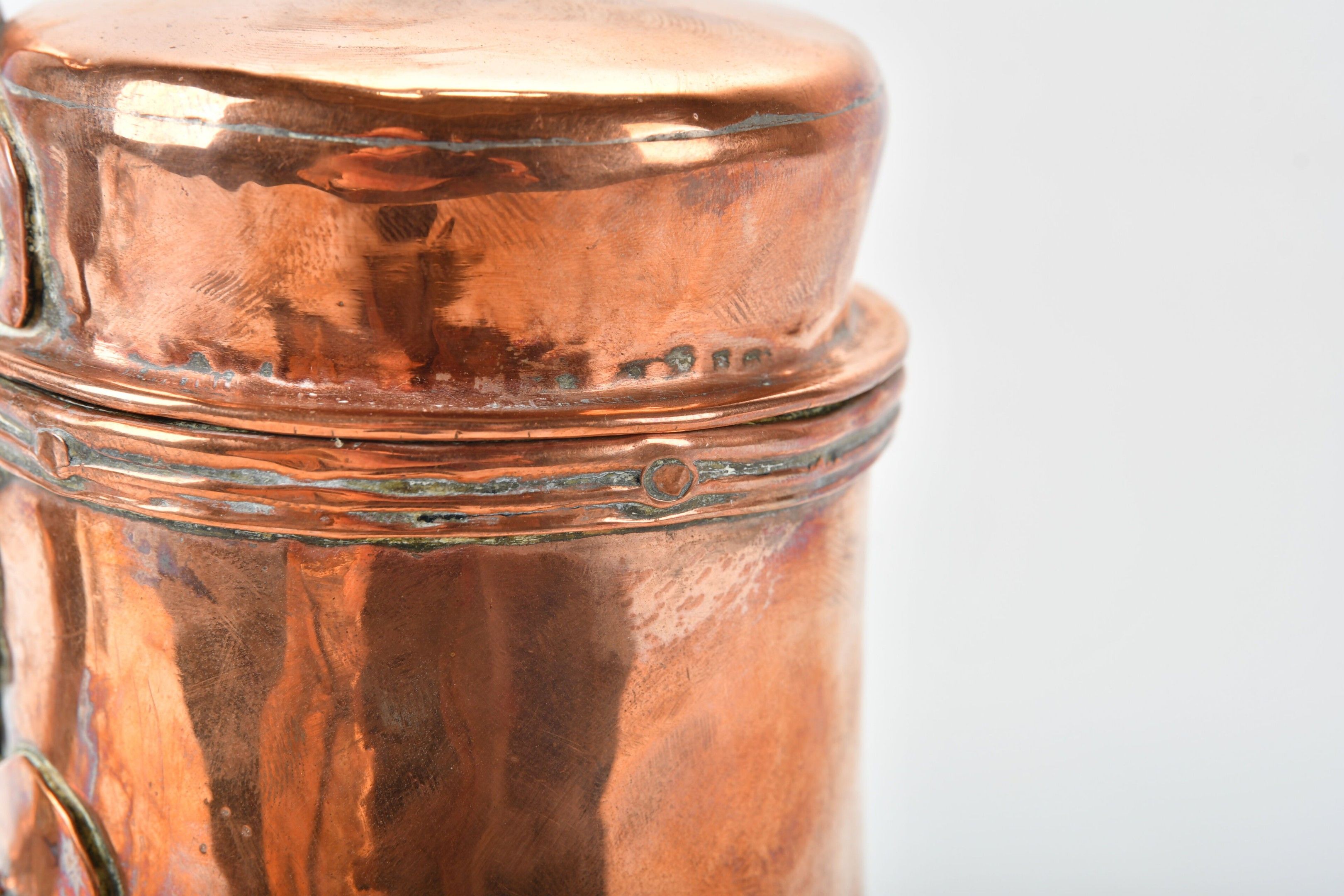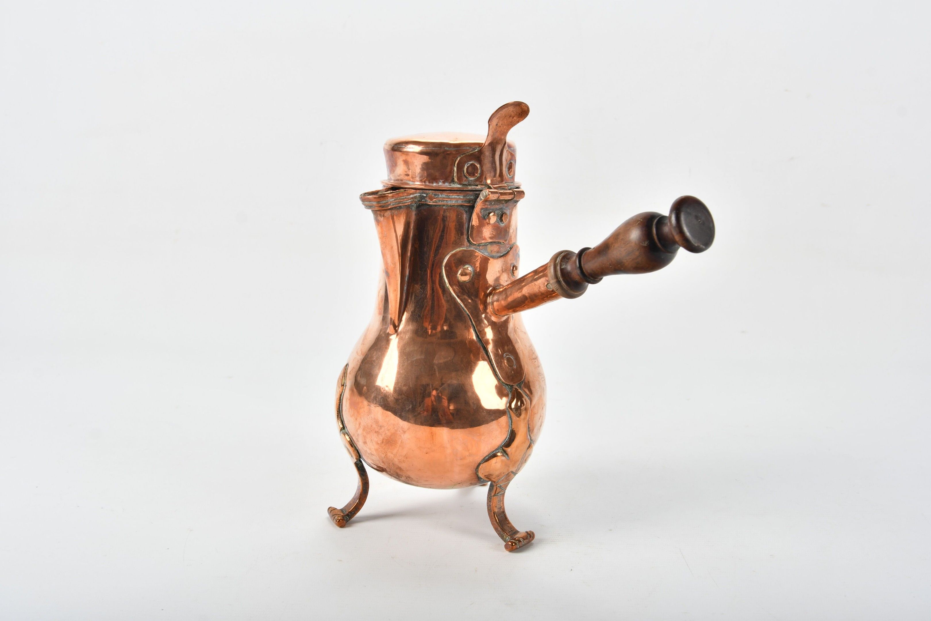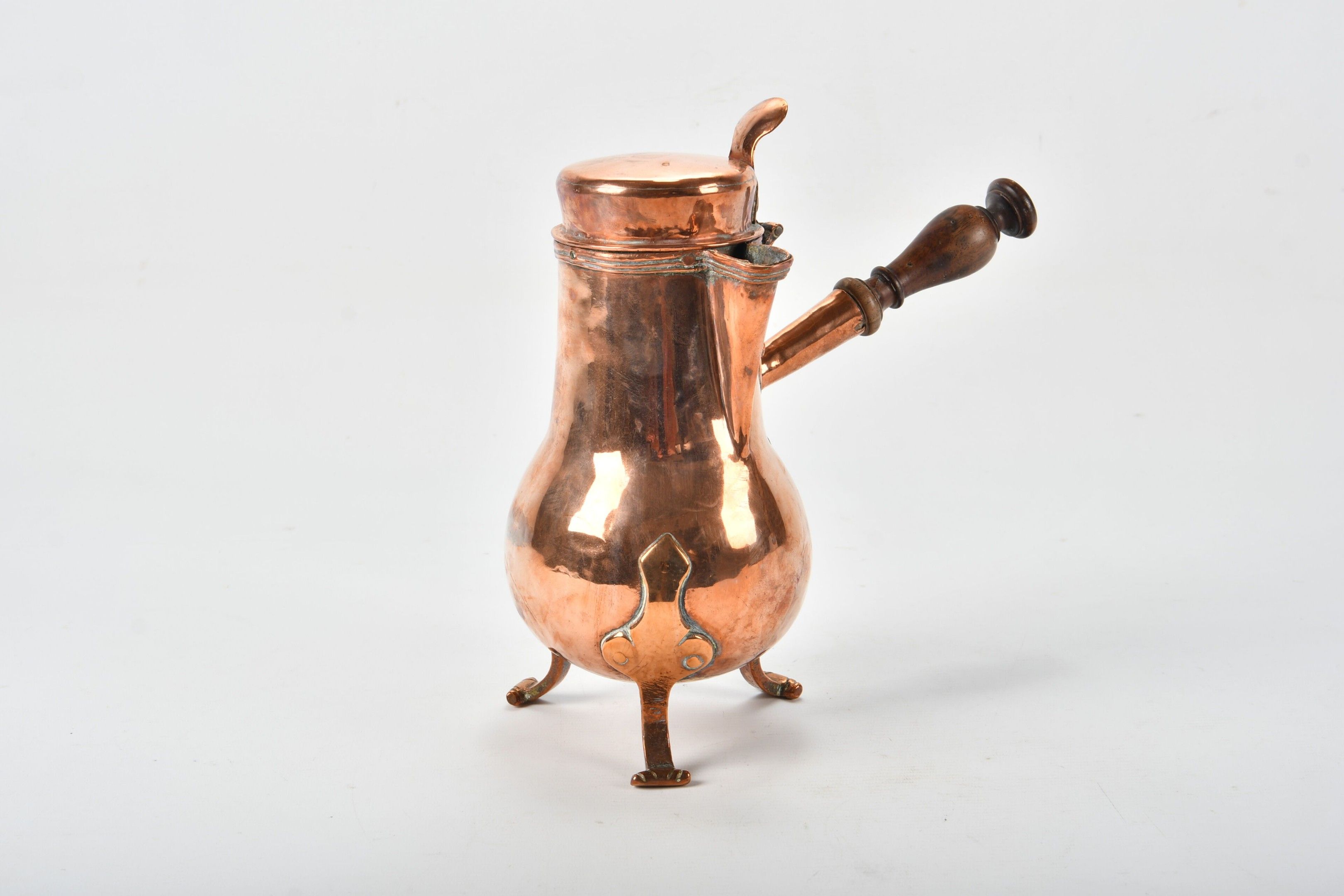 Copper VERSEUSE with turned wooden handle, tripod base.