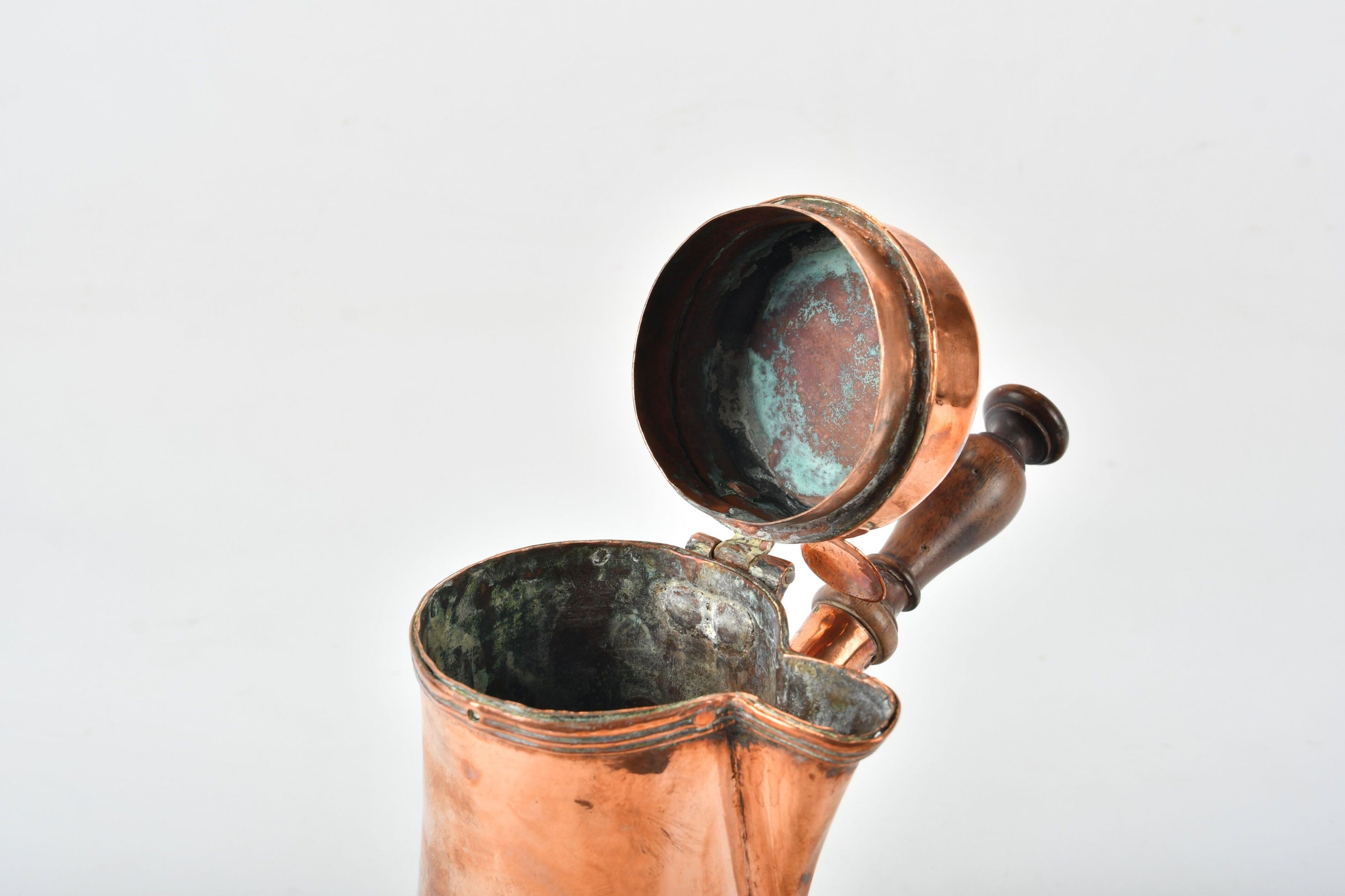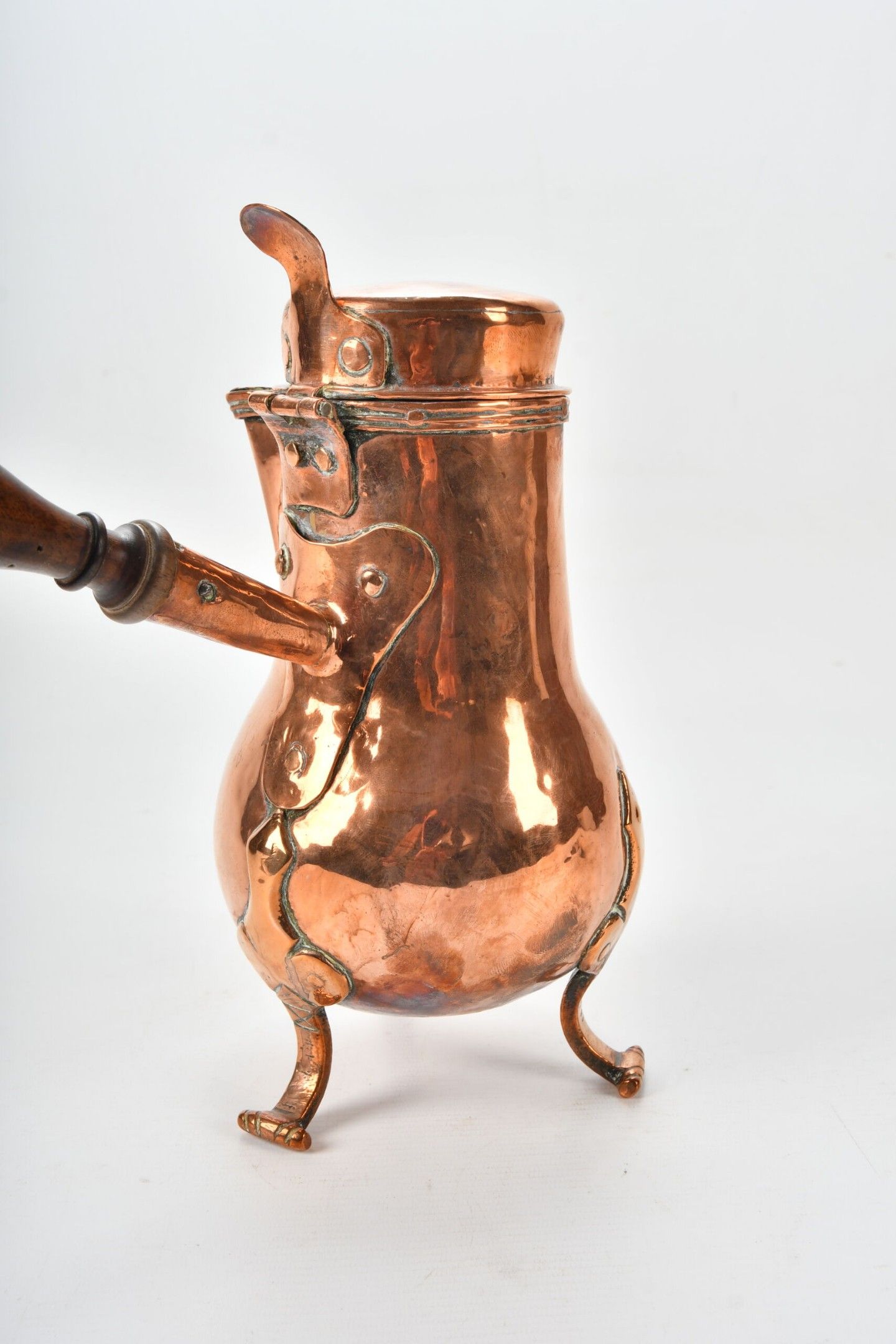 Copper VERSEUSE with turned wooden handle, tripod base. 18th century. Height 27 cm