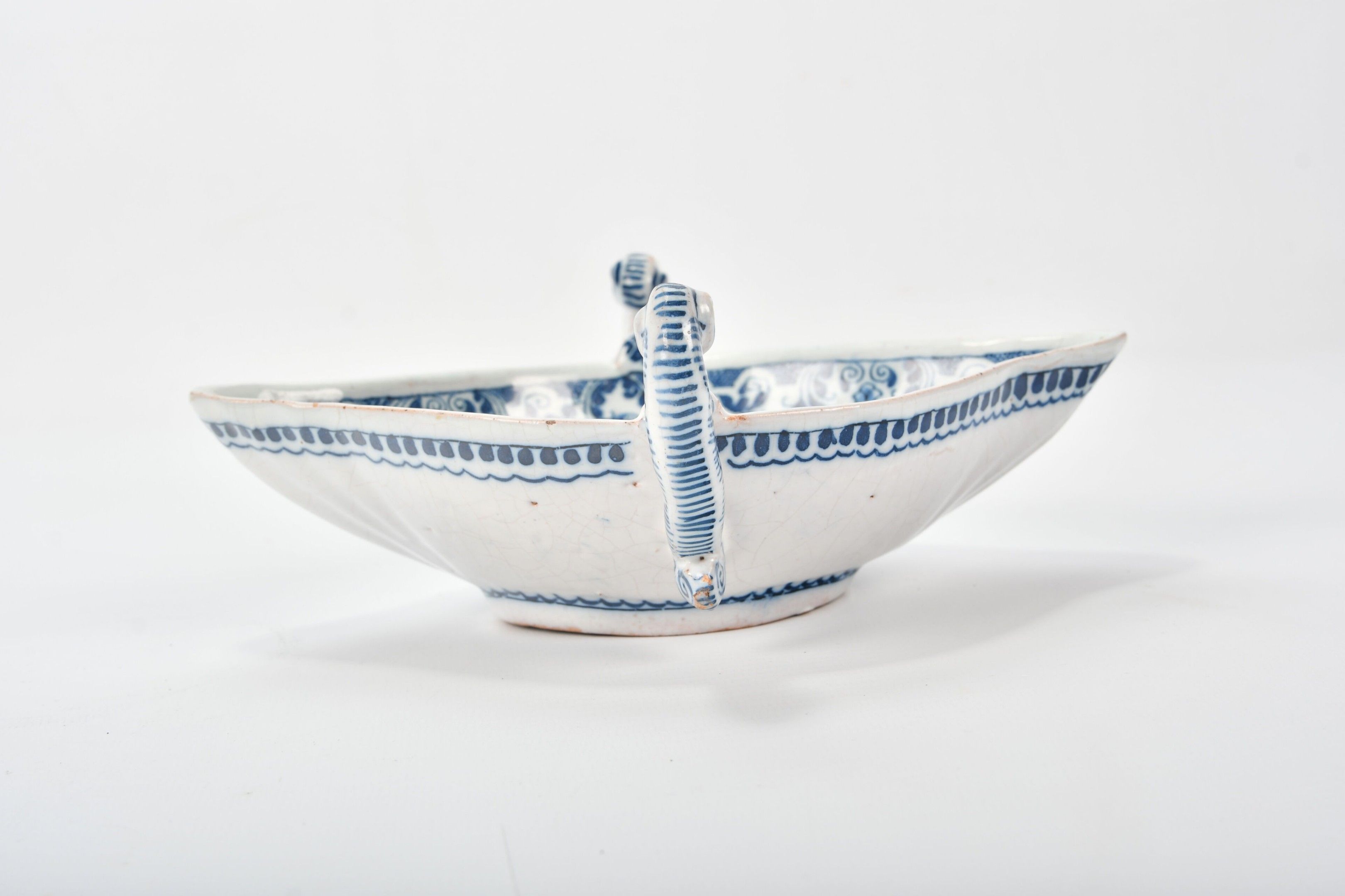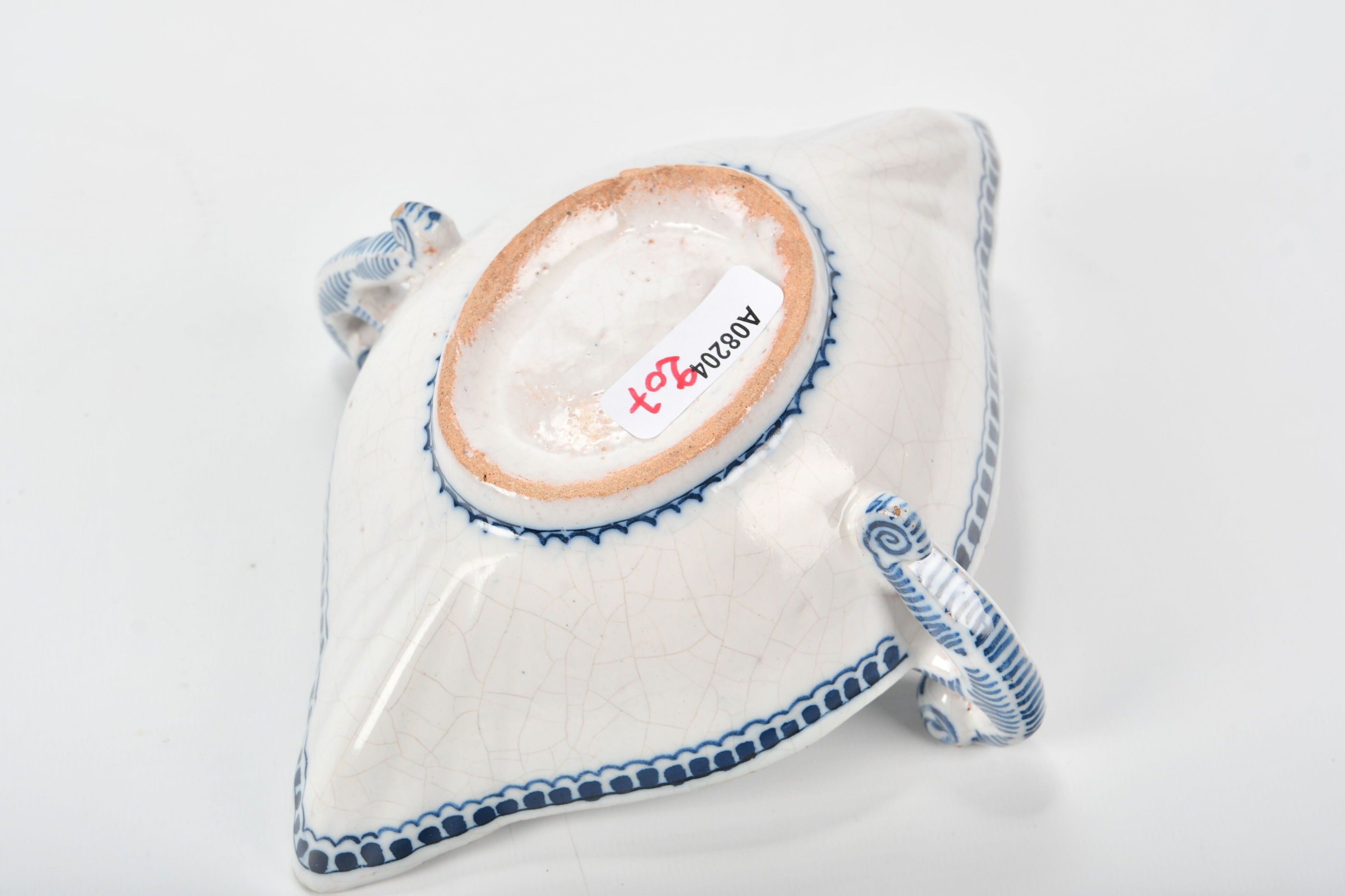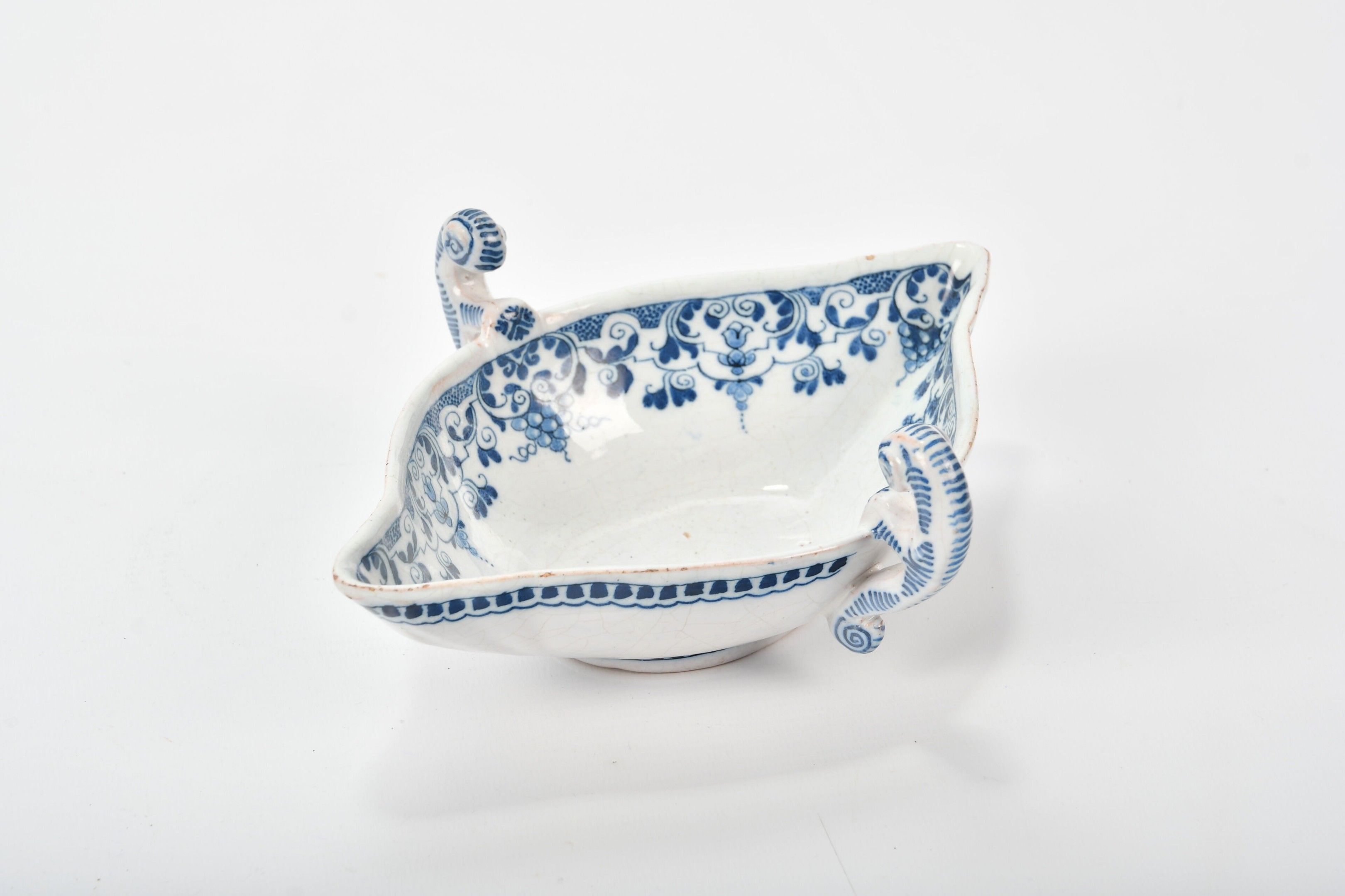 TOULOUSE 18th century. SAUCIERE navette with two handles on a heel in enamelled earthenware with blue monochrome decoration of a frieze of lambrequins. H. 7.5 - W. 21 - D. 17.5 cm. Minor chips and cracks to the enamel.