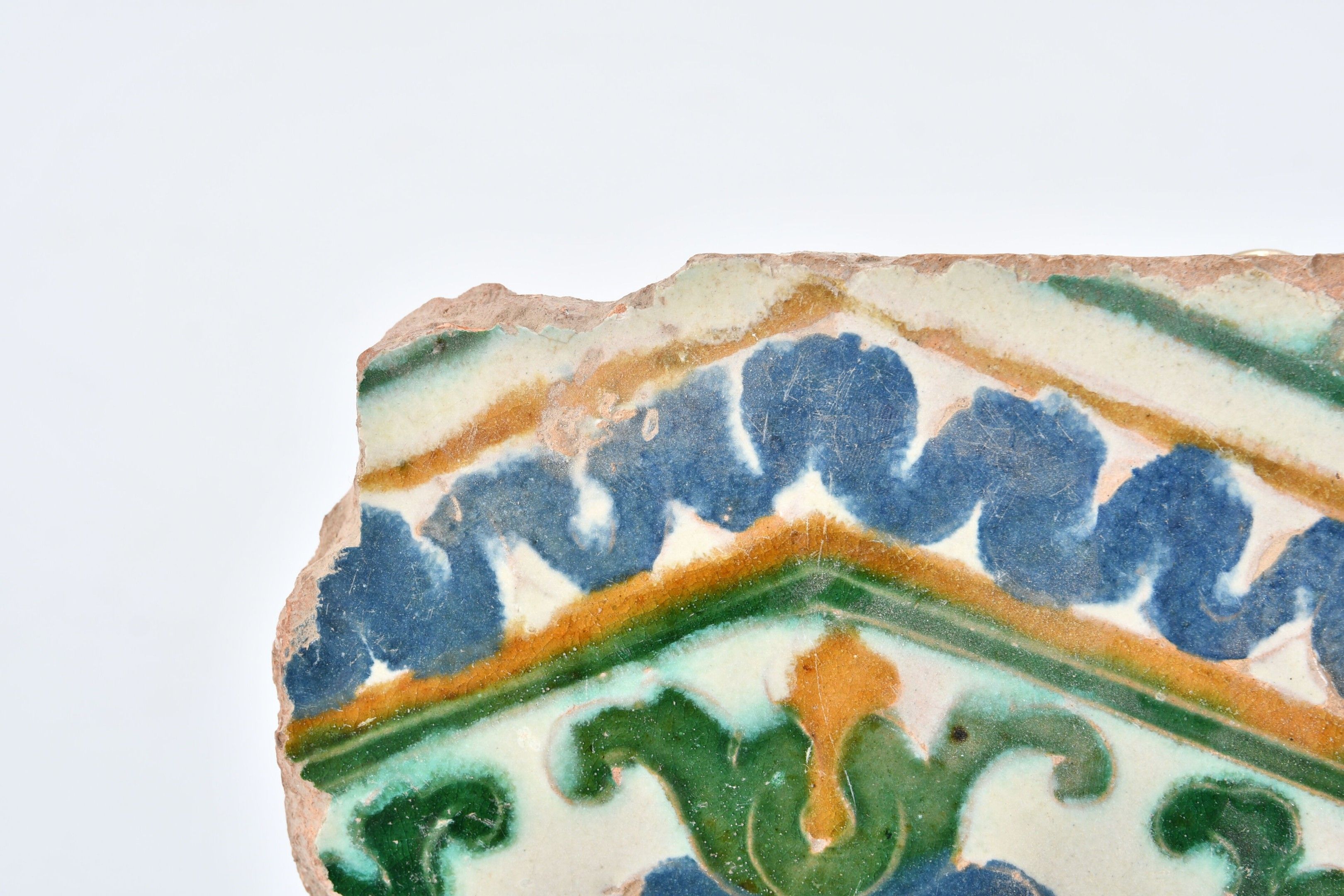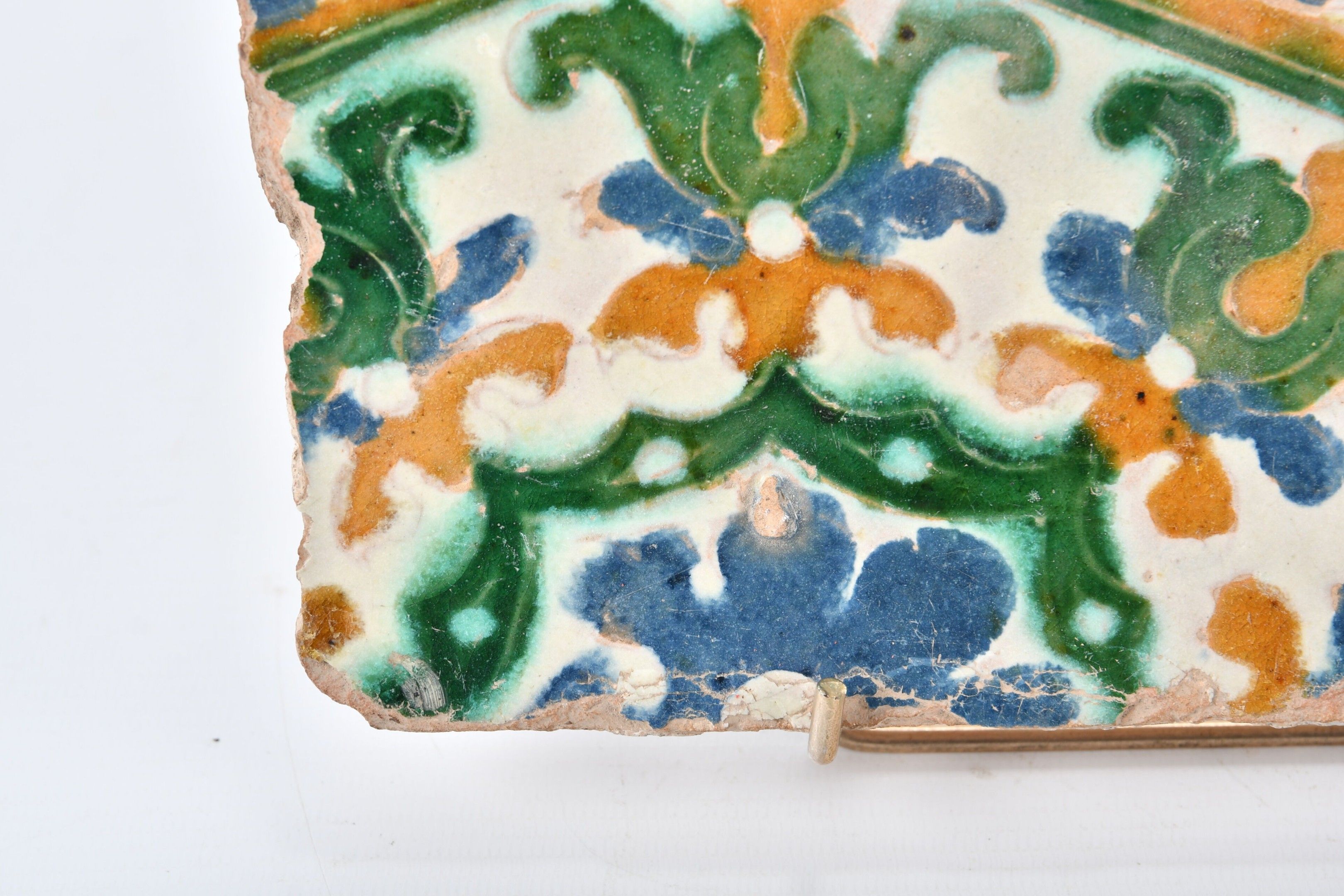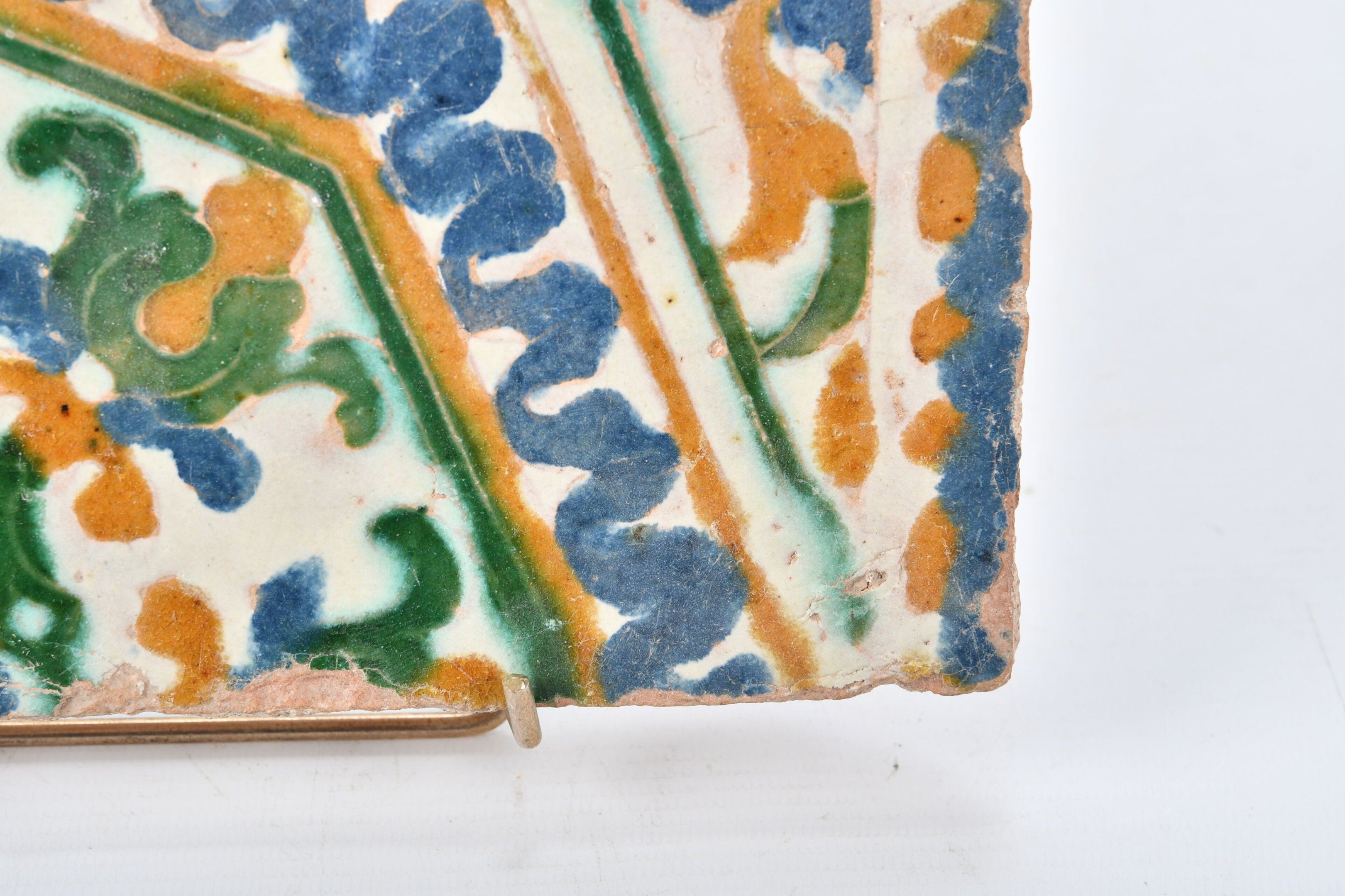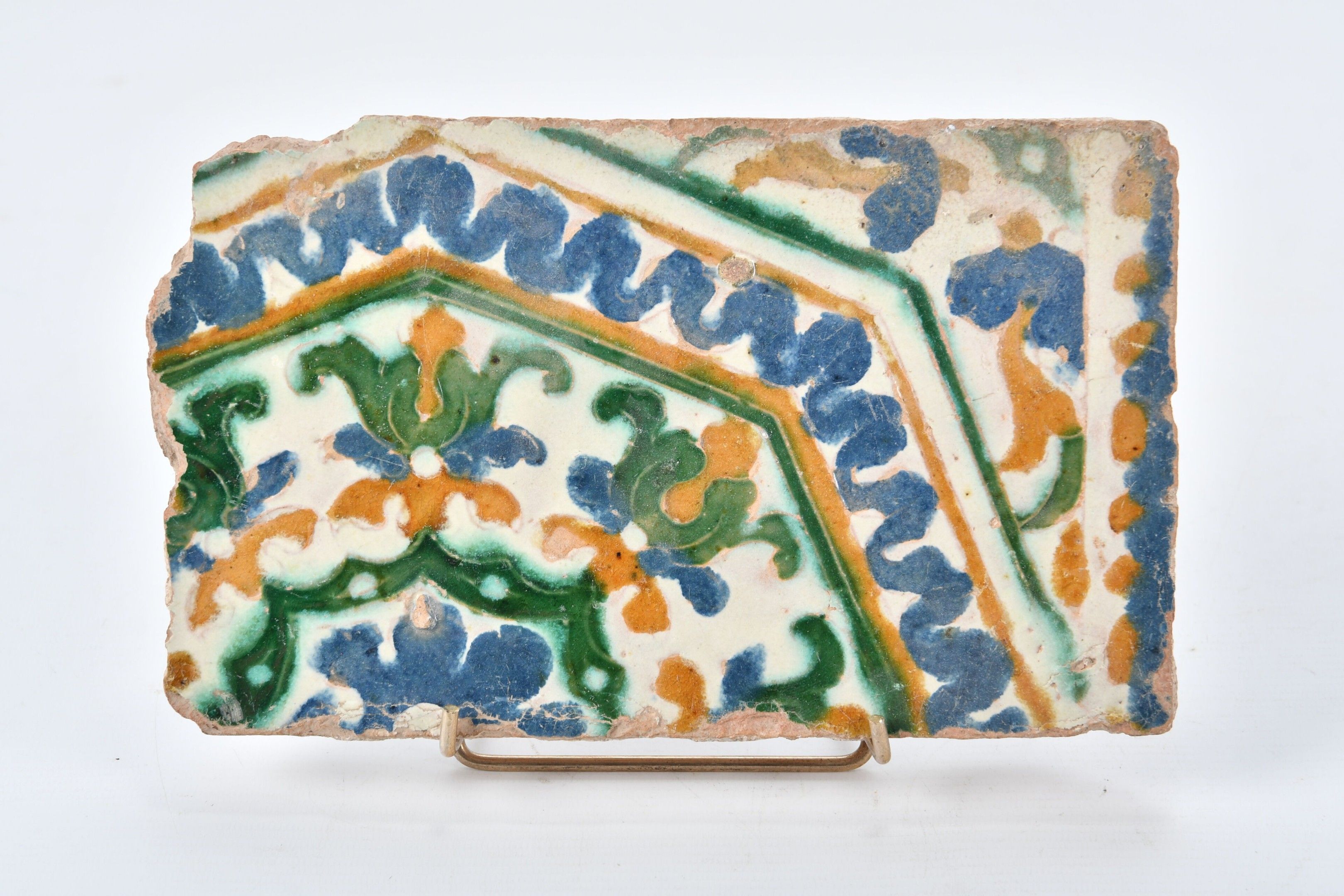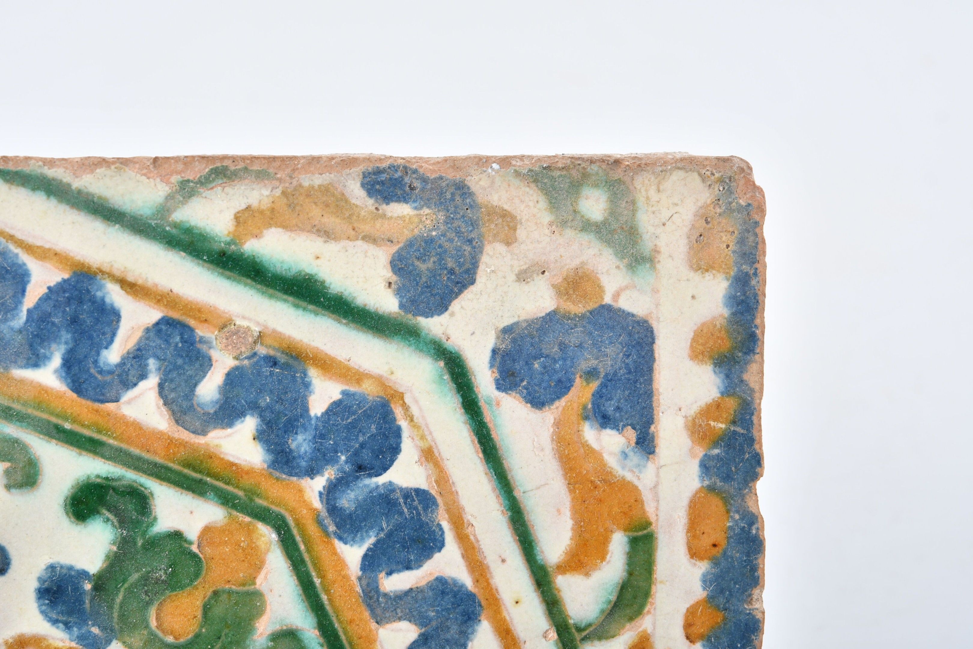SPAIN, Seville, 16th century. Fragment of a Hispano-Moorish polychrome ceramic tile with cuenca e-arista decoration. 24.5 x 15 cm