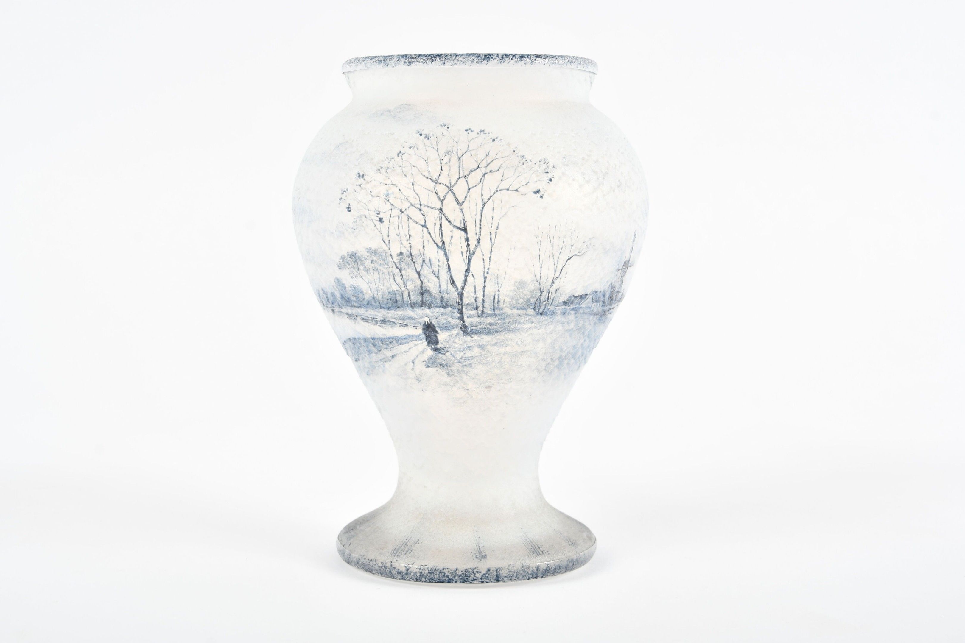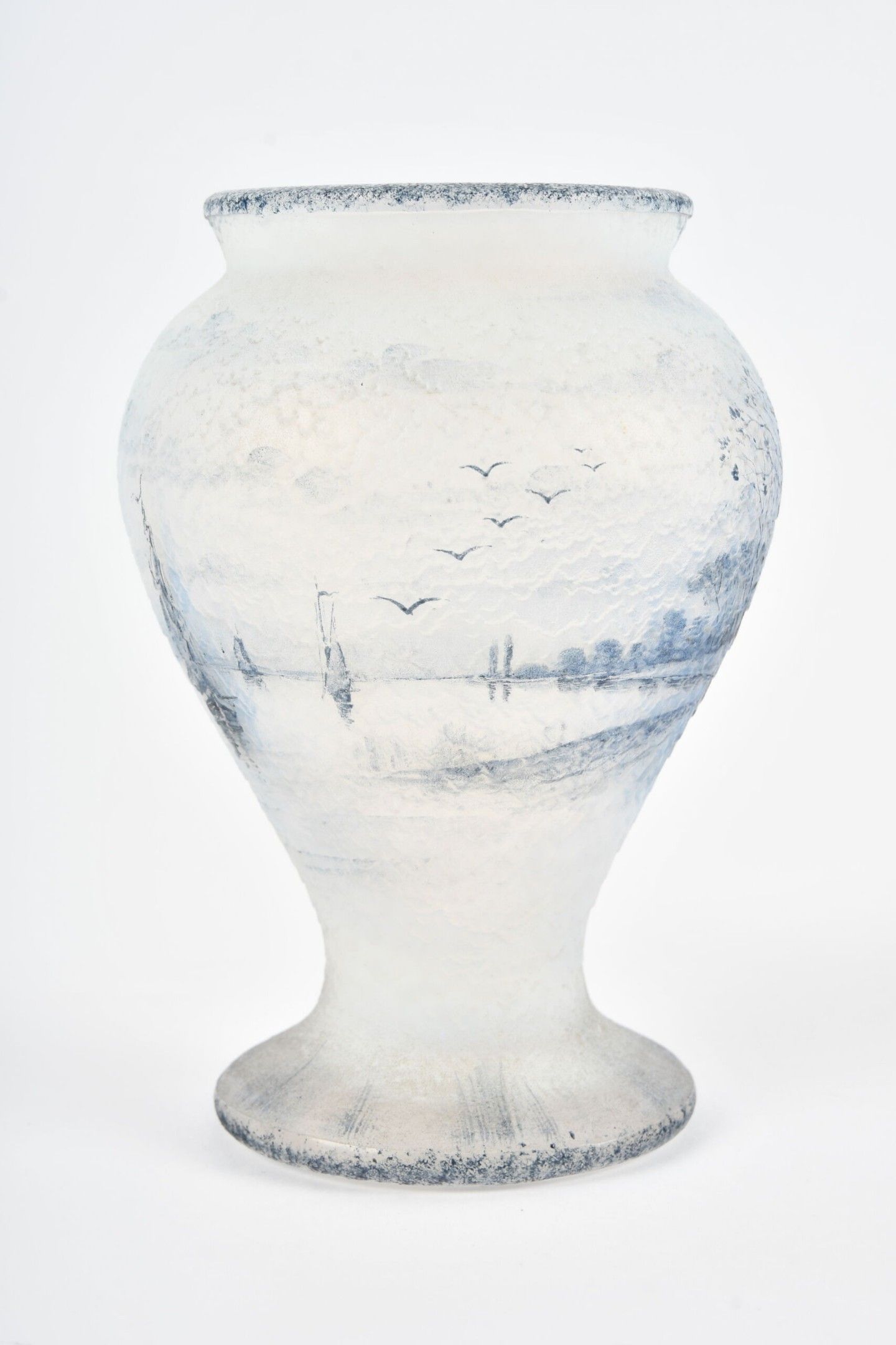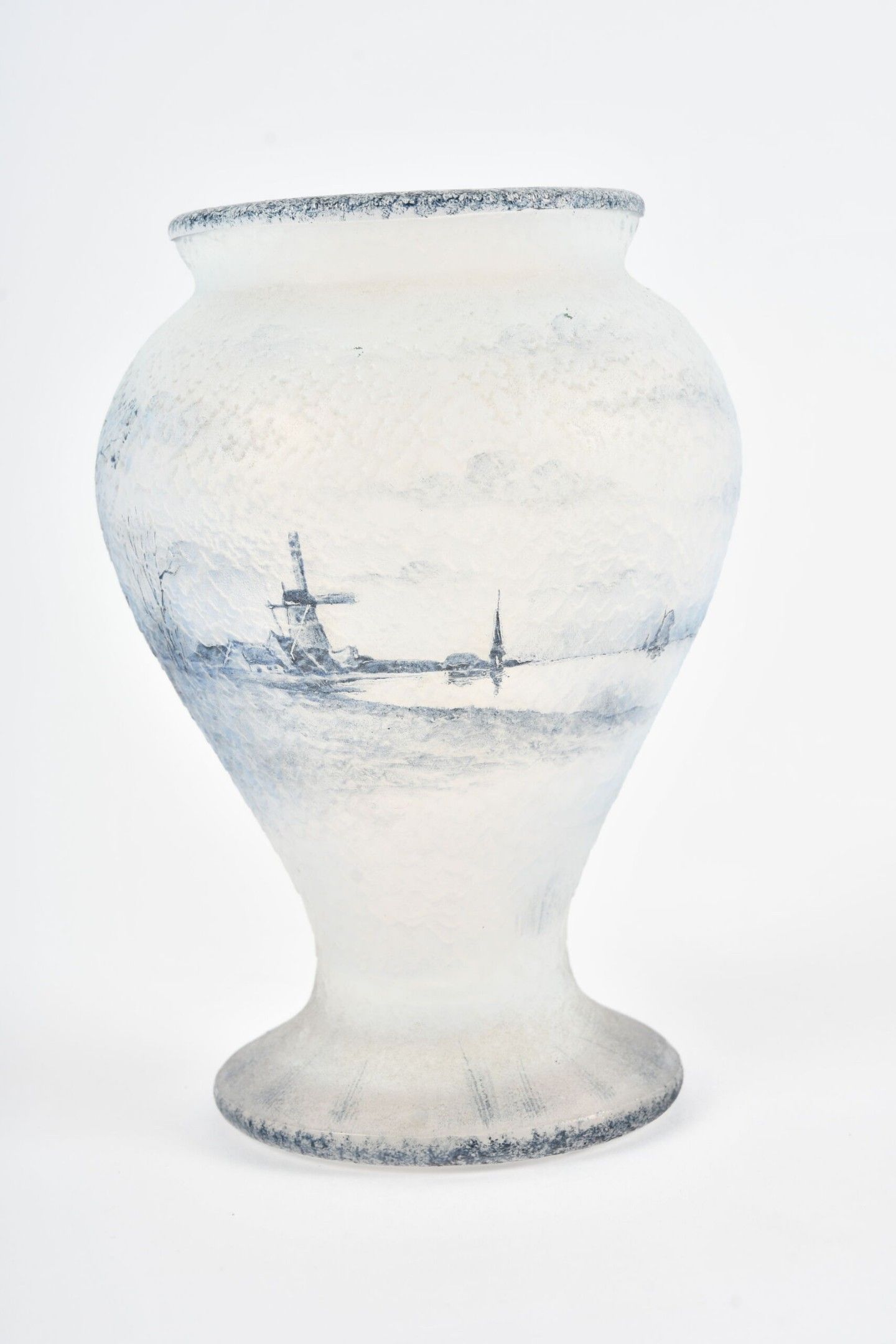 DAUM NANCY. A baluster glass vase with an opaline base and grisaille decoration of a Dutch landscape with a mill and a lively lake. Signed on the reverse. Height 14 cm
