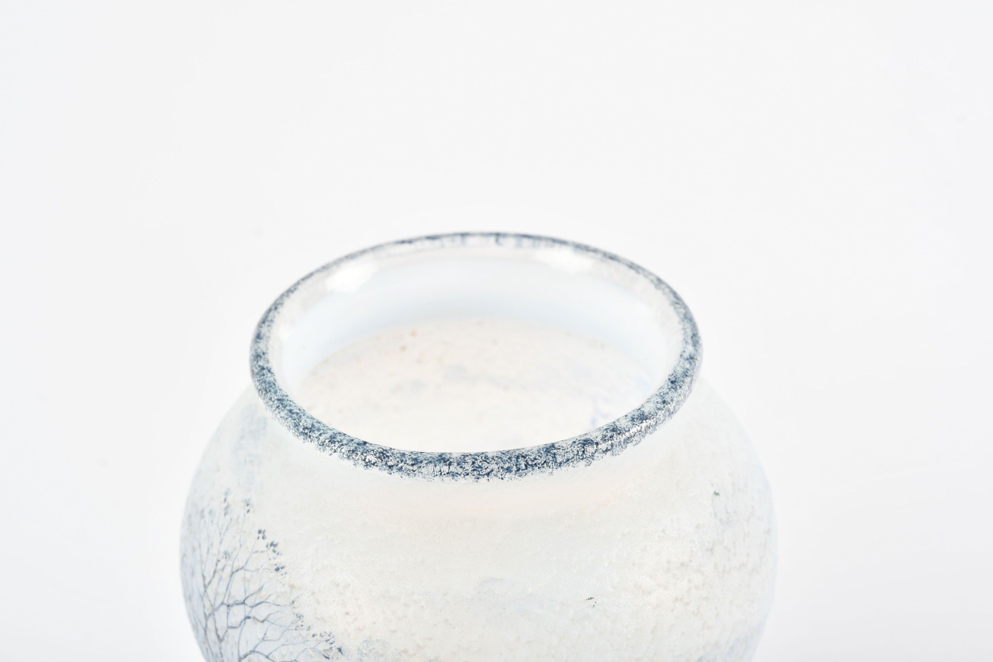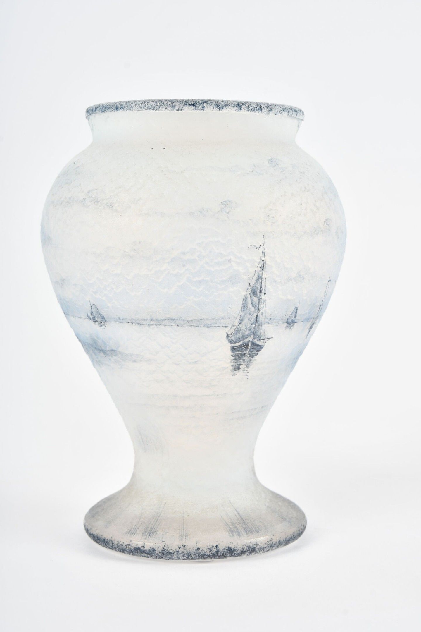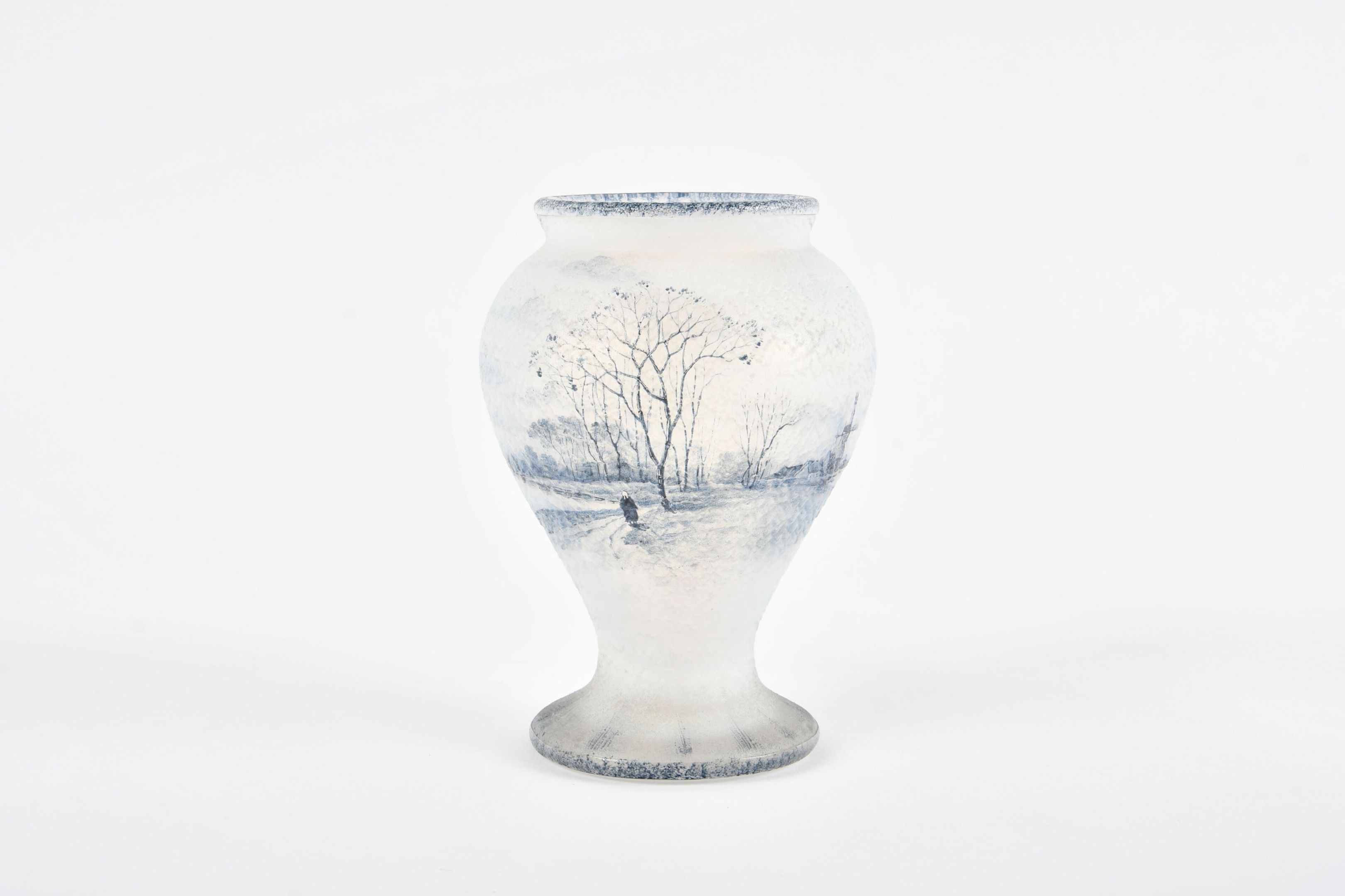 DAUM NANCY. A baluster glass vase with an opaline base and grisaille decoration of a Dutch landscape with a mill and a lively lake. Signed on the reverse. Height 14 cm