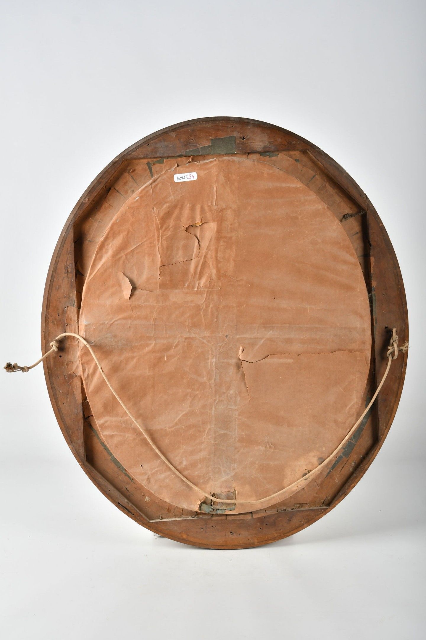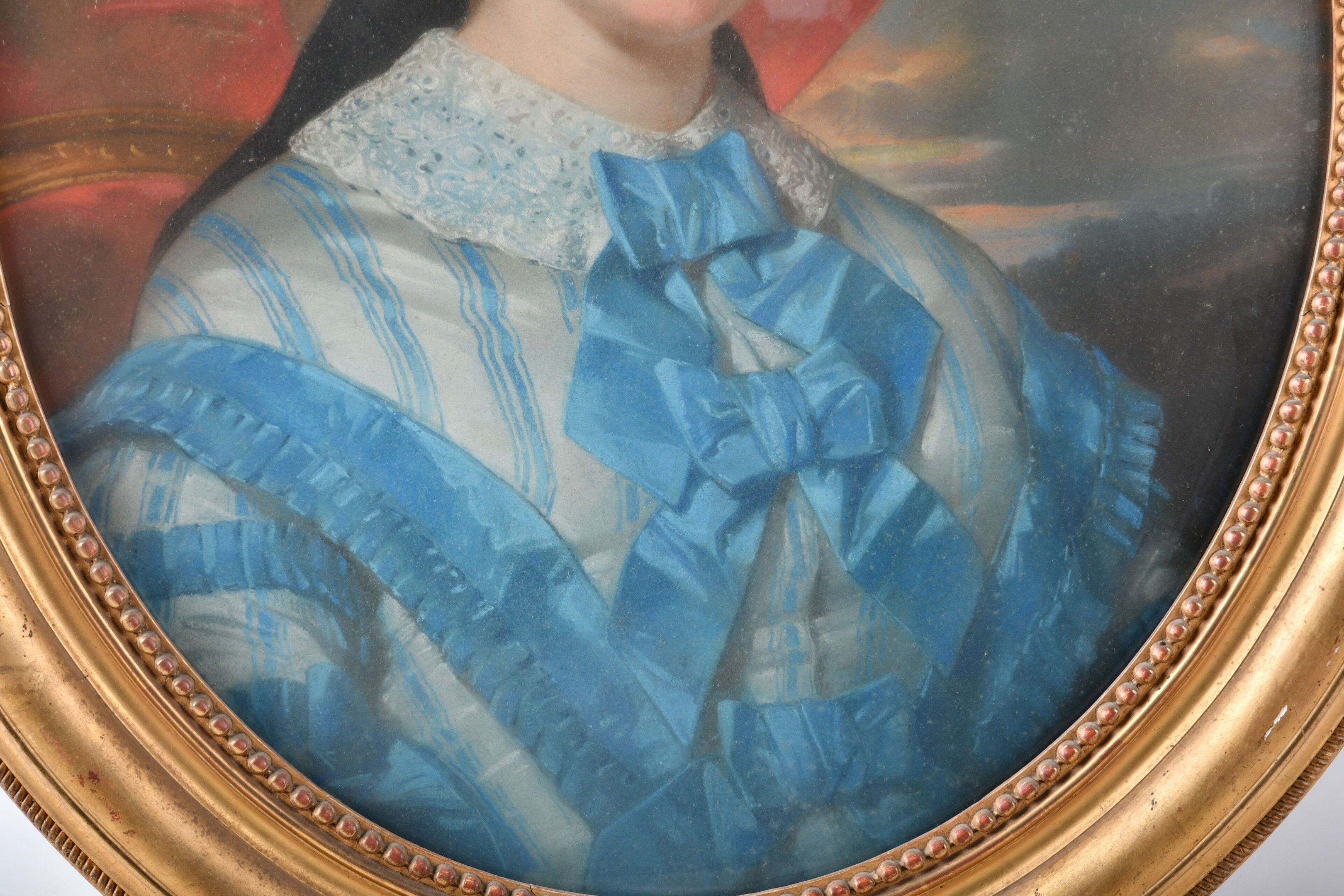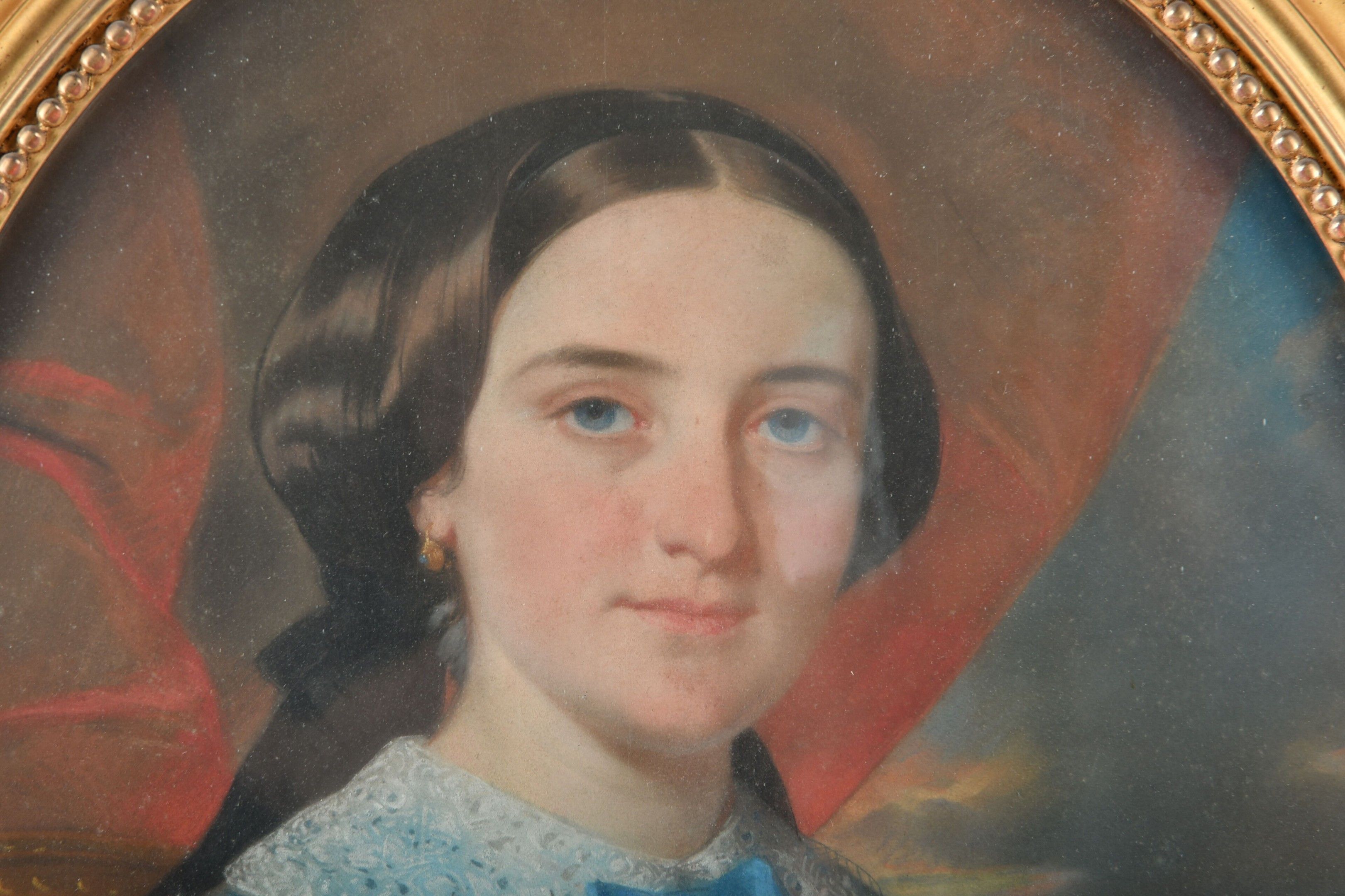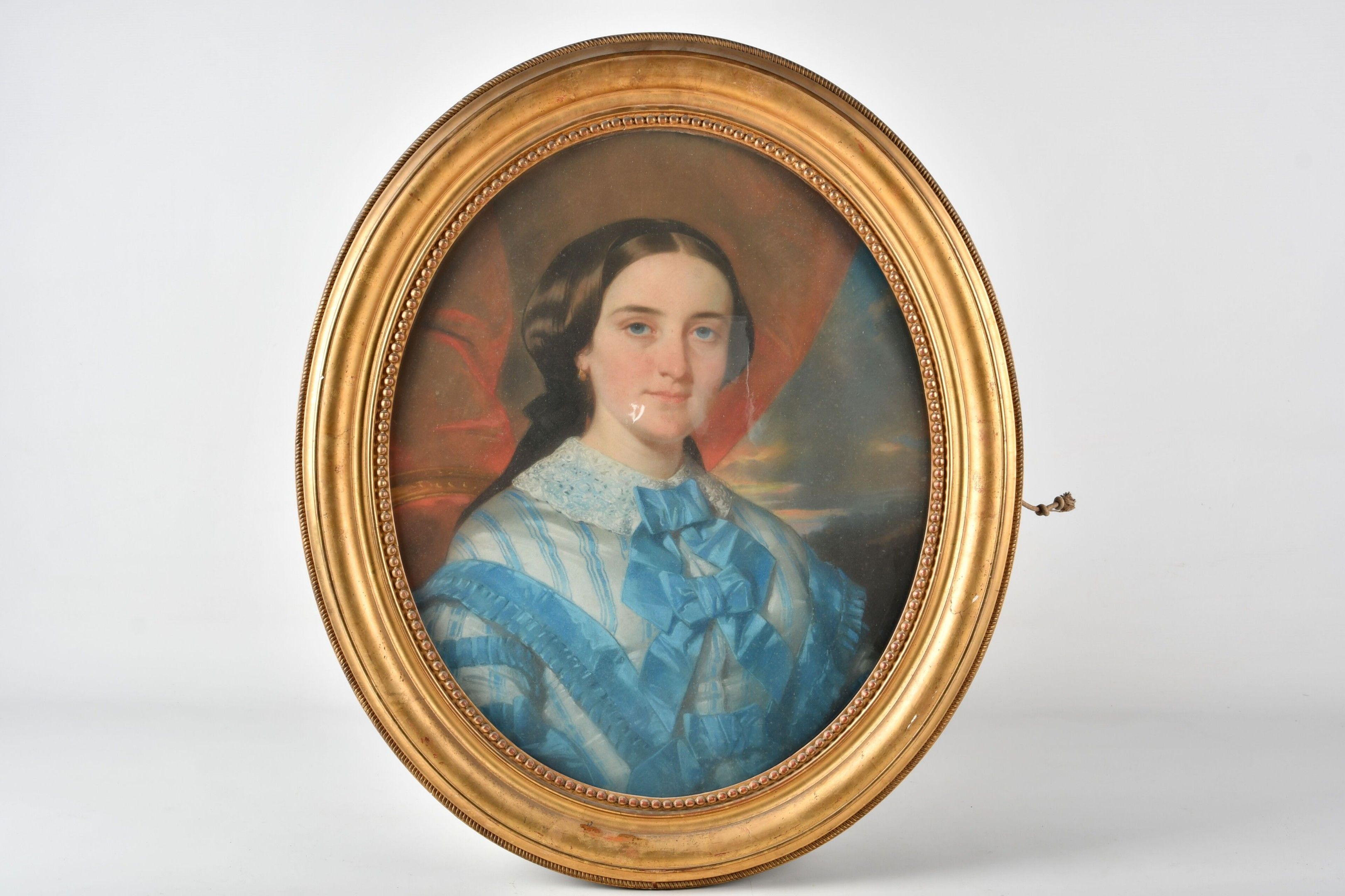 19th century FRENCH SCHOOL. Portrait of a young woman with a blue bow. Pastel in medallion on paper laid down on canvas. Signed lower right Eugène Decrier (?). In an oval wooden frame with gilt composition. 58 x 46 cm. Minor damage to the frame