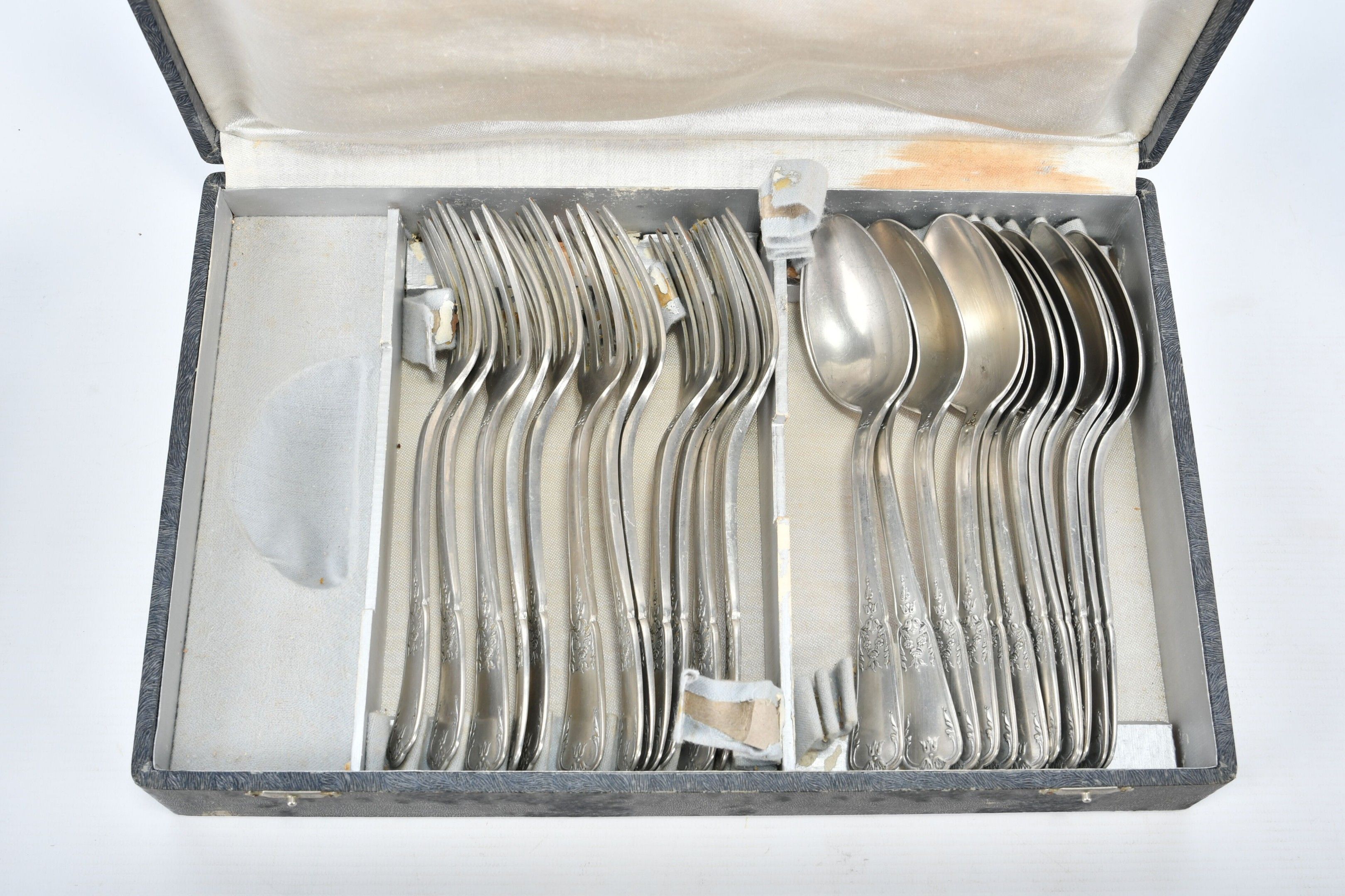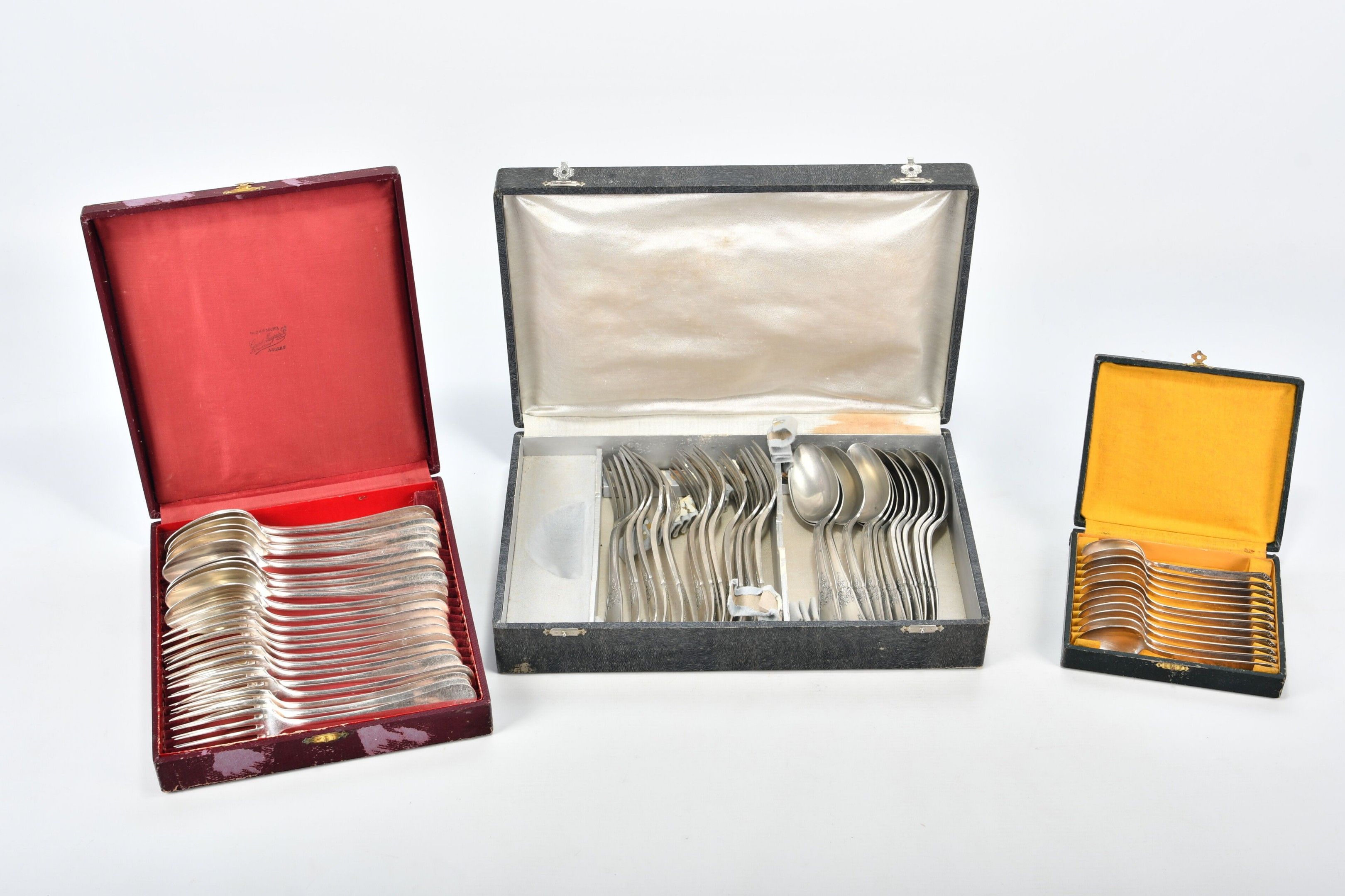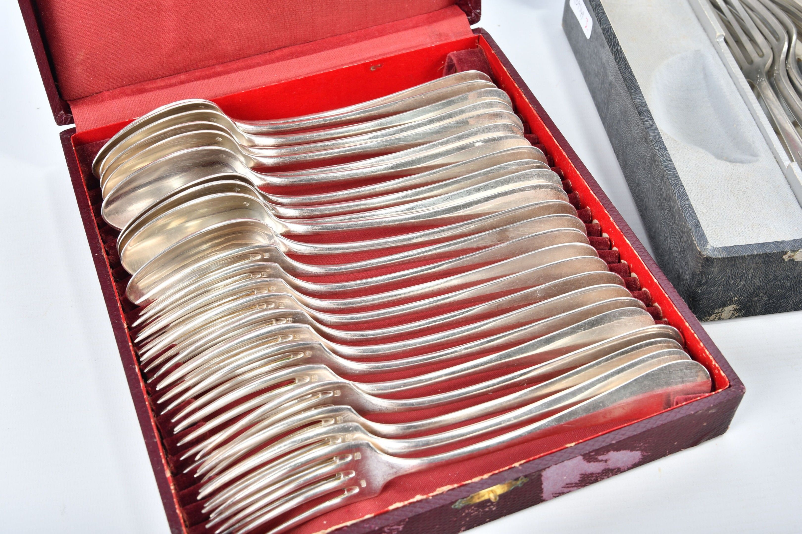 SILVER METAL (lot of) comprising: twelve large spatulated pattern cutlery sets; twelve Art Deco teaspoons and twelve large leafy white metal cutlery sets.