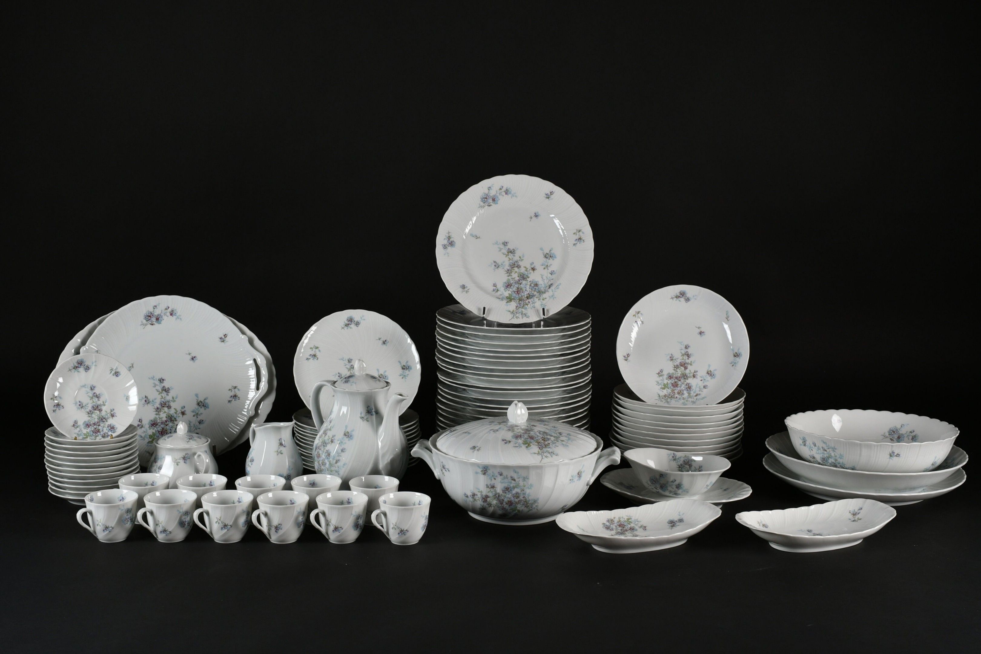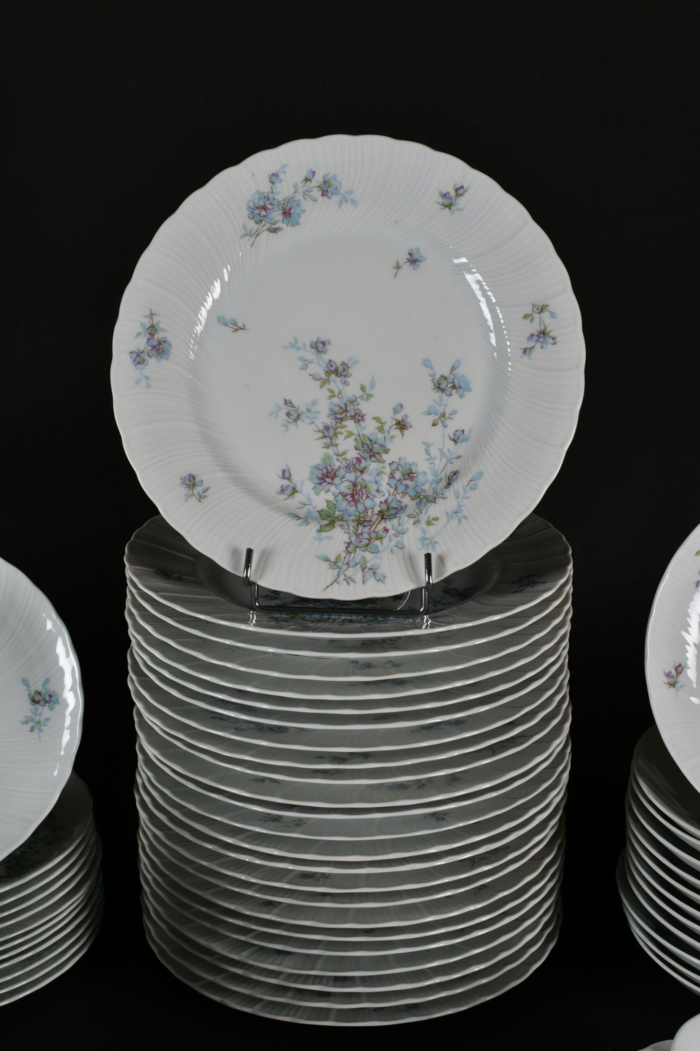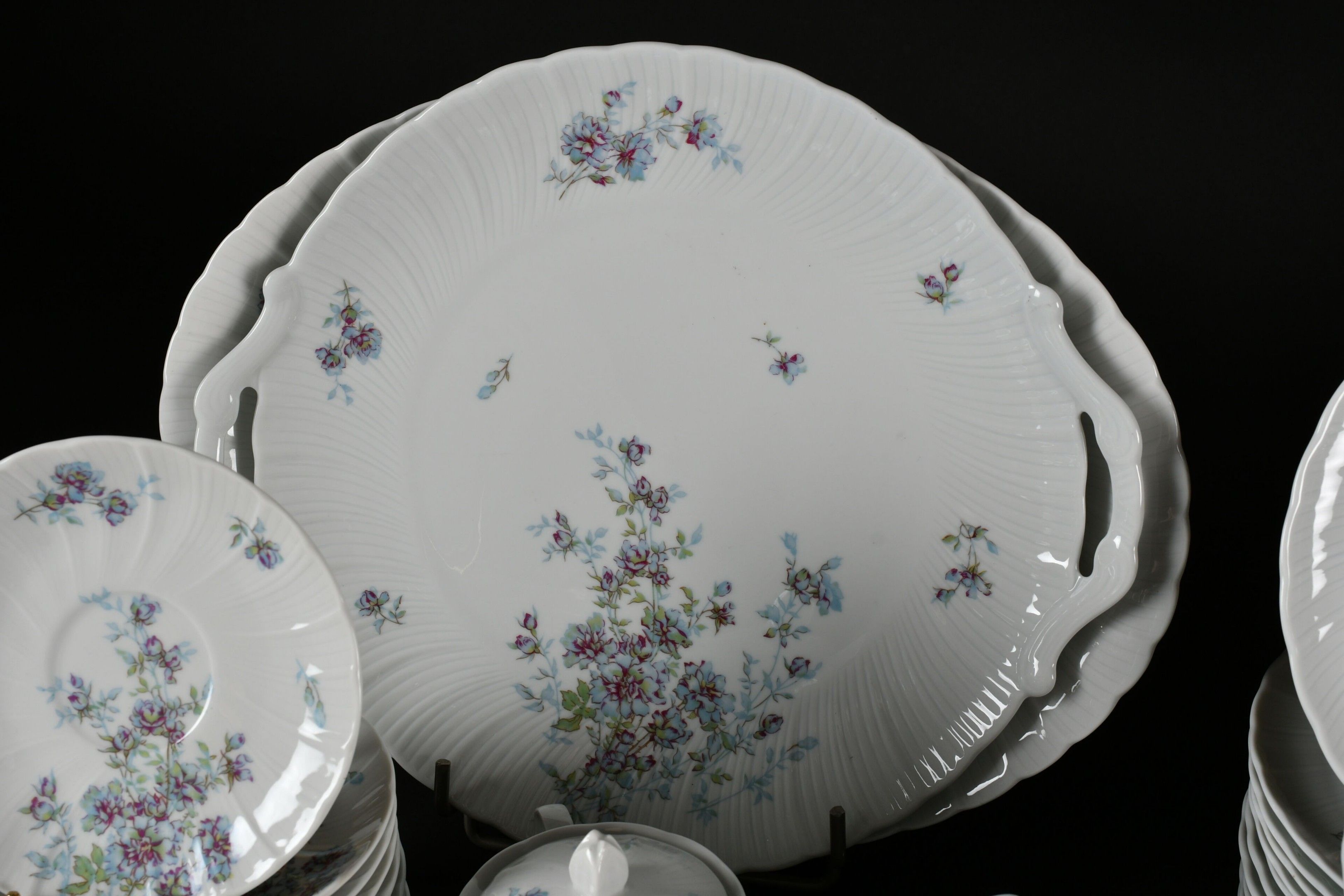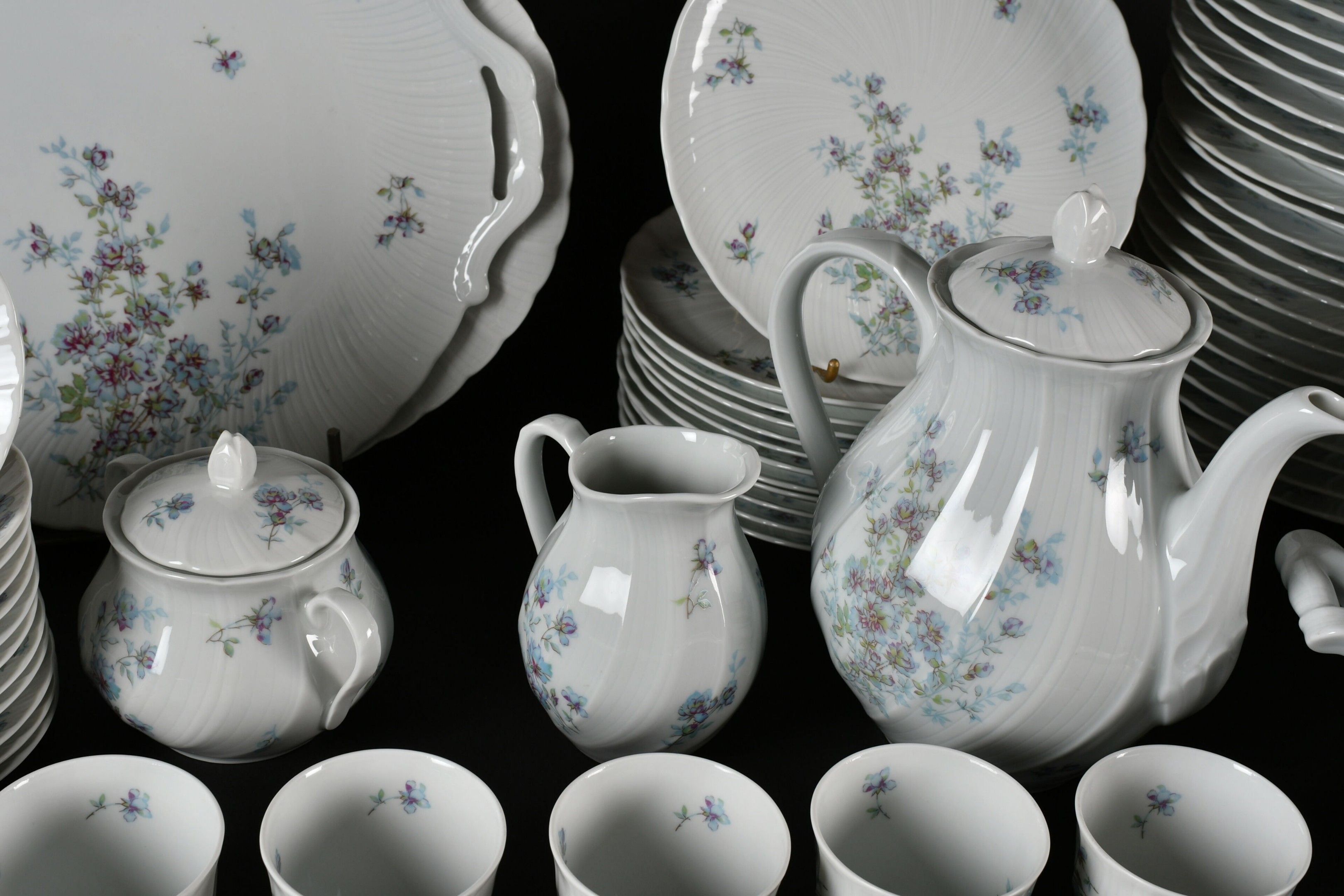 BERNARDAUD Limoges white porcelain service set, "Gabrielle" model, decorated with polychrome flowering branches. Comprising: 24 large dinner plates; 12 soup plates; 12 dessert plates; two ravioli dishes; a sauceboat; a covered vegetable dish; a salad bowl; two round and deep dishes; an oval dish; a cake dish; 11 cups and 12 saucers; a teapot; a milk jug and a covered sugar bowl. Lot sold on re-bidding